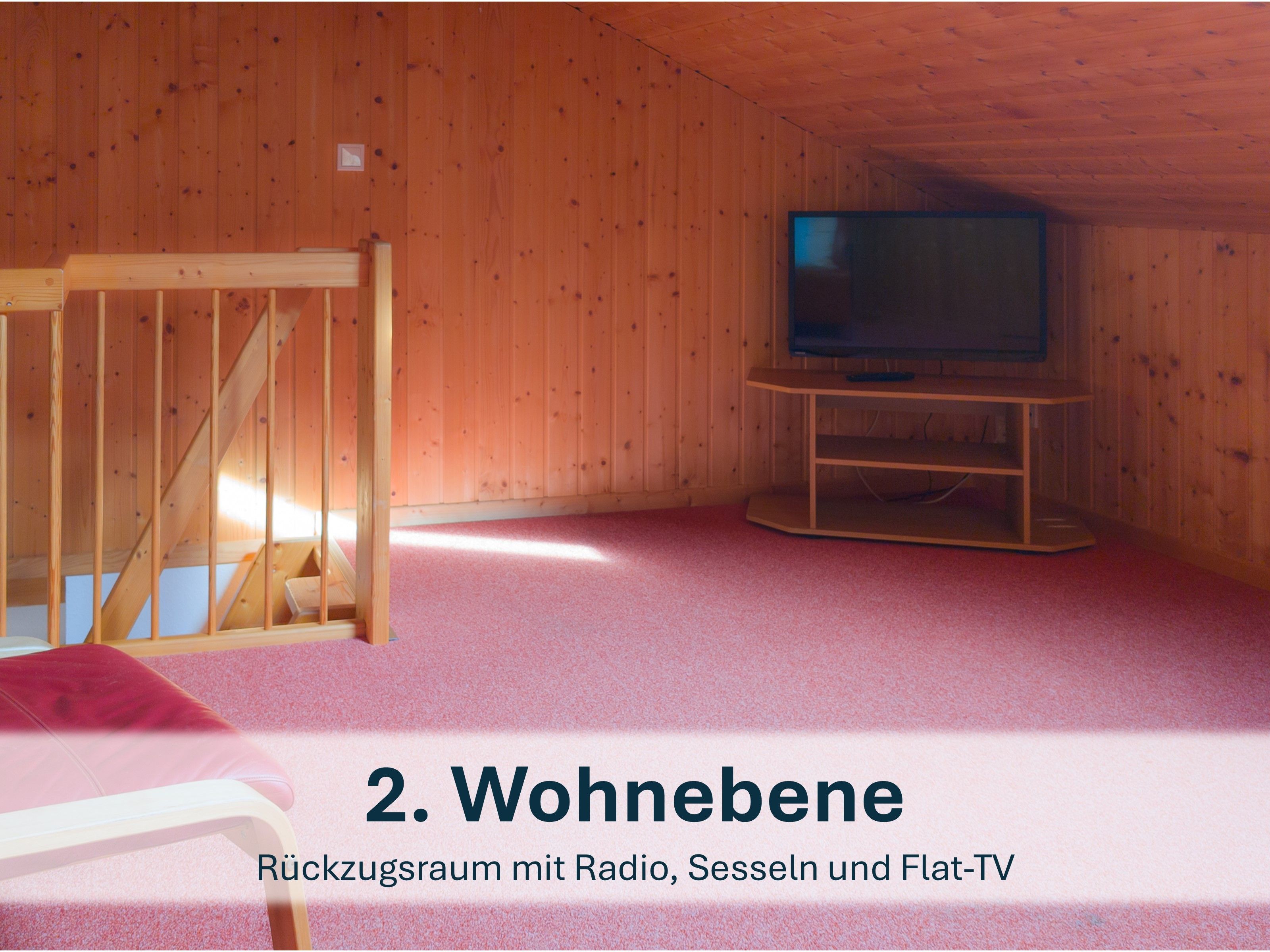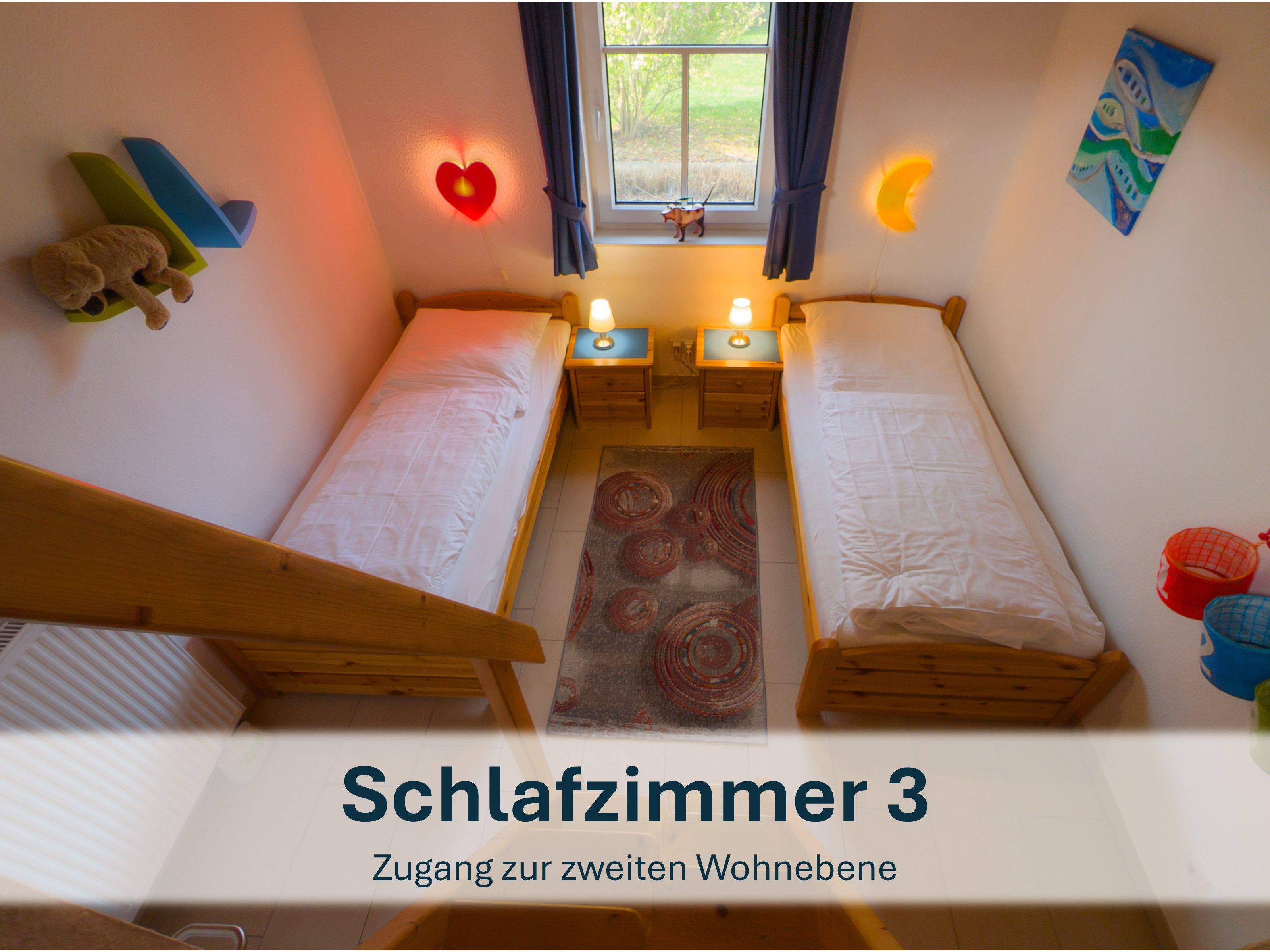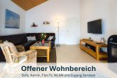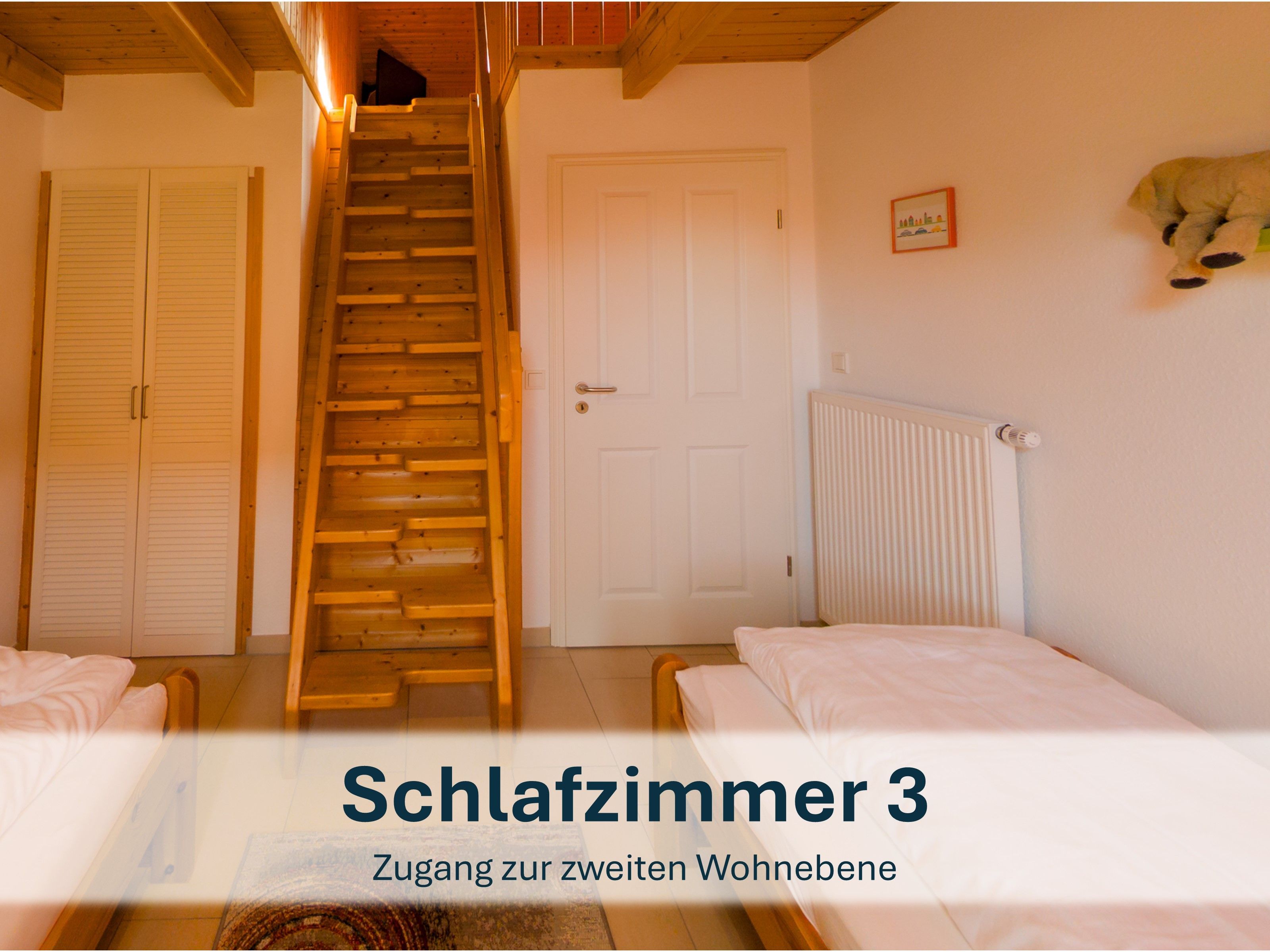 Großzügig geschnittener Bungalow für  max. 6 Personen (zzgl. einem Kleinkind). Gemütlicher Wohnraum mit Kaminofen, eine gut ausgestattete Küche mit Essbereich sowie 2 Bäder mit Dusche und WC und 3 Schlafräume (einmal mit Doppelbett, zweimal mit zwei Einzelbetten). Von einem der drei Schlafzimmer führt eine Holztreppe zur 2. Wohnebene auf eine Empore mit einem zweiten Fernseher - ein eigenes kleines Reich für kleine und große Kinder!