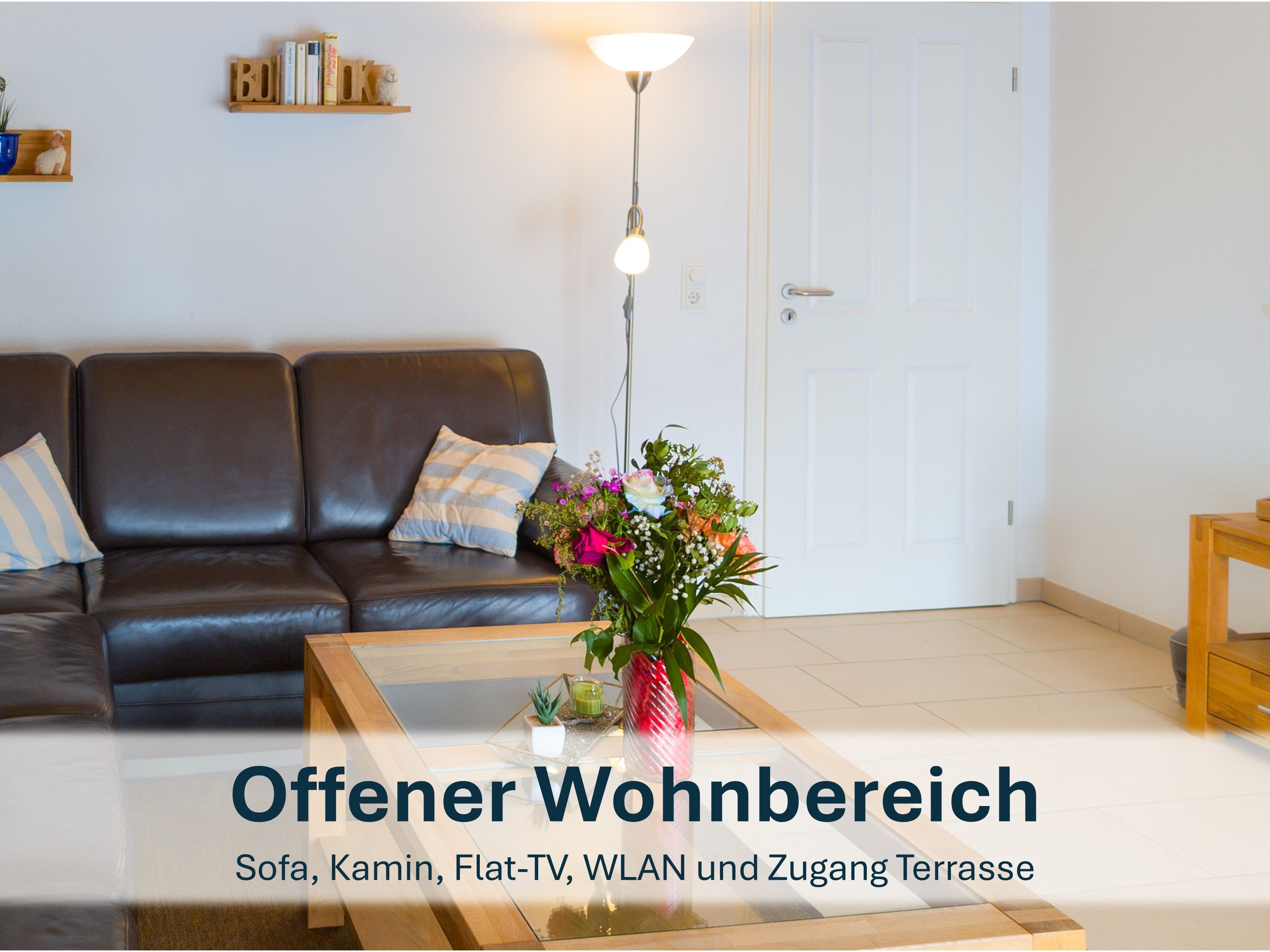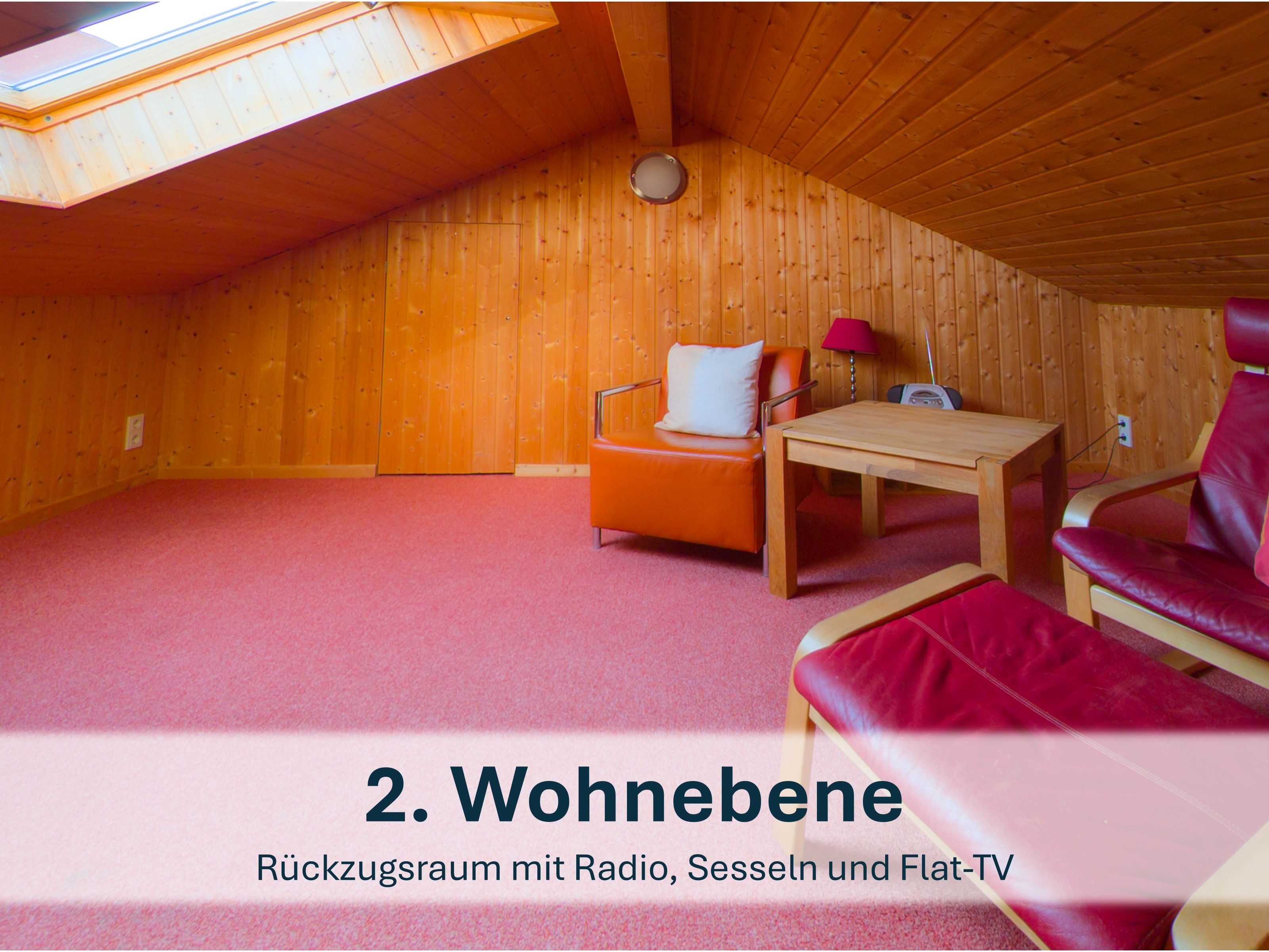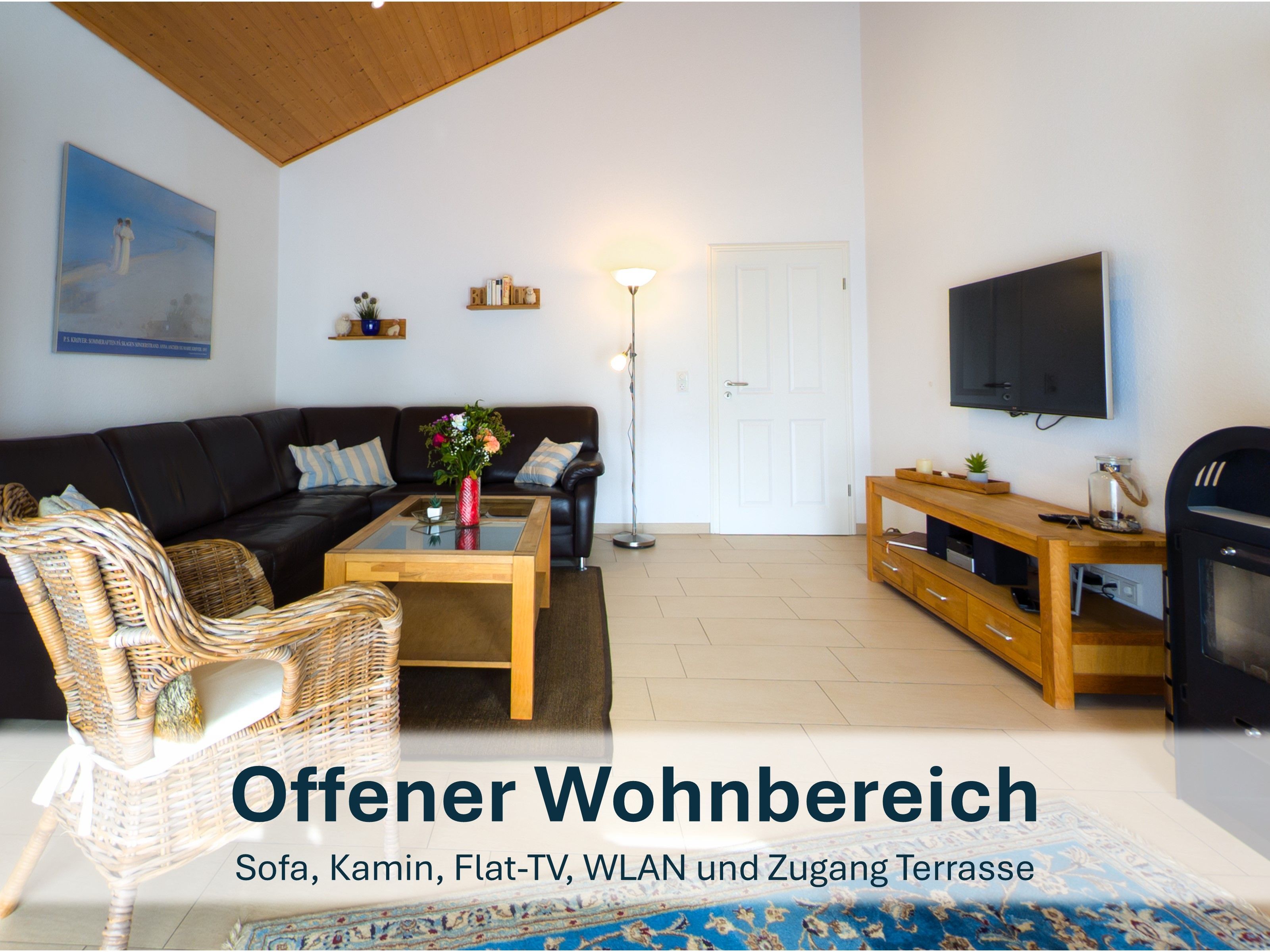 Großzügig geschnittener Bungalow für  max. 6 Personen (zzgl. einem Kleinkind). Gemütlicher Wohnraum mit Kaminofen, eine gut ausgestattete Küche mit Essbereich sowie 2 Bäder mit Dusche und WC und 3 Schlafräume (einmal mit Doppelbett, zweimal mit zwei Einzelbetten). Von einem der drei Schlafzimmer führt eine Holztreppe zur 2. Wohnebene auf eine Empore mit einem zweiten Fernseher - ein eigenes kleines Reich für kleine und große Kinder!