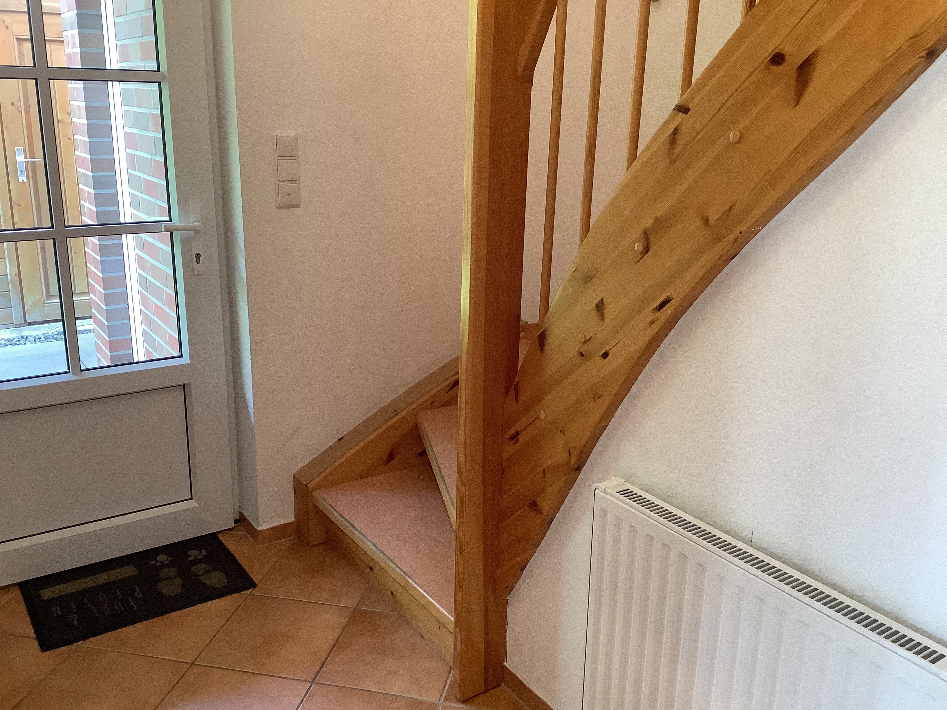 Das Erdgeschoss ist gefliest, das Obergeschoss ist mit Teppichboden ausgestattet.
