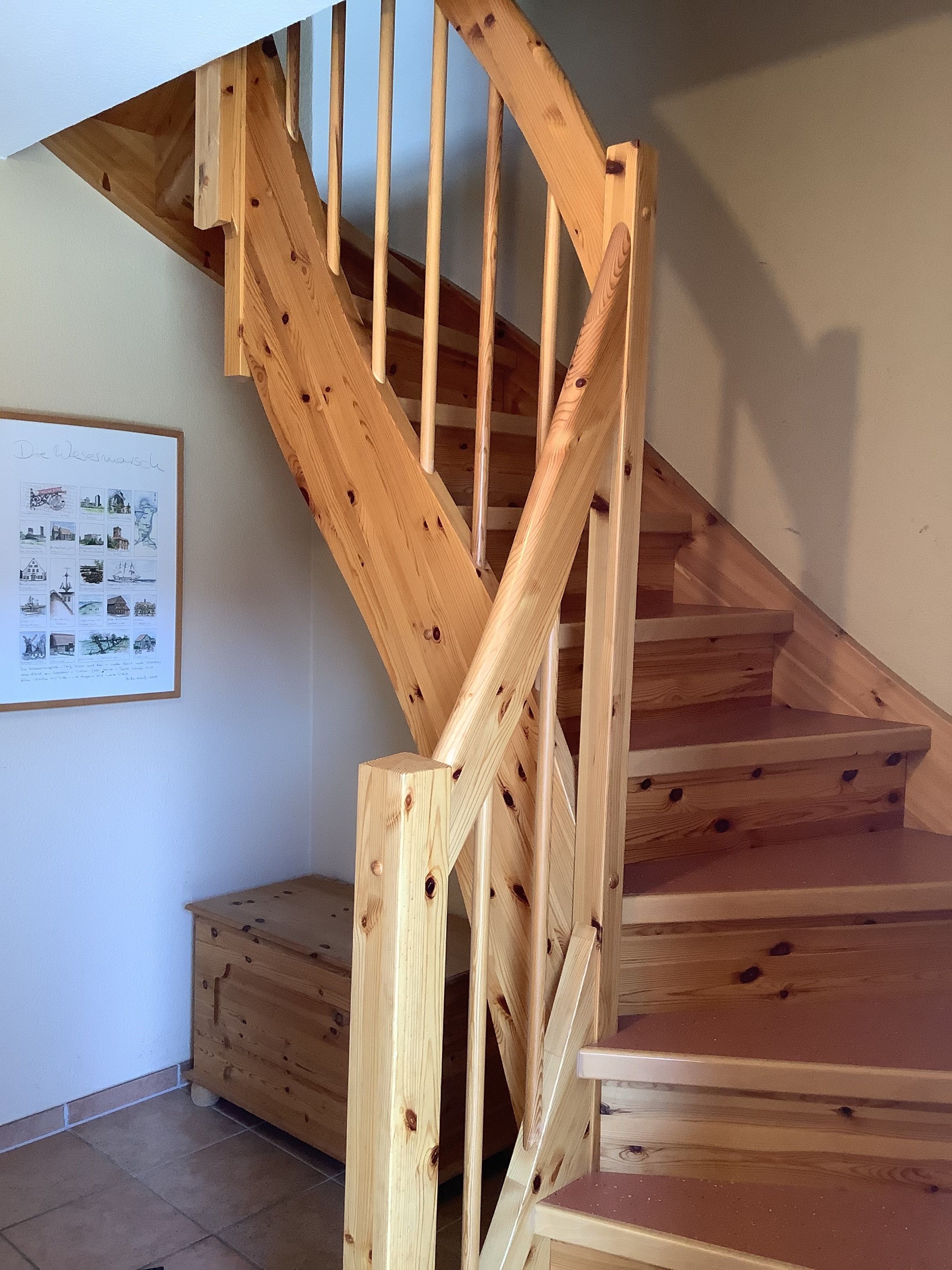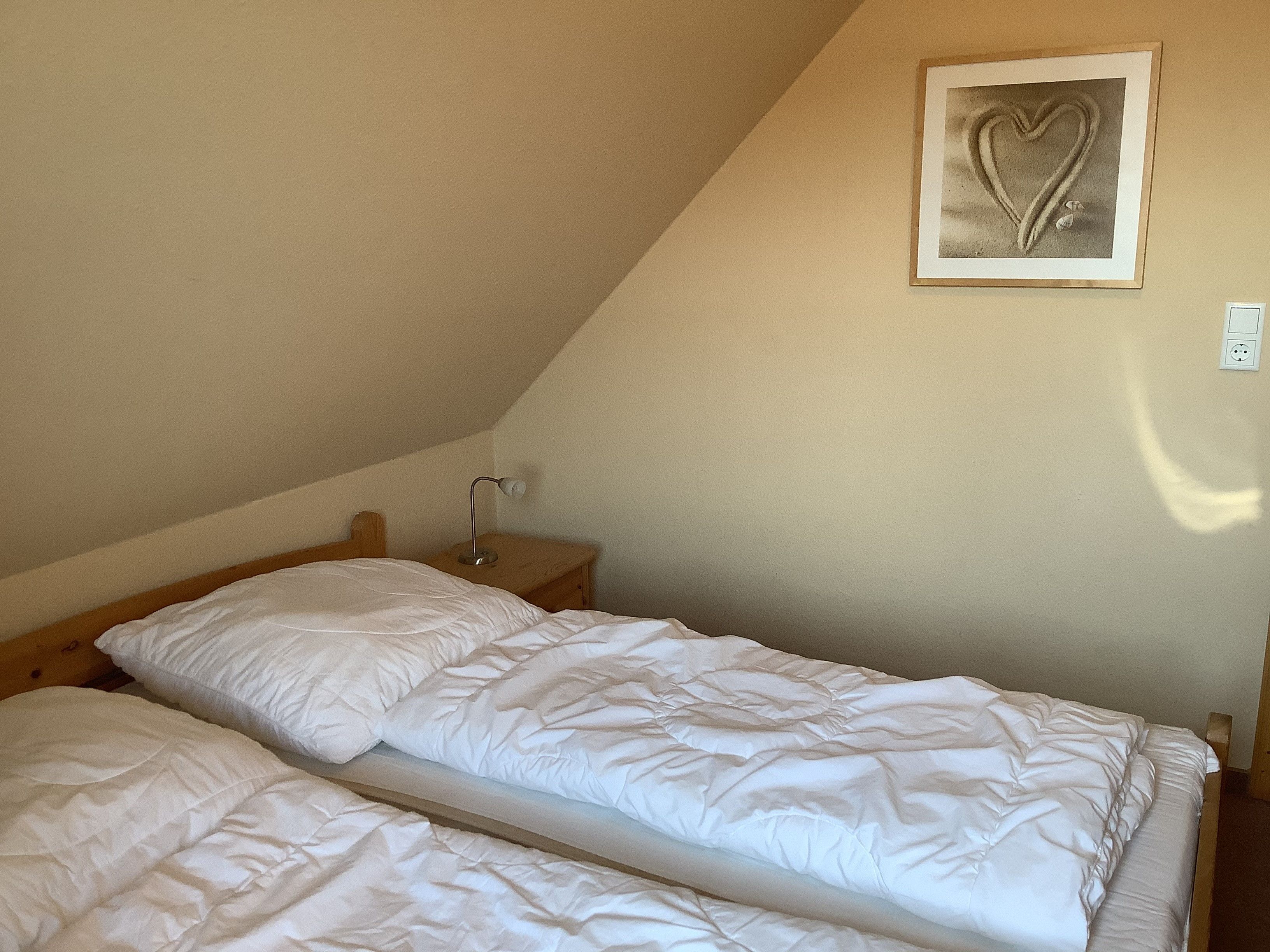 Die Schlafräume finden sich im Oberschoß. Das erste Schlafzimmer verfügt über ein Doppelbett. Im 2. Schlaffzimmer stehen 2 Einzelbetten. Der 3. Schlafraum weist 1 Einzelbett auf. Des Weiteren finden Sie hier oben ein zweites Bad mit Dusche und WC.