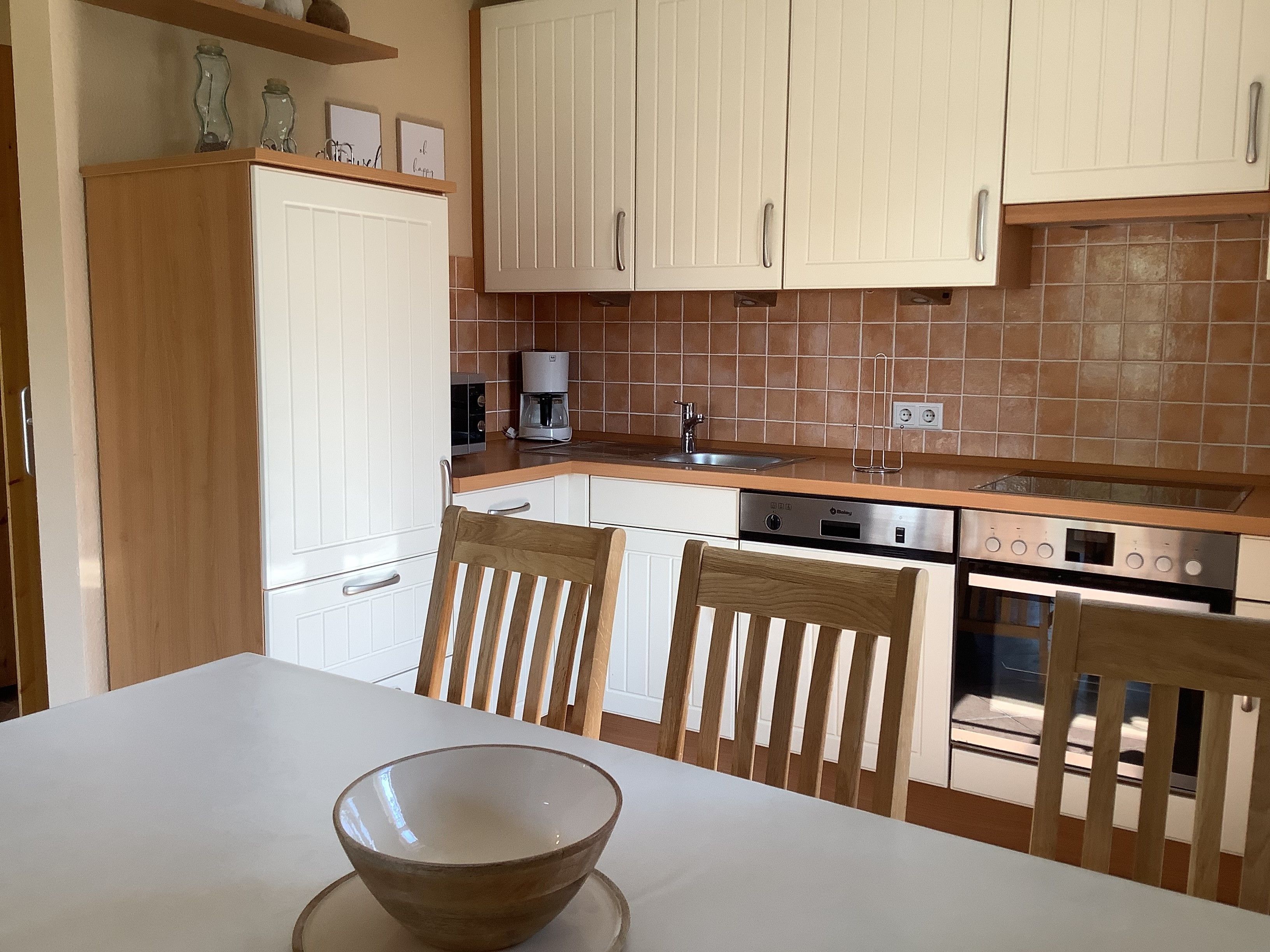 Im Erdgeschoß findet sich der großzügige Wohnraum mit gemütlicher Sitzecke und Flat-TV. Daran angeschlossen folgt die offene Küche mit Essbereich. Außerdem finden Sie hier ein Duschbad mit WC.