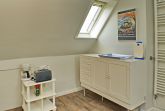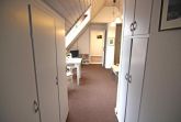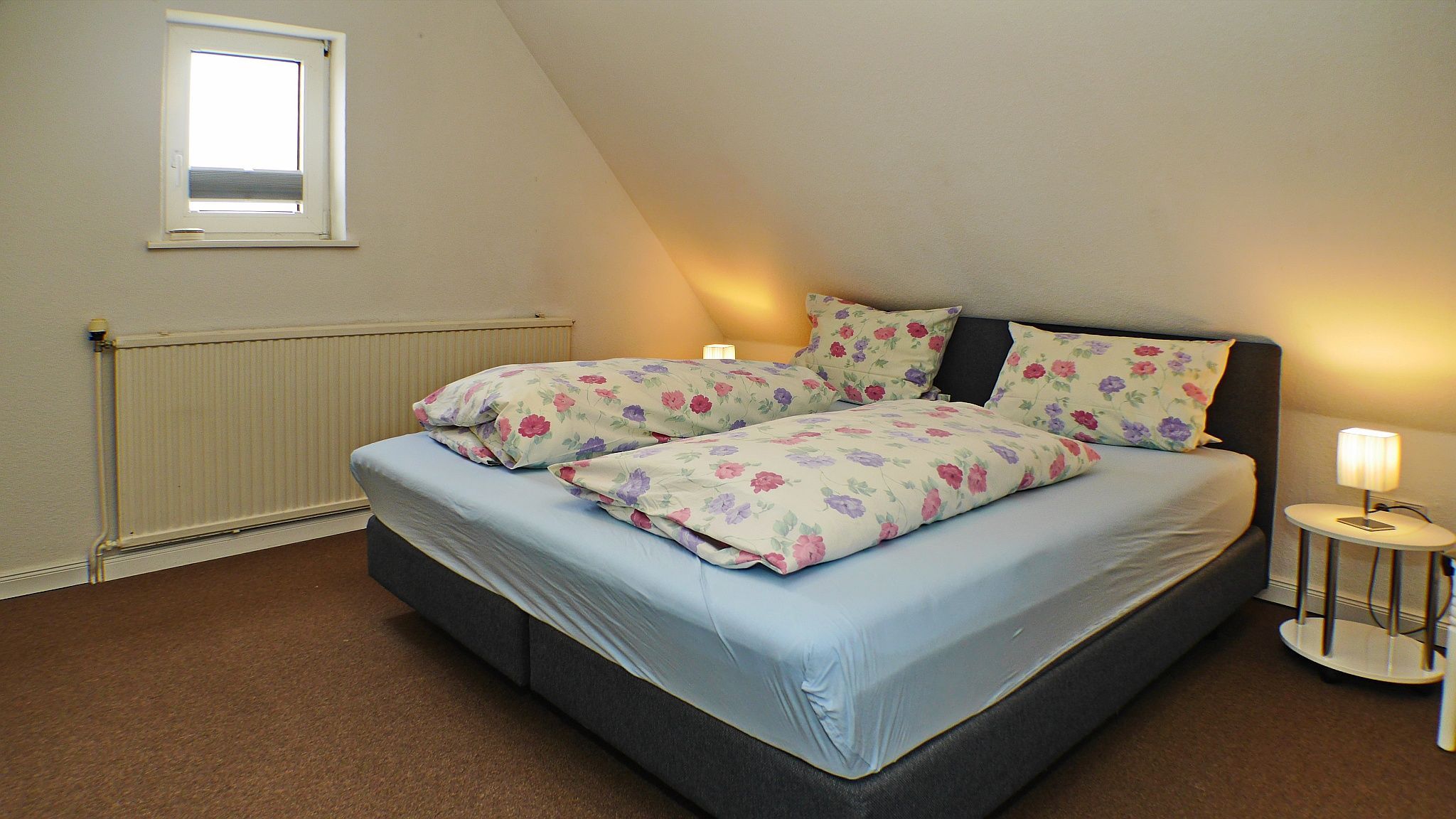 Ein gemütliches Schlafzimmer bietet ein Doppelboxspringbett (180x200) mit offenem Fußende, Nachtisch, Leselampen und einem Einbaukleiderschrank alles, was ein entspannter Sylturlaub benötigt.