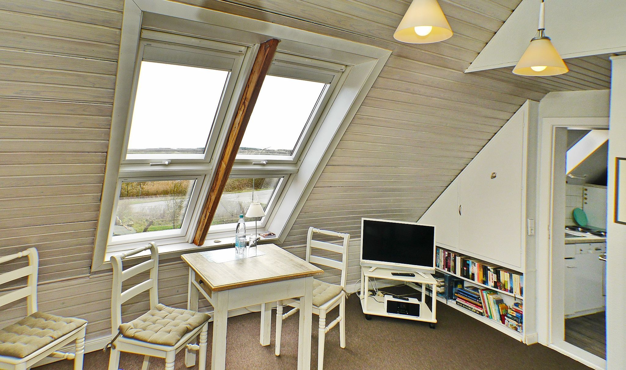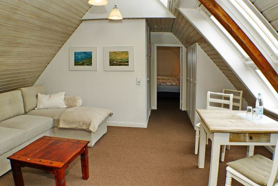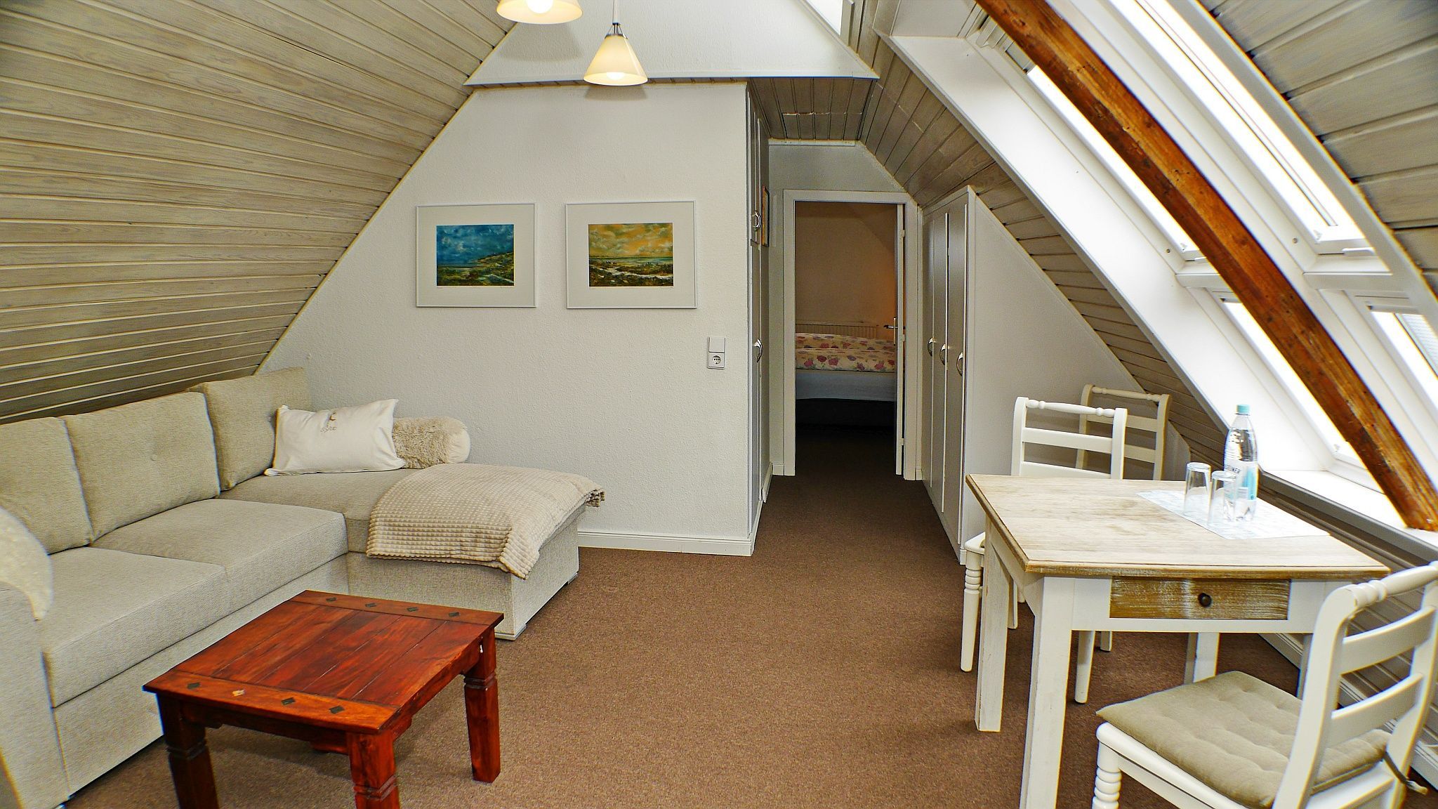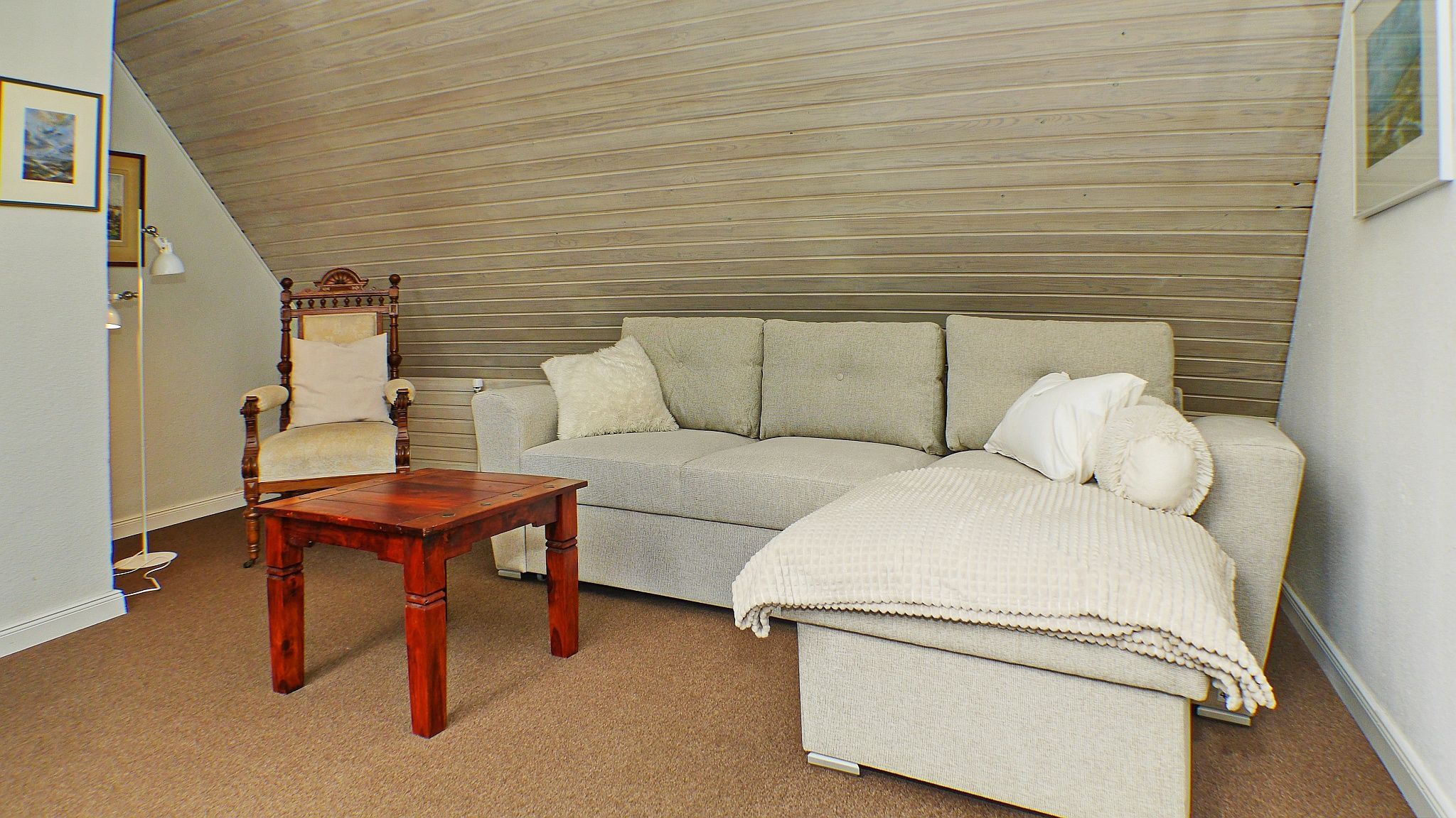 Ein helles Wohnzimmer mit Couchgarnitur (Schlafsofa), Flachbild-TV und Essecke ist der Mittelpunkt der Wohnung. Von hier aus haben Sie einen herrlichen Blick Richtung Süden auf die weitläufigen Pferde-Wiesen.
