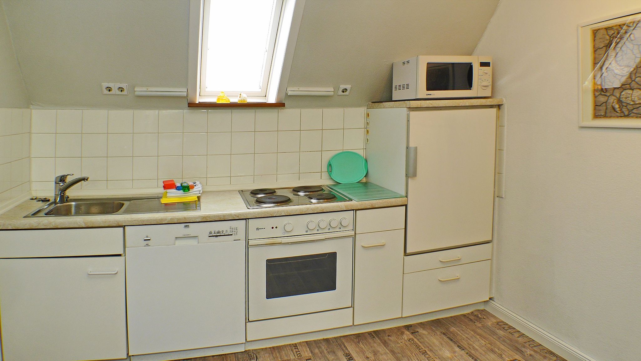 Die großzügige, separate Küche ist ausgestattet mit 4-Plattenkochfeld, Backofen, Mikrowelle, Geschirrspüler, Kühlschrank mit Gefriermöglichkeit, Kaffeemaschine, Wasserkocher, Toaster und Geschirr für den täglichen Bedarf ist selbstverständlich.