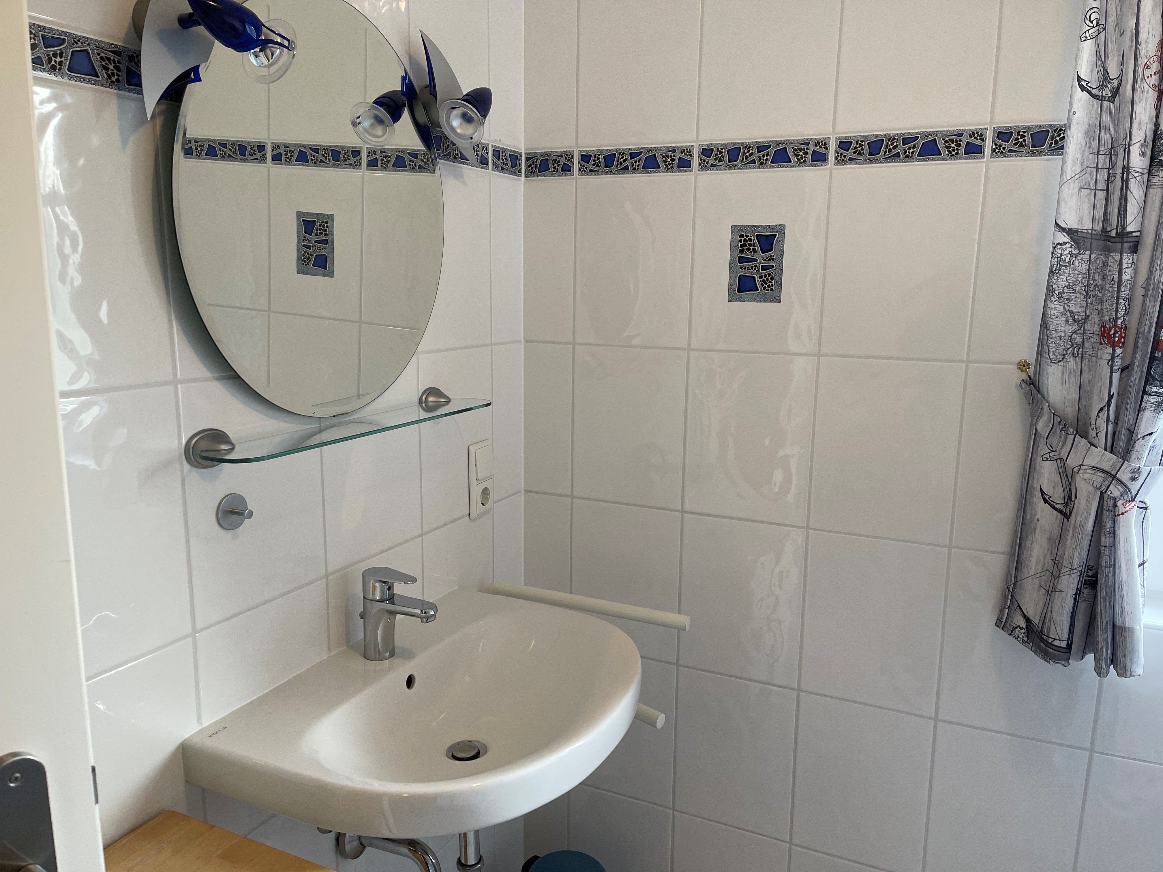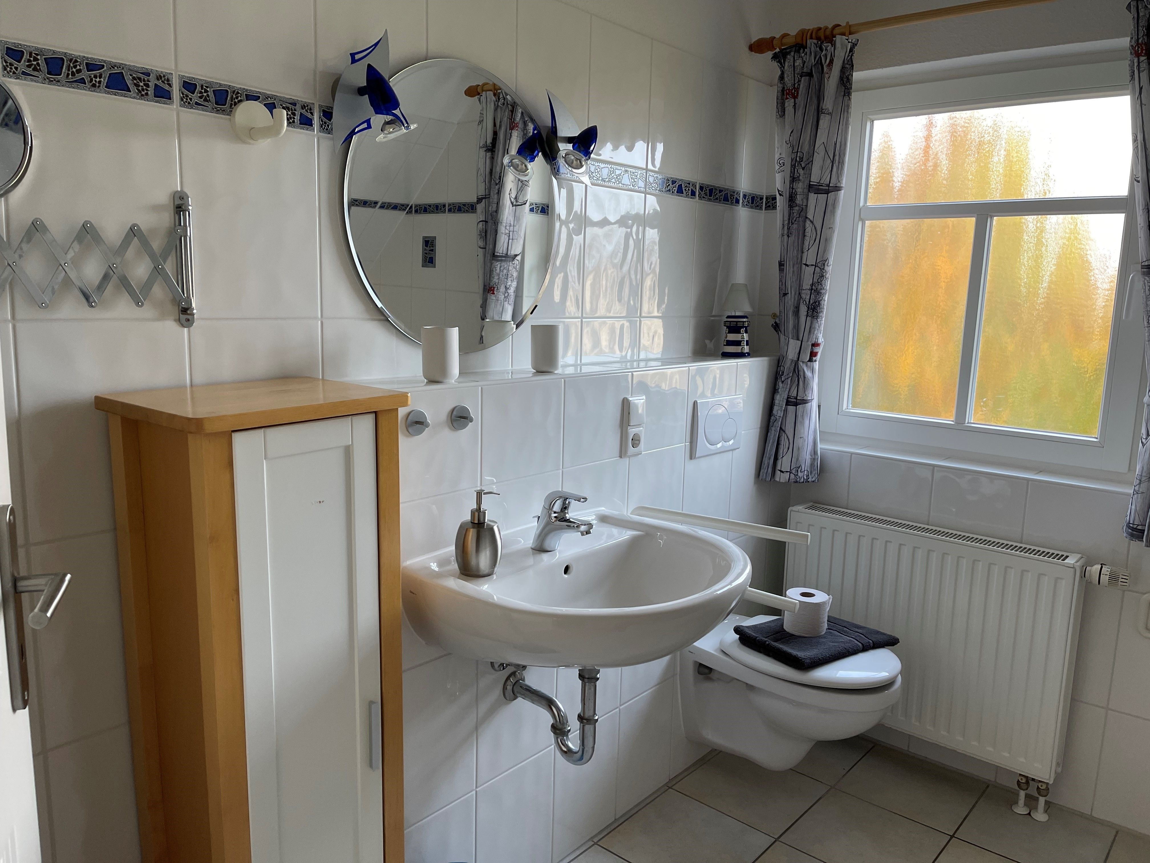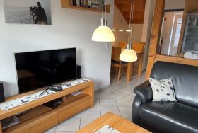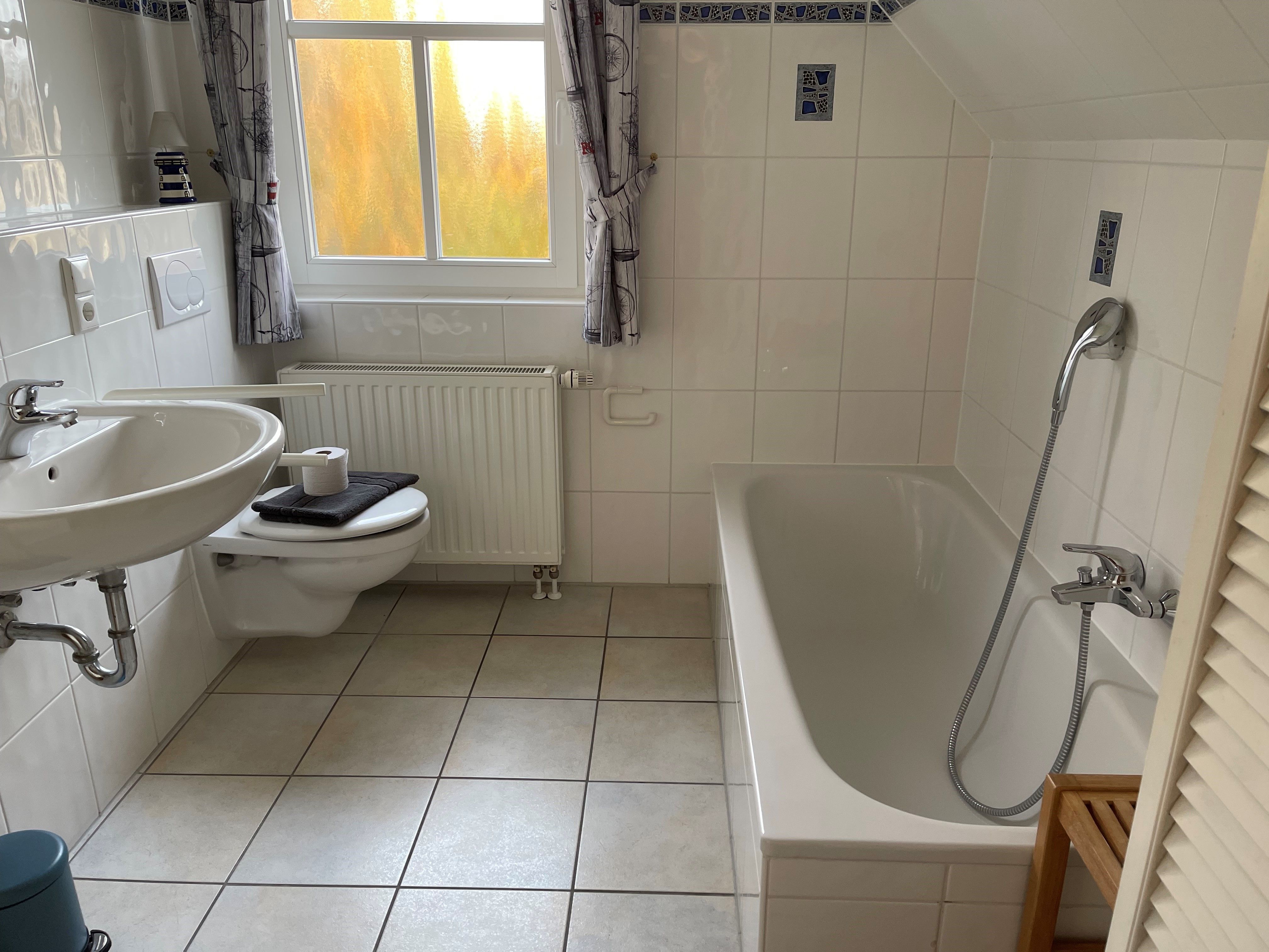 Die Schlafräume (einmal mit Doppelbett und Fernseher, einmal mit ausziehbaren Einzelbett ausgestattet) sowie ein weiteres Bad mit Badewanne und WC befinden sich im Obergeschoss.