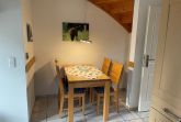 Im Erdgeschoss finden Sie einen hellen Wohnraum mit angeschlossener Küche und Esstisch sowie ein Bad mit Dusche und WC.