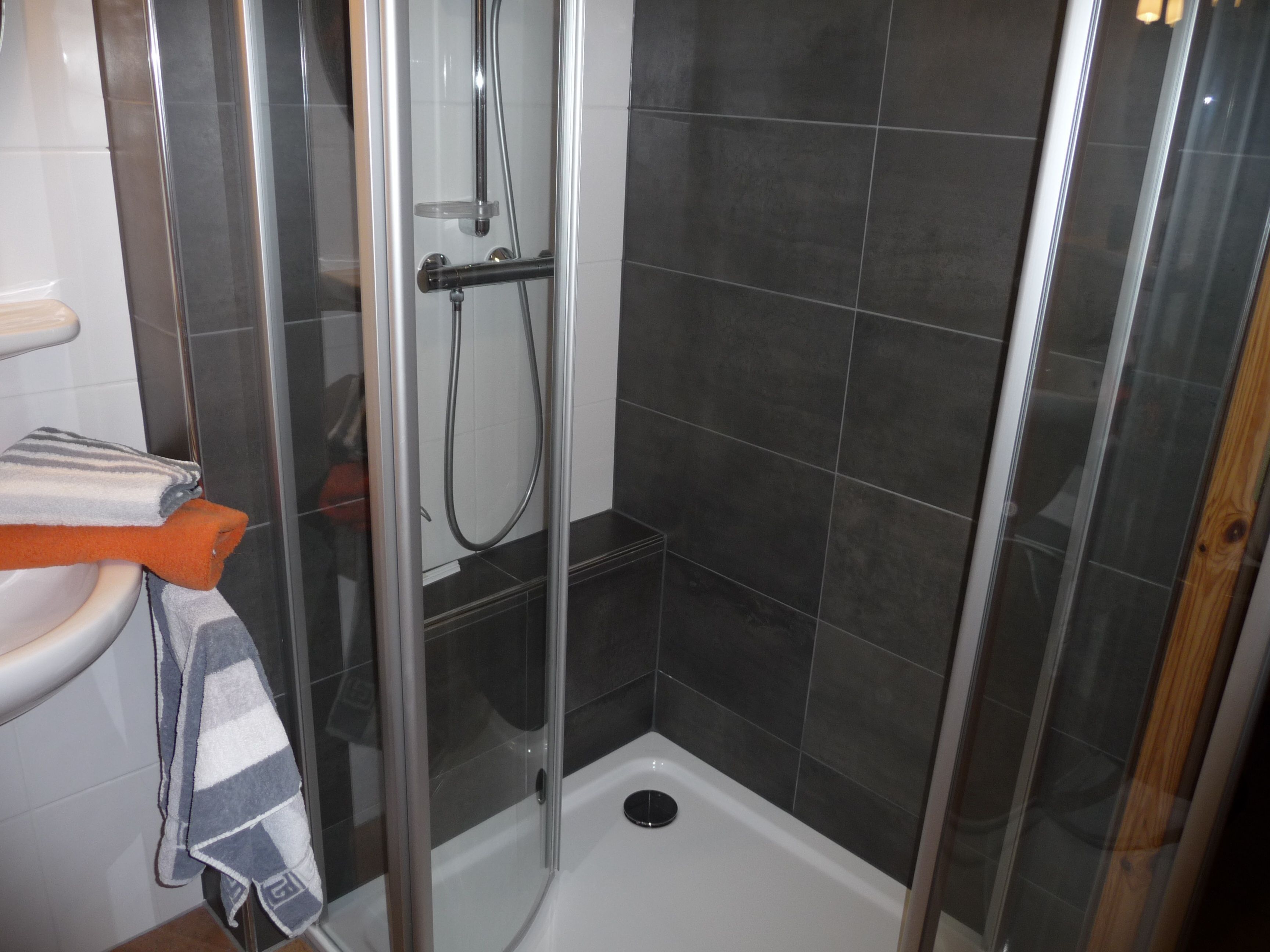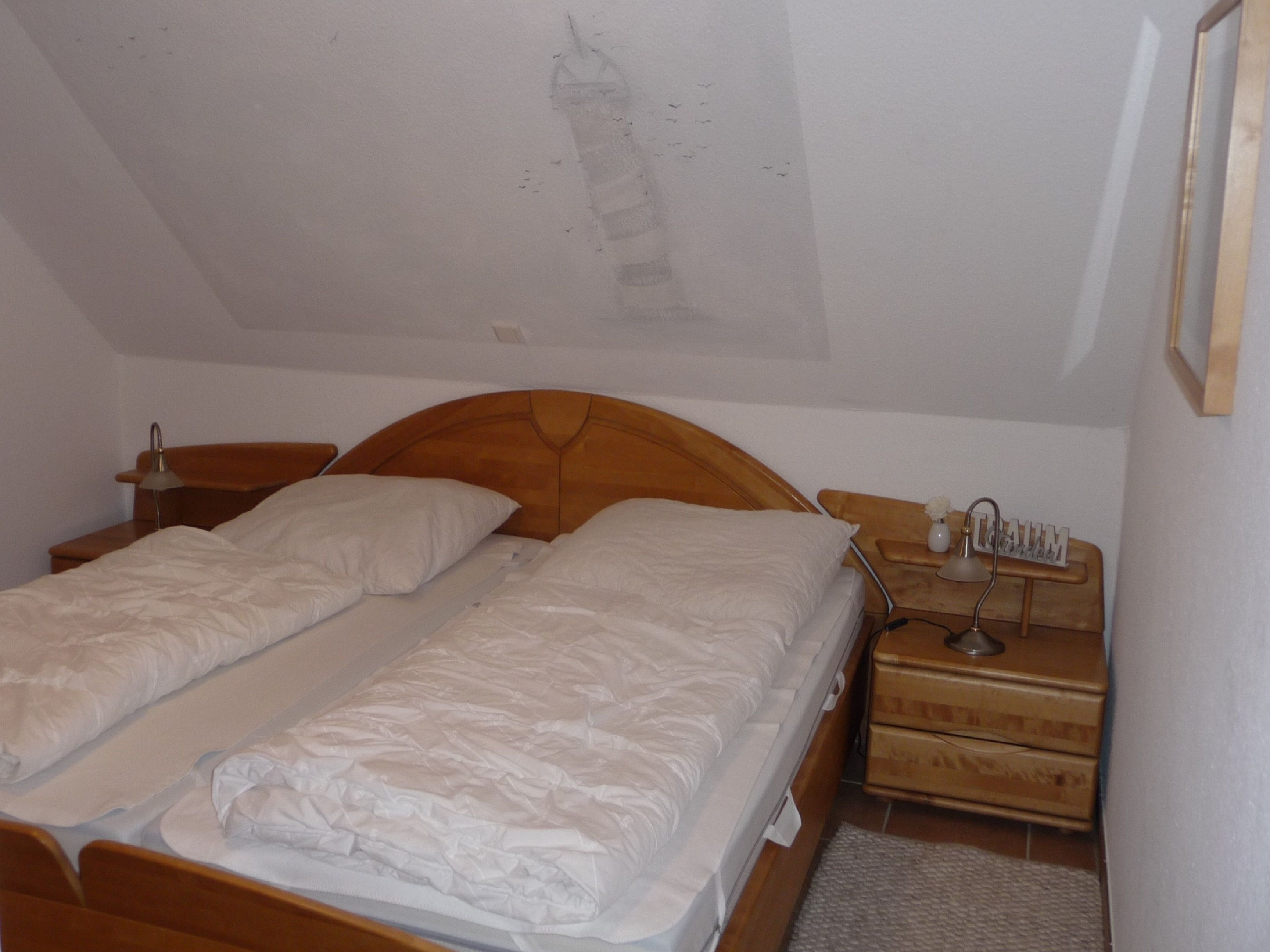 Das Obergeschoss der Doppelhaushälfte erreichen Sie über eine Holztreppe. Hier befindet sich ein Schlafzimmer mit Doppelbett und ein weiteres Schlafzimmer mit einem oder zwei Einzelbetten. Ein zweites Badezimmer mit Dusche und WC finden sie ebenfalls hier.
