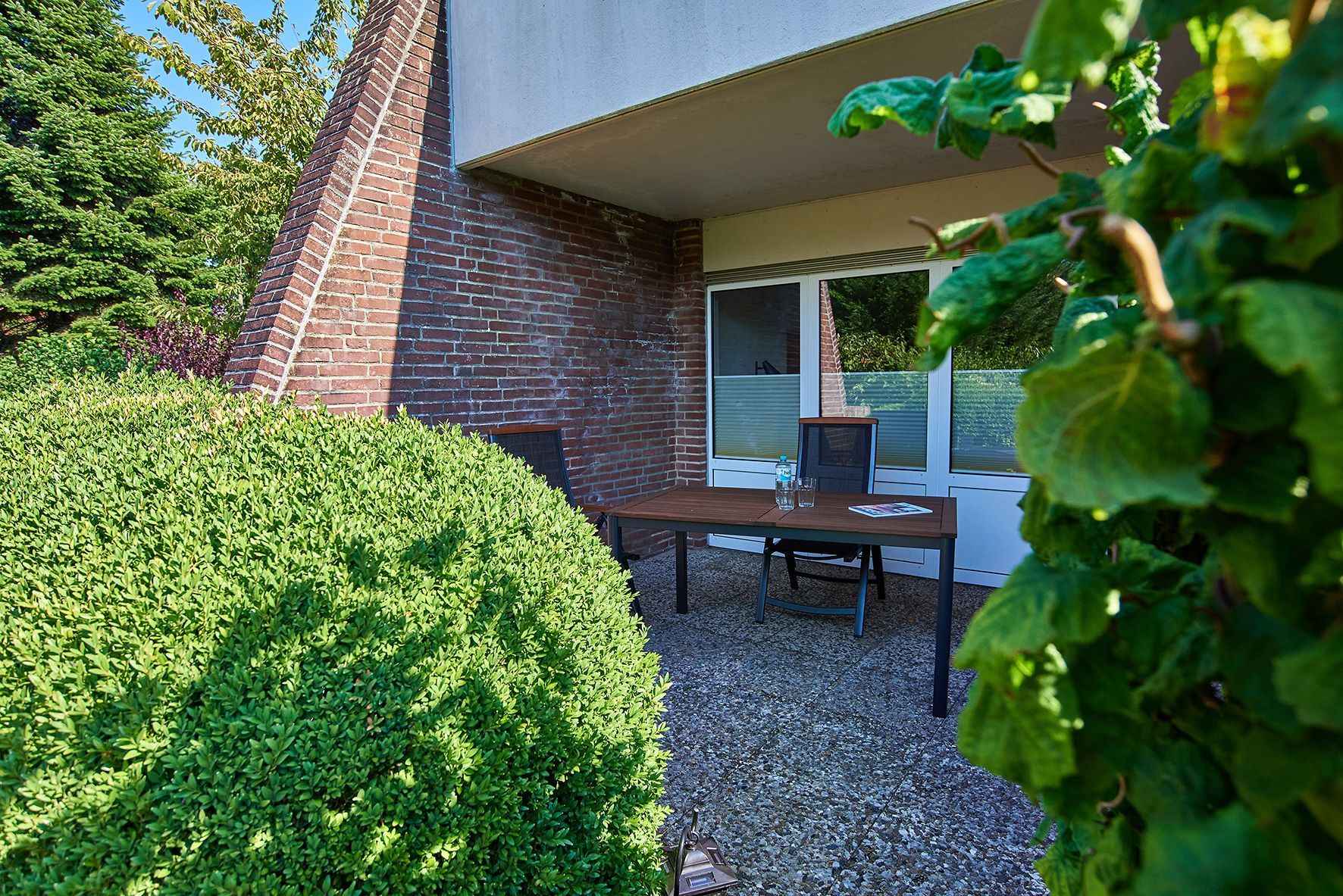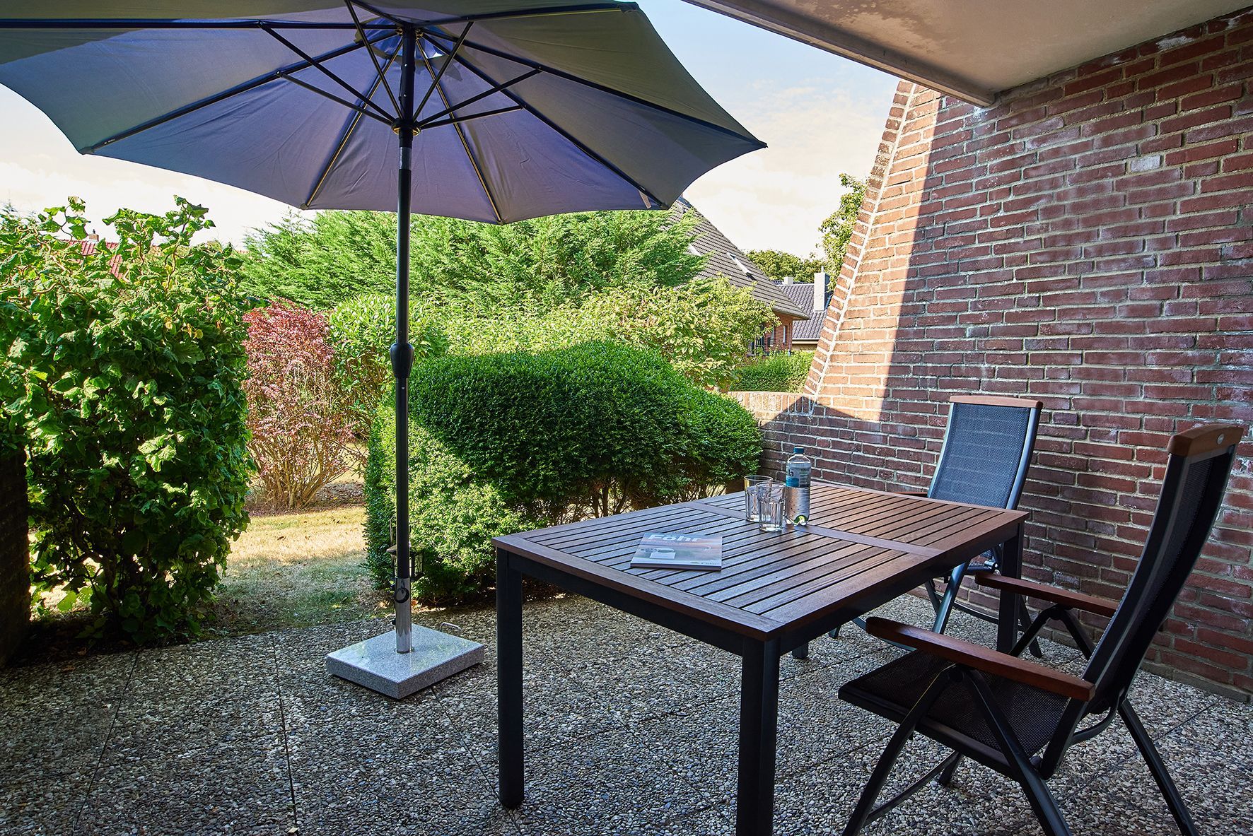Diese helle Wohnung verfügt außerdem noch über eine große Südwestterrasse mit Sitzmöbeln und Sonnenschirm.