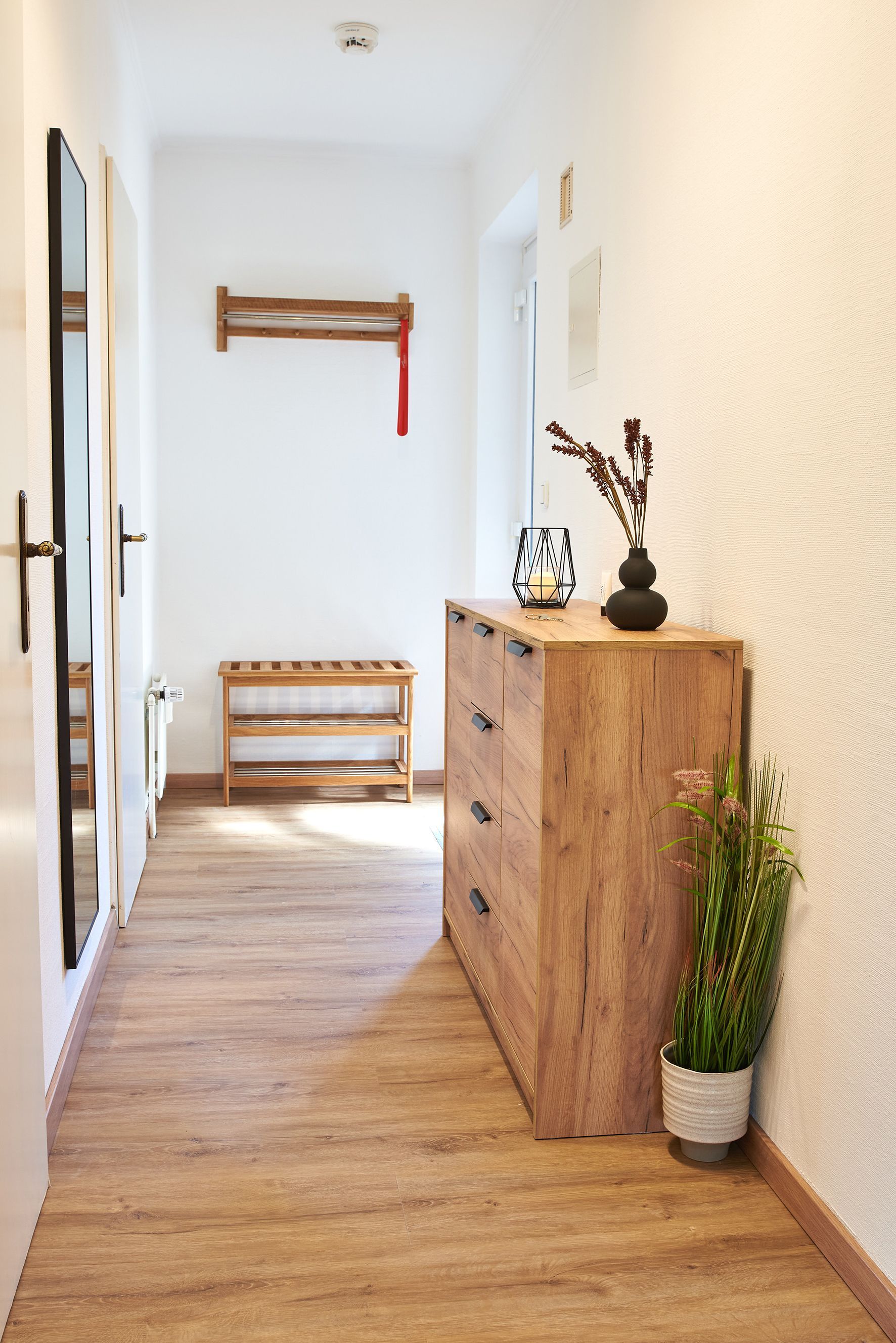 Auf ca. 45 qm stehen Ihnen ein kleiner Flur, ein Schlafzimmer mit Doppelbett (1,60m x 2m), Duschbad/WC, eine offene Einbauküche und ein kombinierter Wohn-Essbereich zur Verfügung.