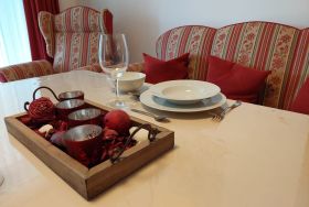 Um den Tisch gruppieren sich das gemütliche, große Friesensofa und 2 große Friesensessel, die zum Verweilen einladen.