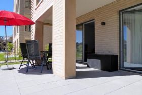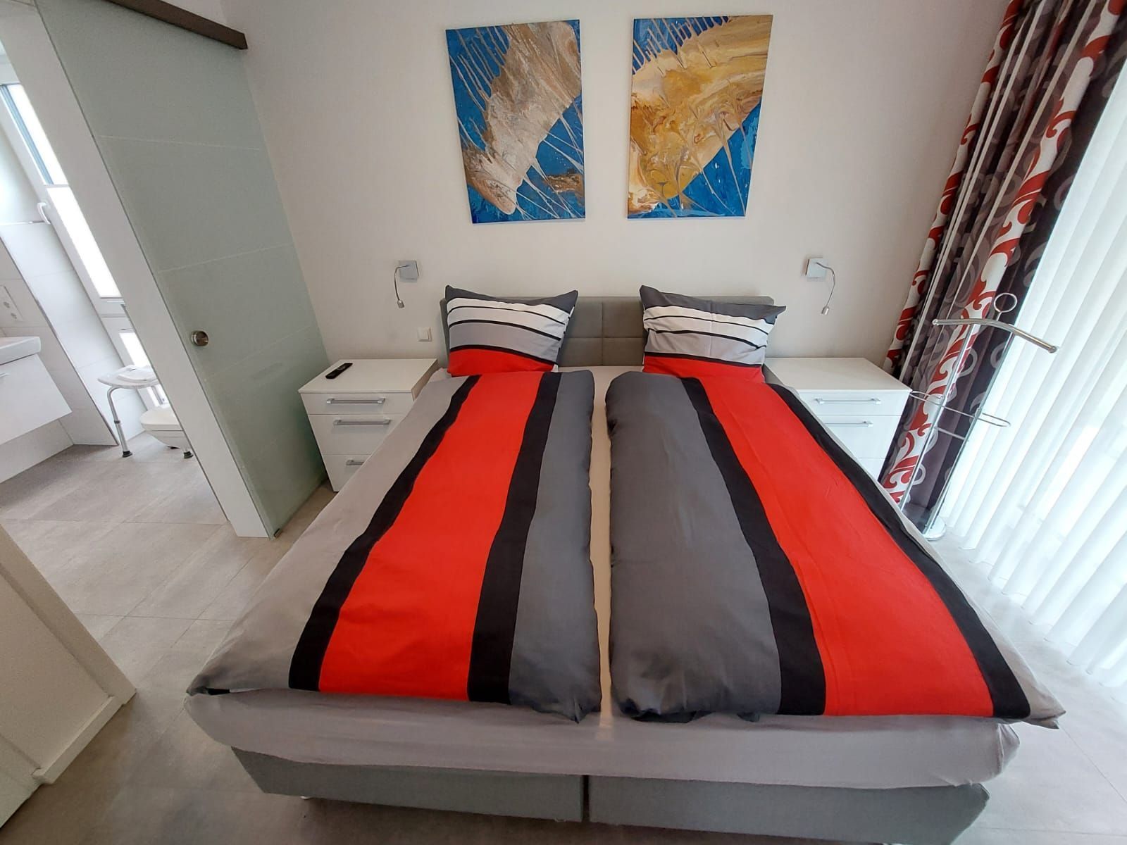 Über eine Schiebetür gelangt man in das Schlafzimmer. Hier lädt ein gemütliches Doppel-Boxspringbett zum Schlafen und Dösen ein. Auch in diesem Raum befinden sich ein Flat TV und ein Zugang zur Terasse.