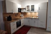 Über den kleinen Flur mit praktischer Garderobe gelangt man in das große Wohnzimmer mit der vollausgestatteten Küche. Schränke, der große Tisch und die Stühle sind aus Vollholz und schaffen eine angenehme Atmosphäre.