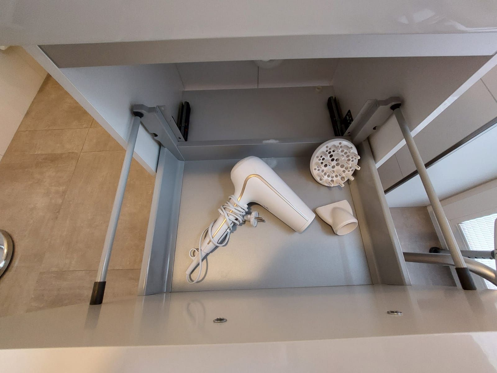 Über eine weitere Schiebetür gelangt man in das Badezimmer. Die Toilette ist erhöht, der Waschtisch bietet extra Ablagefläche. Neben dem beleuchtbarem Spiegel befindet sich ein integriertes Radio.