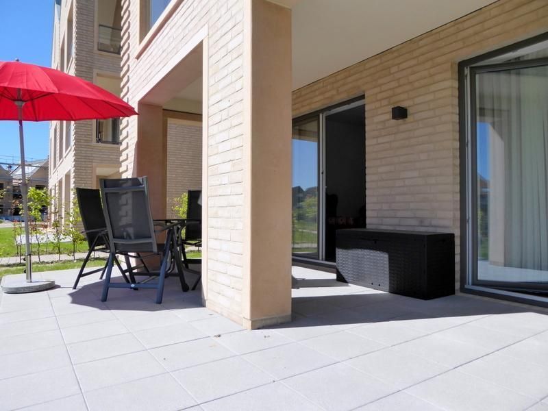 Vom Wohnzimmer aus hat man Zugang zur geräumigen, überdachten Terrasse und zu dem mit einer Hecke eingefriedeten Rasen. Von hier kann man bis zum Deich blicken. Für sonnige Tage stehen ein Sonnenschirm sowie eine Sitzgarnitur mit Auflagen bereit.