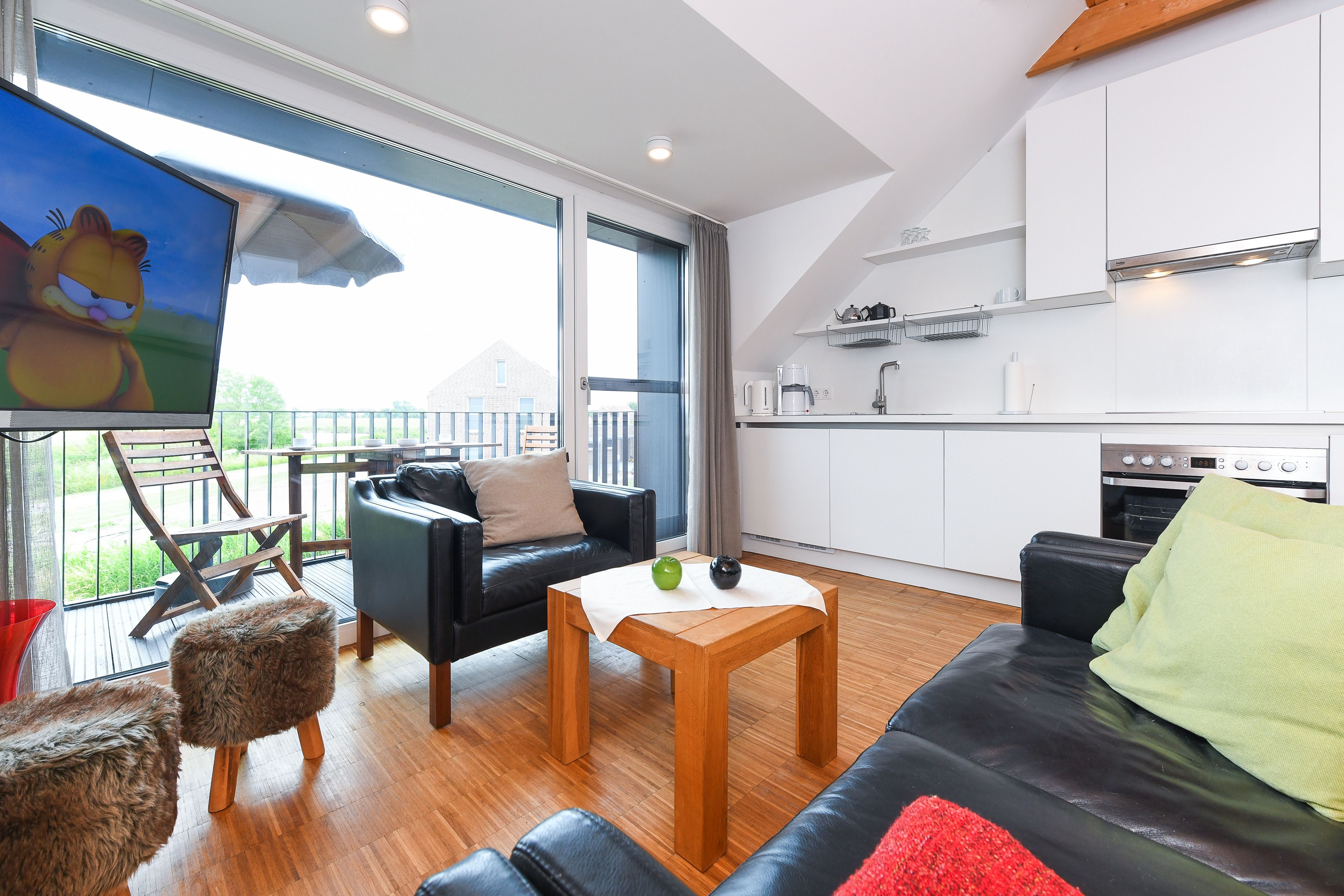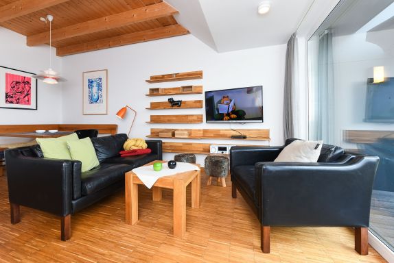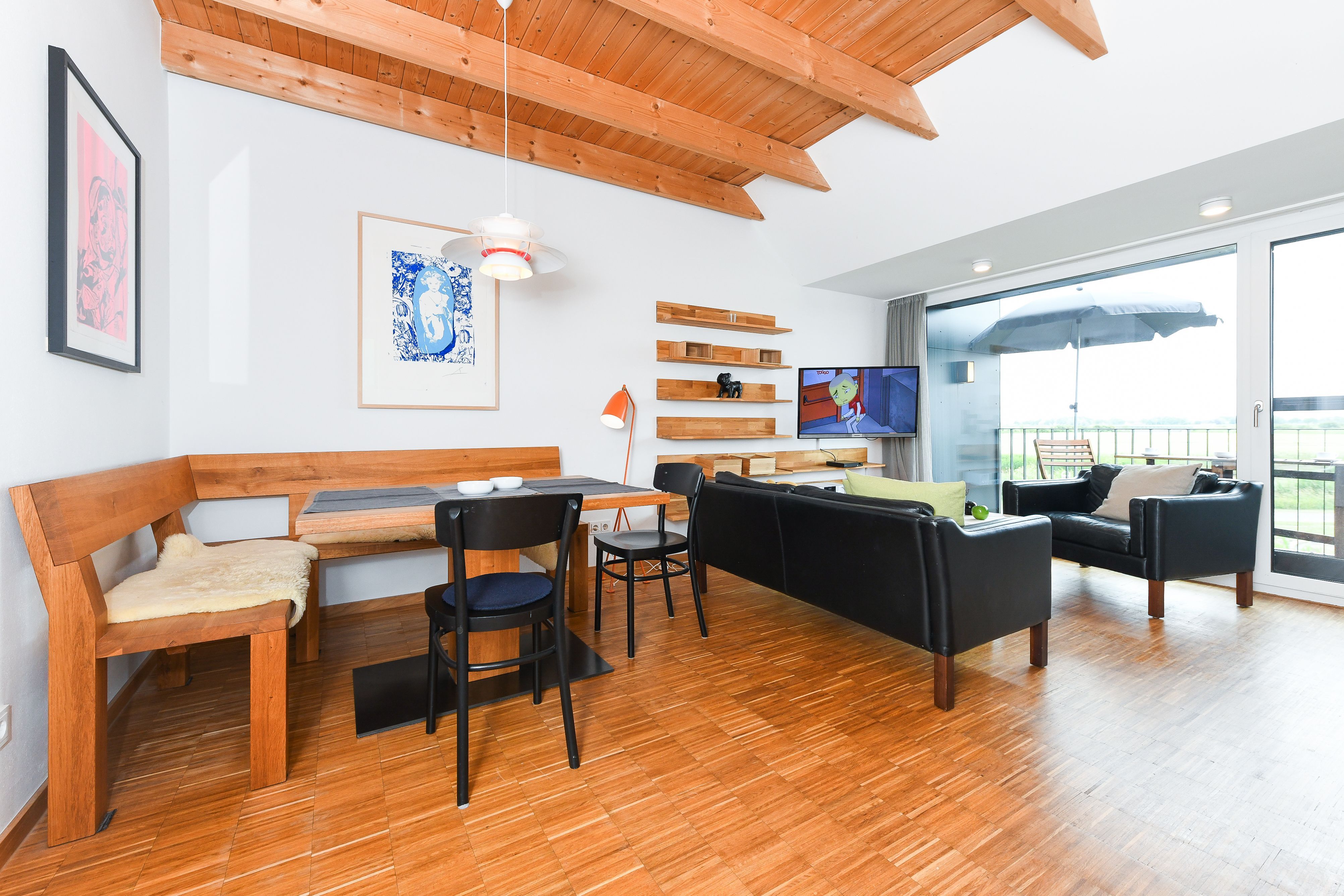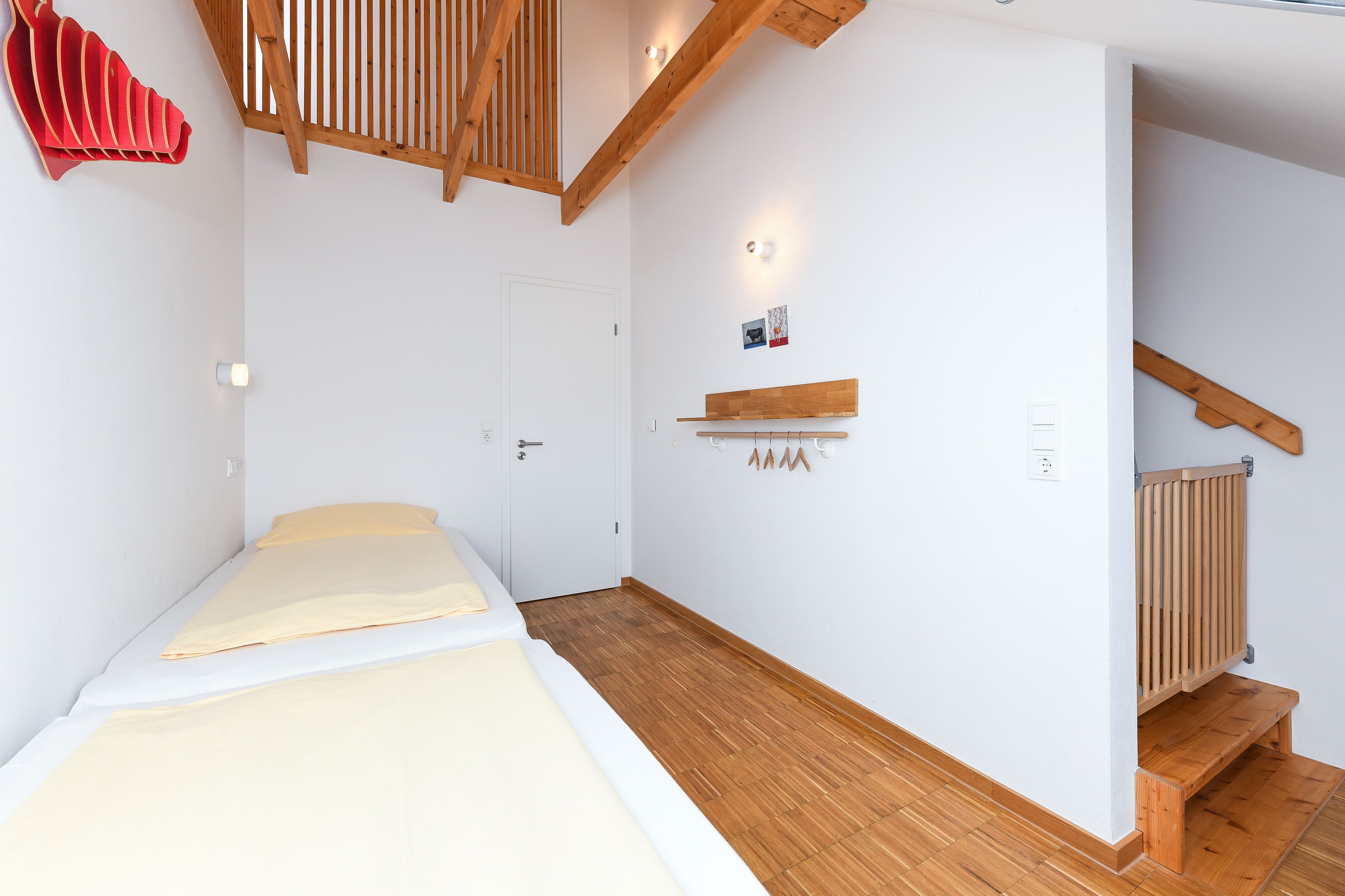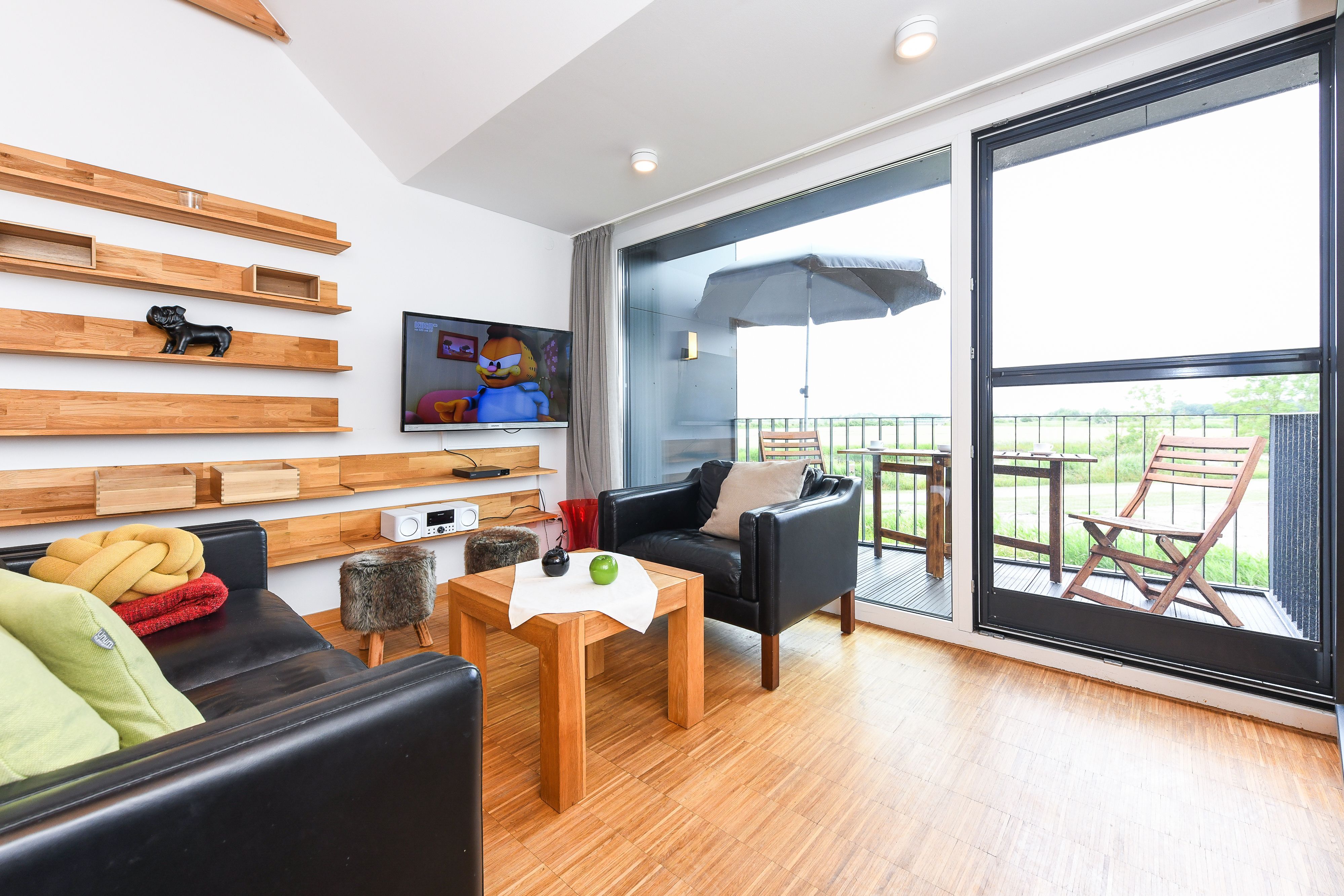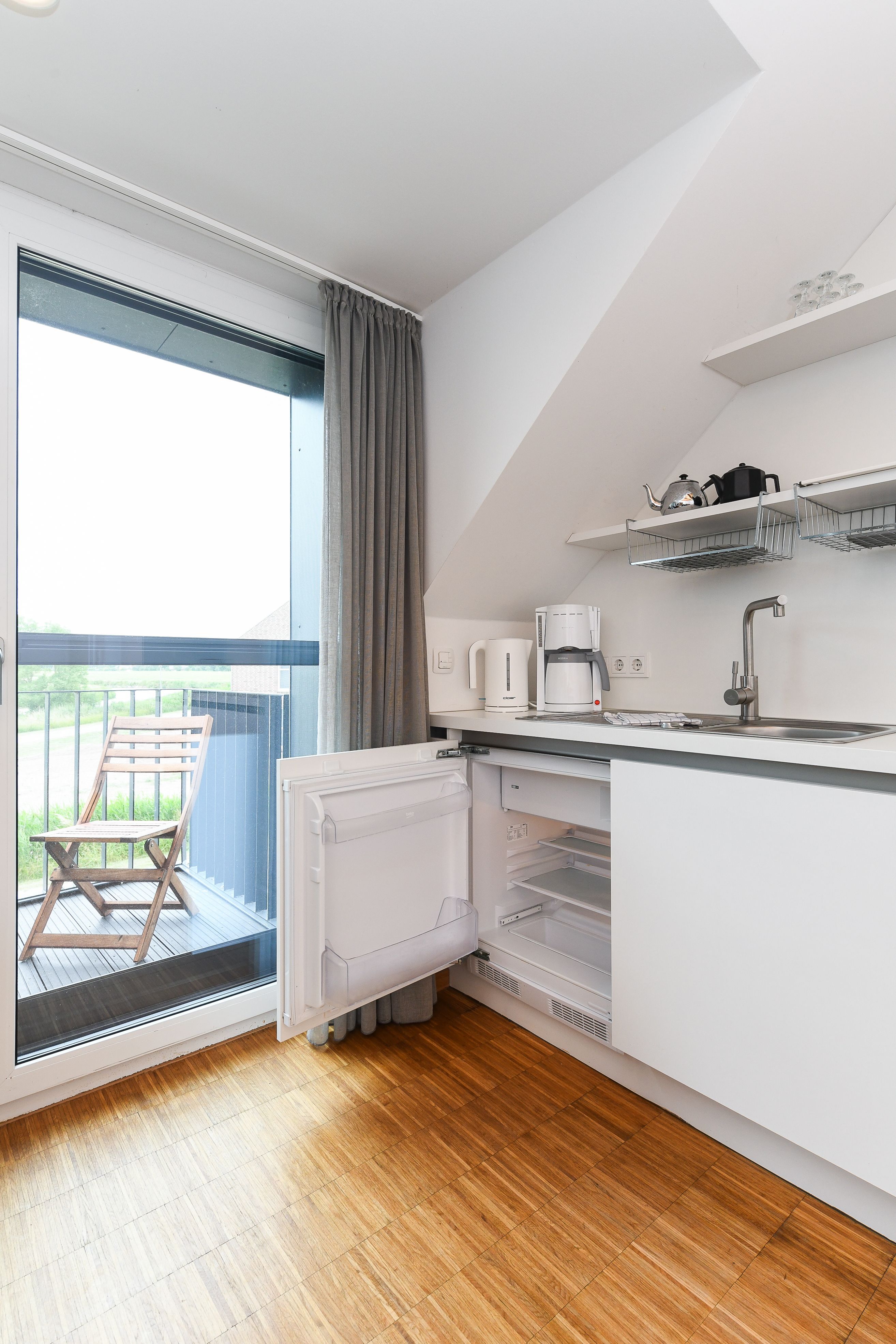 Das Appartement im Obergeschoss (60 m²) der SIELZEIT mit separatem Zugang im Erdgeschoss und einem groß- zügigen Balkon besitzt eine geräumige Wohnküche, zwei separate Schlafzimmer und eine Schlaf- / Spielempore. Es bietet vier bis max. sechs Personen Platz. Bodentiefe Panoramafenster eröffnen einen unverstellten Blick in die weite ostfriesische Landschaft und auf die das Grund- stück umgebenden Gewässer. Die Wohnung verfügt über ein geräumiges Bad mit großzügiger Walk-In-Dusche.