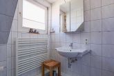 Das Badezimmer ist mit einer Dusche, Waschtisch und WC ausgestattet.