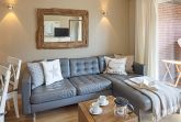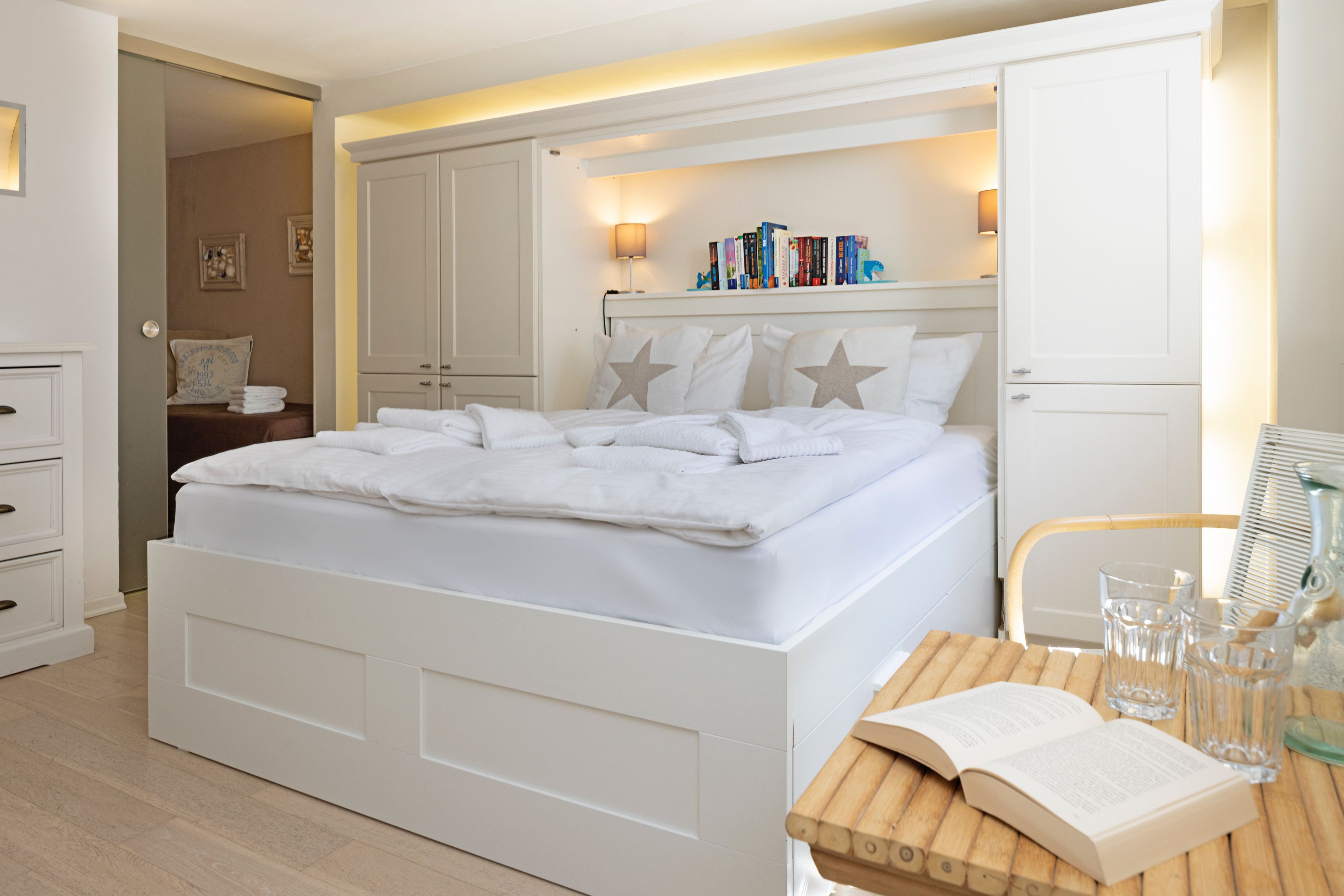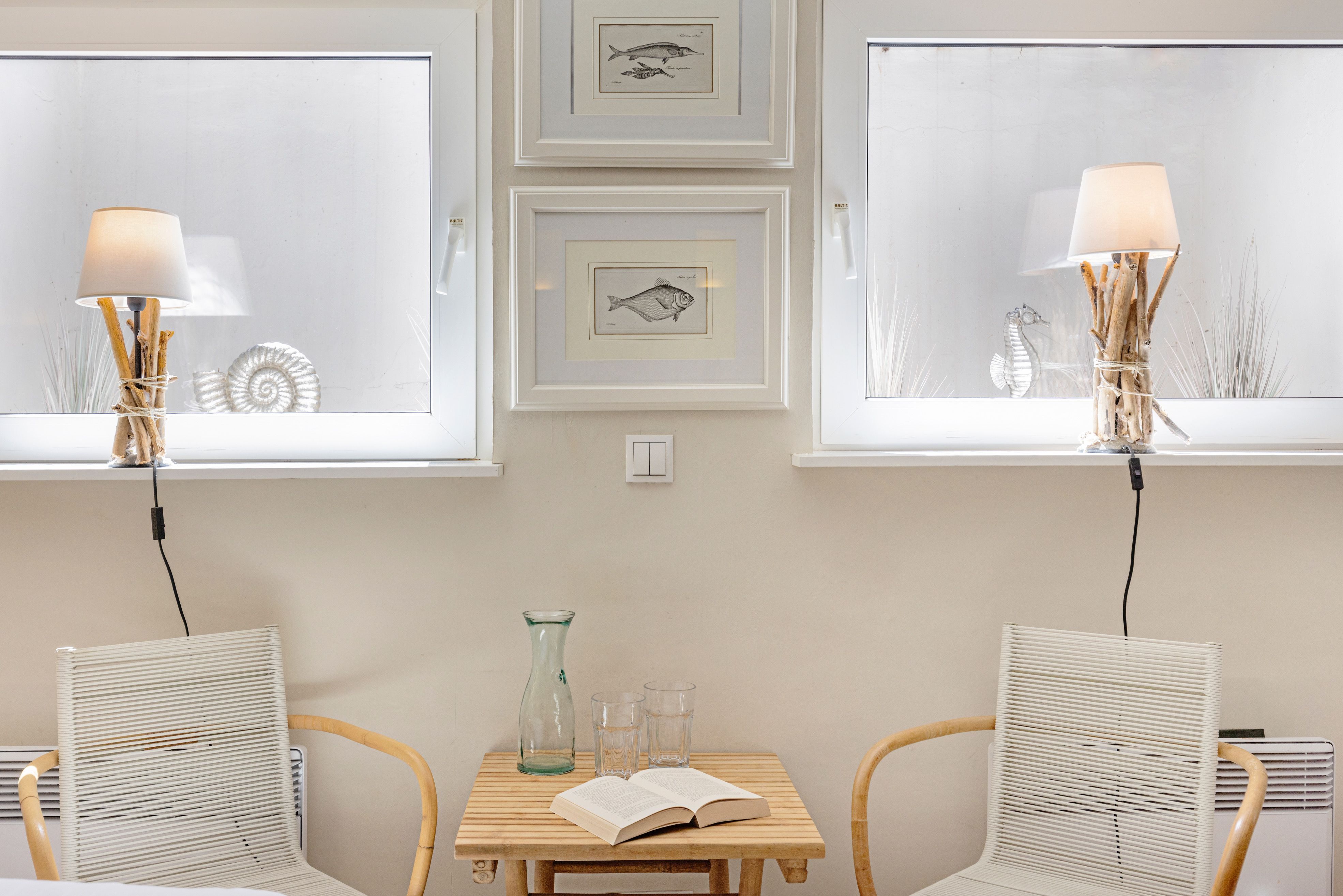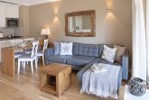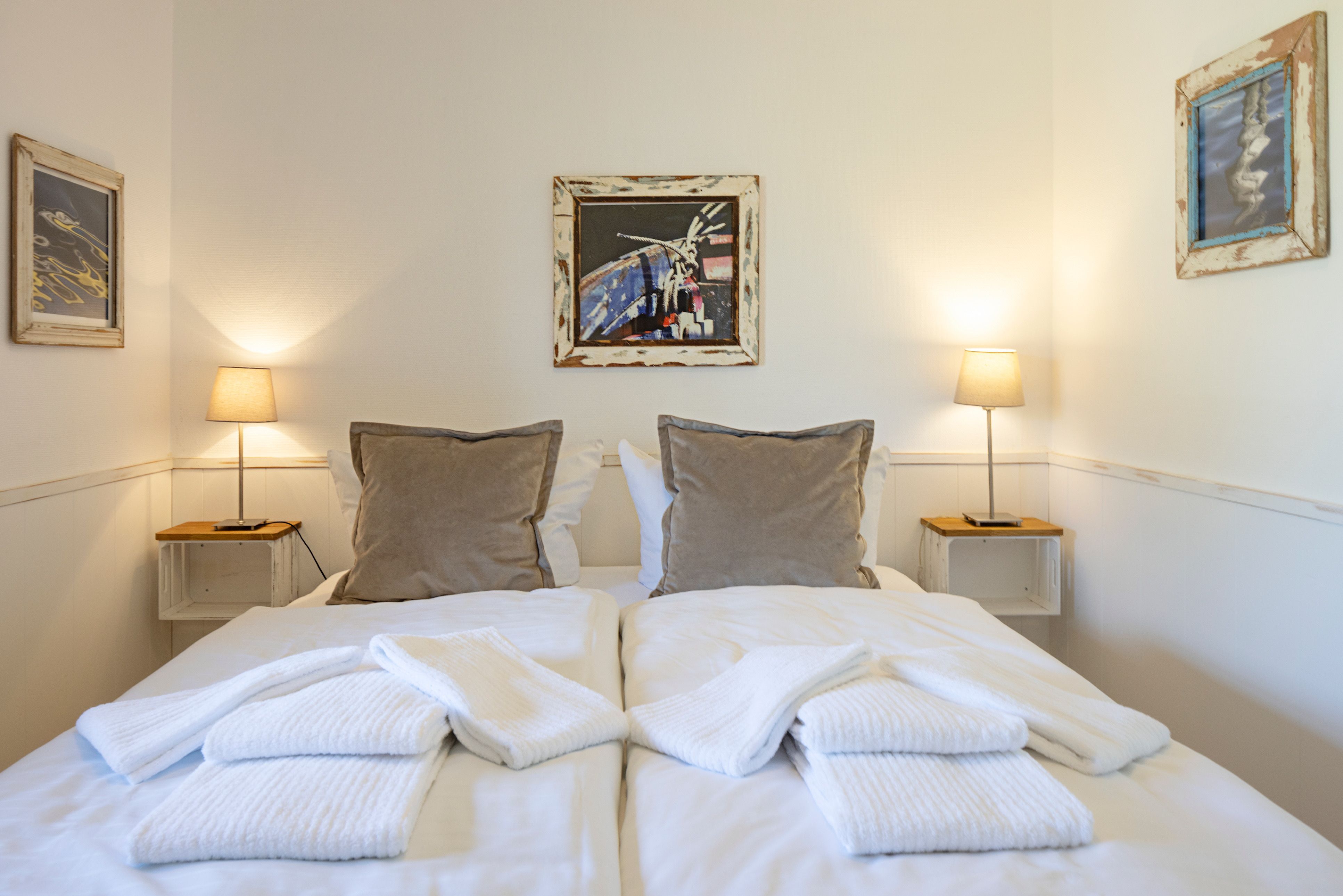 Die Wohnung hat ein separates Schlafzimmer mit Doppelbett, ein Wohnzimmer mit Siematic-Küchenzeile und ein Bad mit Badewanne im Erdgeschoss. Die Küche verfügt über einen Geschirrspüler, eine Mikrowelle und einen separaten Backofen. Über eine offene Landhaustreppe erreicht man das zweite Schlafzimmer mit Doppelbett im Souterrain. Dort befindet sich auch die Sauna mit einem kleinem Vorraum und Ruheliege, sowie ein zweites bisazzagefliestes Badezimmer mit Dusche.