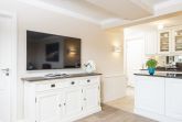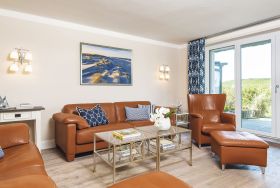 Traumhafte Lage auf dem Roten Kliff, umgeben von viel Grün mitten im Naturschutzgebiet. Diese Erdgeschosswohnung in einem gepflegten Appartementhaus unter Reet ist hochwertig und mit etwas maritimem Flair eingerichtet. Von dem kleinen Flur aus erreicht man durch die offene Küche mit Kochinsel das elegante Wohnzimmer. De Sede Ledermöbel, ein Wand-TV und ein toller Dünenblick über die Terrasse mit Strandkorb gen Westen sind hier die Vorzüge. Hinter der nächsten Tür erwartet Sie ein Doppelschlafzimmer mit Einbauschränken, TV und kleinem Arbeitsplatz vor dem Fenster, hier lockt der beruhigende Ausblick über Dünen und Sylter Heckenrosen. Ebenfalls vom Flur gehen auch das kleine Schlafzimmer mit Kojenbett, plus einem ausziehbaren Gästebett bzw. zusätzlichem Einzelbett für ein Kind und TV, sowie das elegante Bad mit Sitzdusche im XXL-Format ab. Das Quartier ist komplett mit Holzdielen und Natursteinböden ausgelegt.