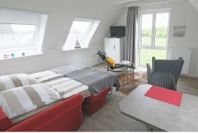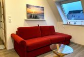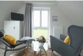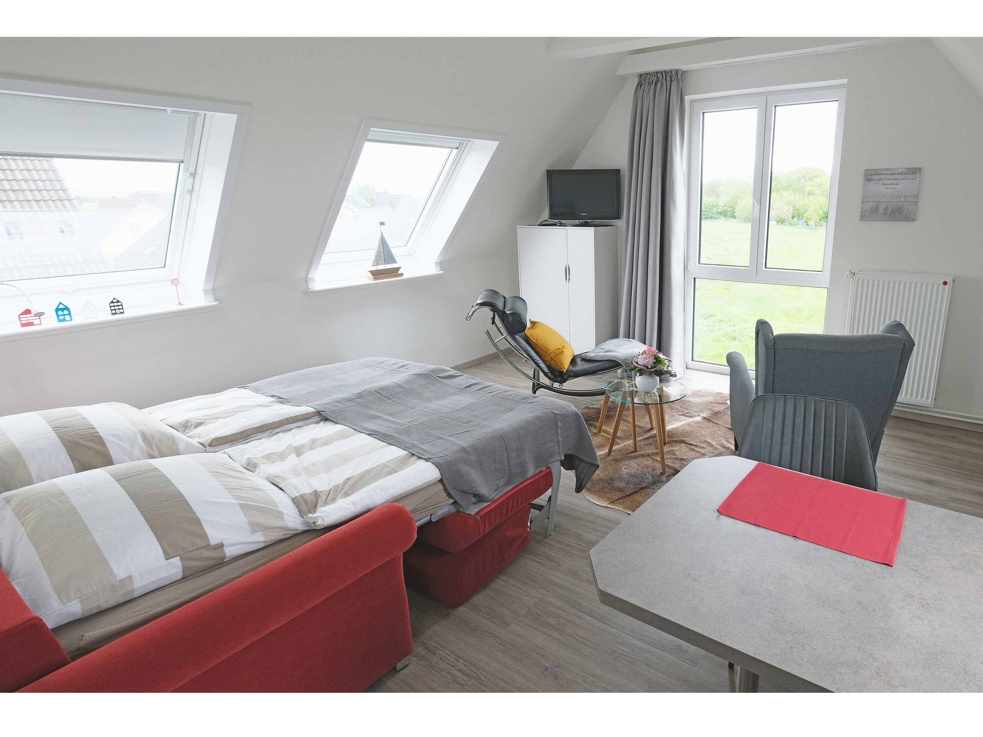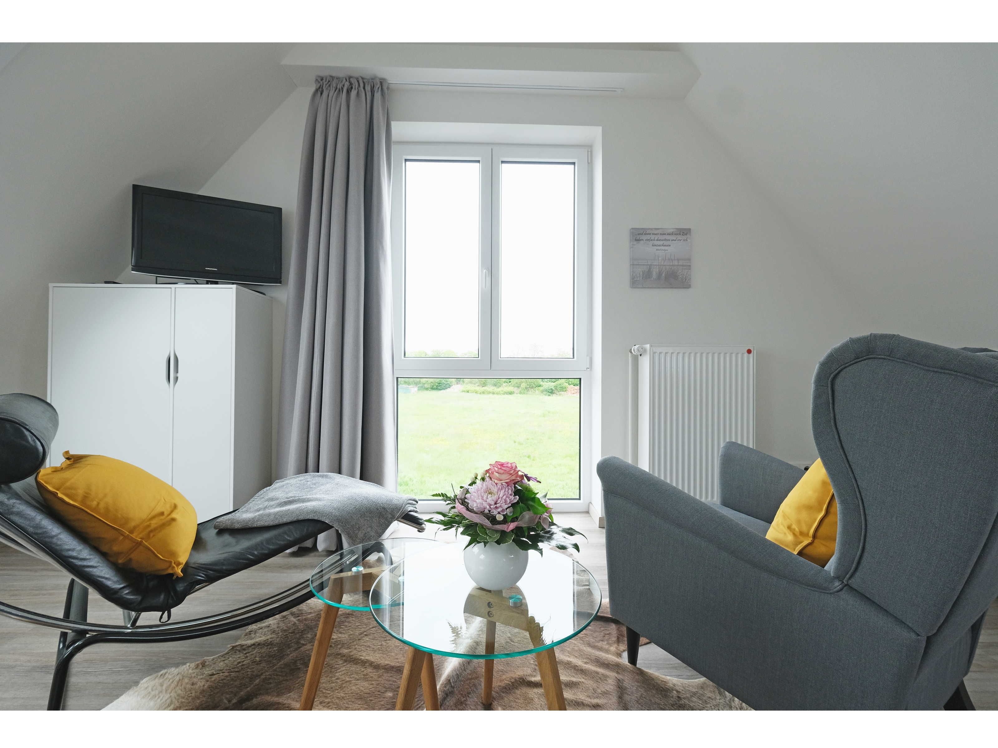 • Ein gemütlicher Sessel und ein relaxchair geben dem Raum eine wohlige Atmosphäre. Blicken Sie durch das große Fenster entspannt in's Grüne. Flachbildfernseher.