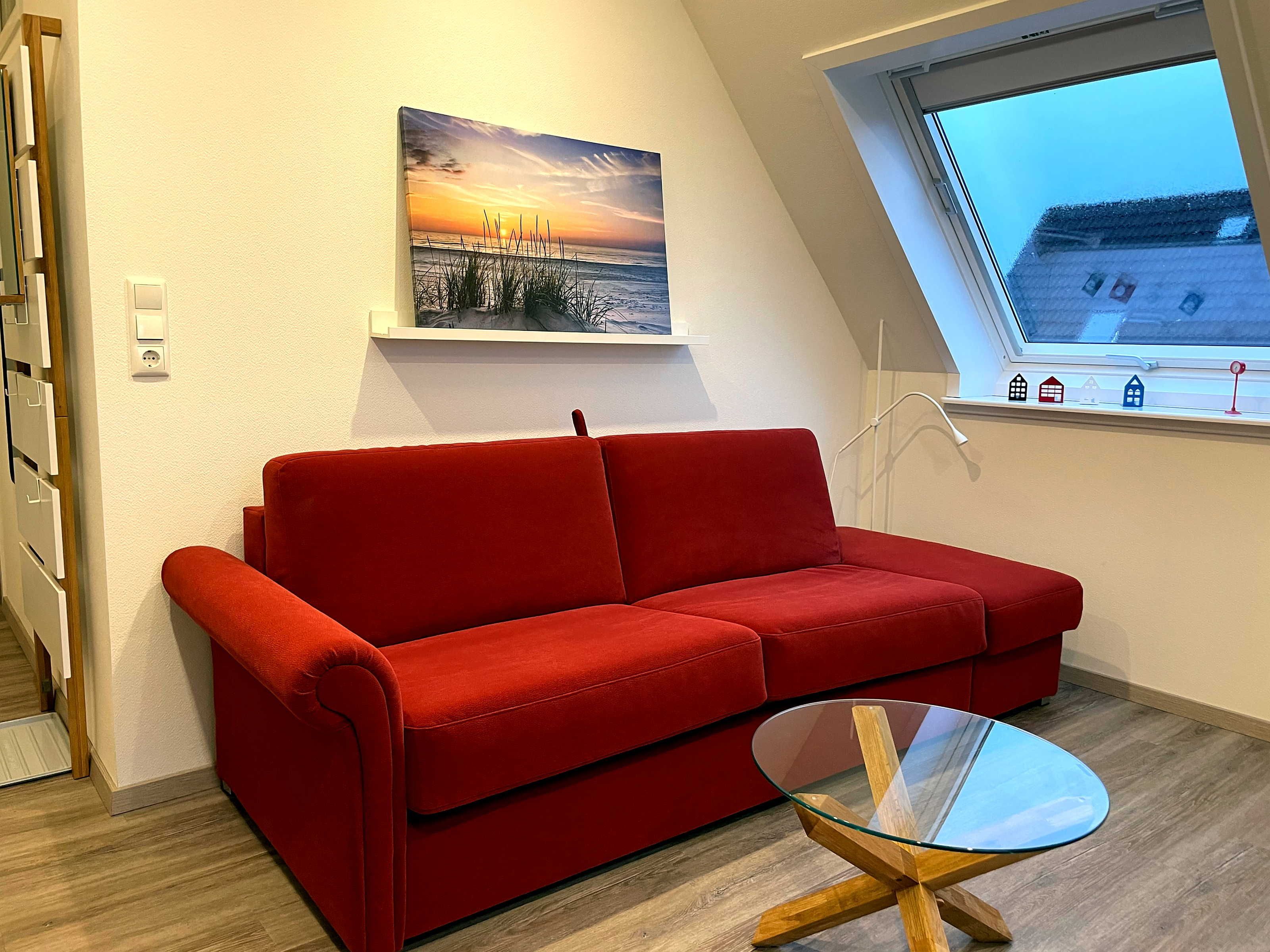 • Kombinierter Wohn-Schlafraum. Die bequemer Couch verfügt über eine Schlaffunktion.