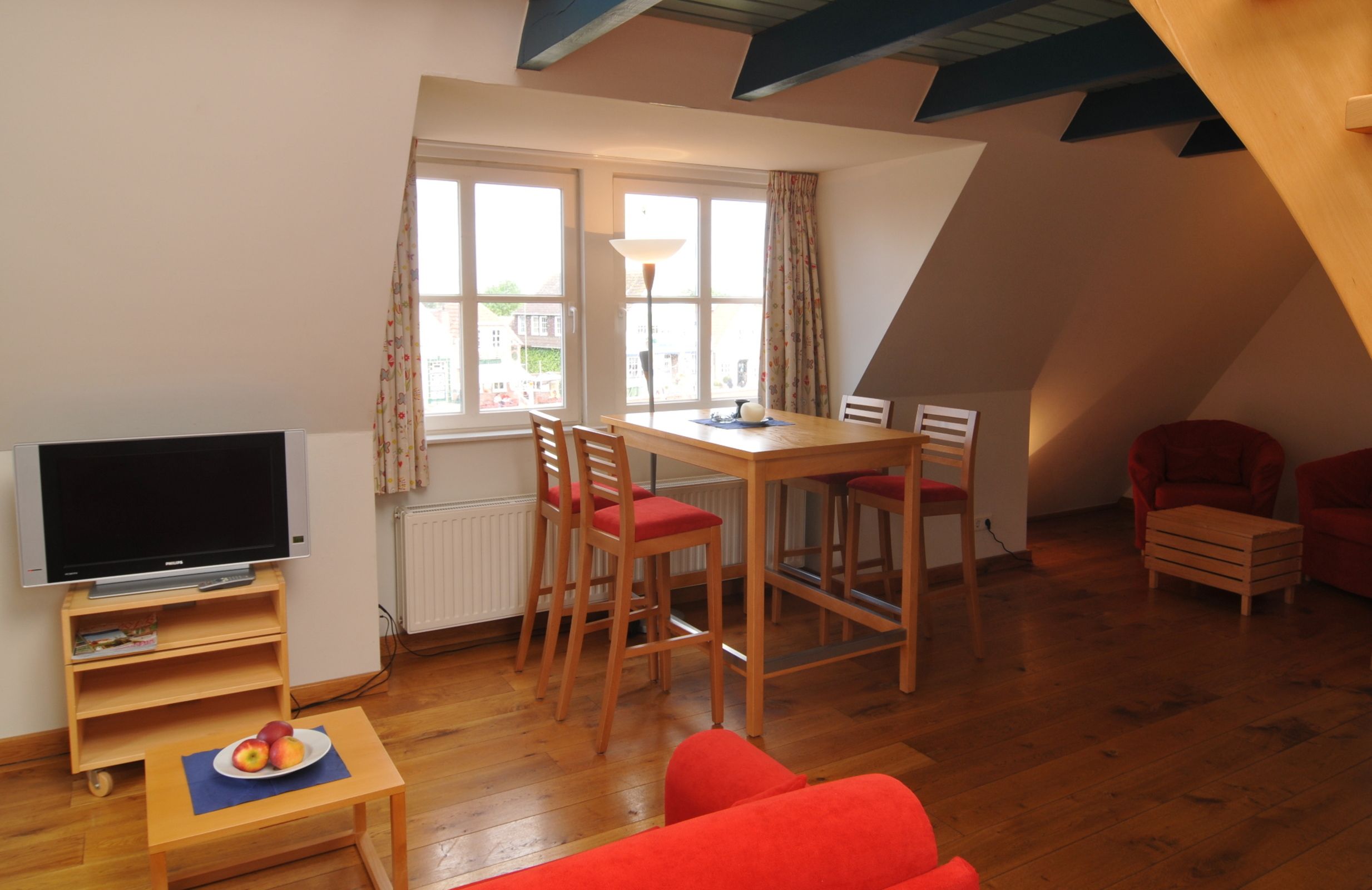 * Wohnzimmer kombiniert mit erhöhter Essecke (Hafenblick) und Küchenzeile