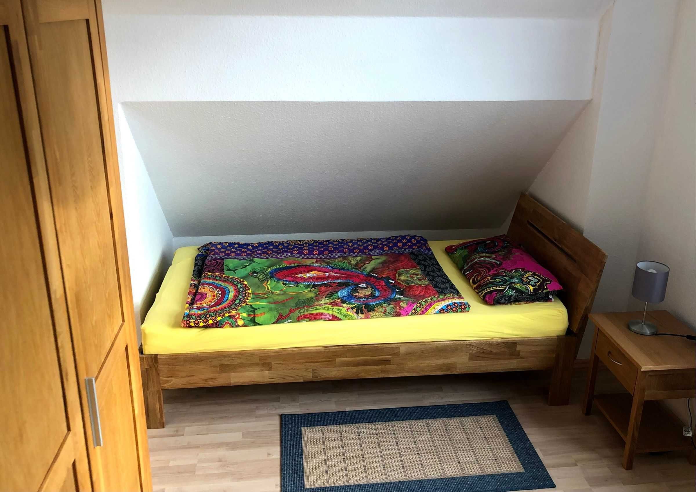 • 1 Schlafraum mit 1 Bett und Kinderbett und Wickelkommode (1. Stock)