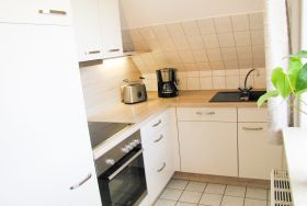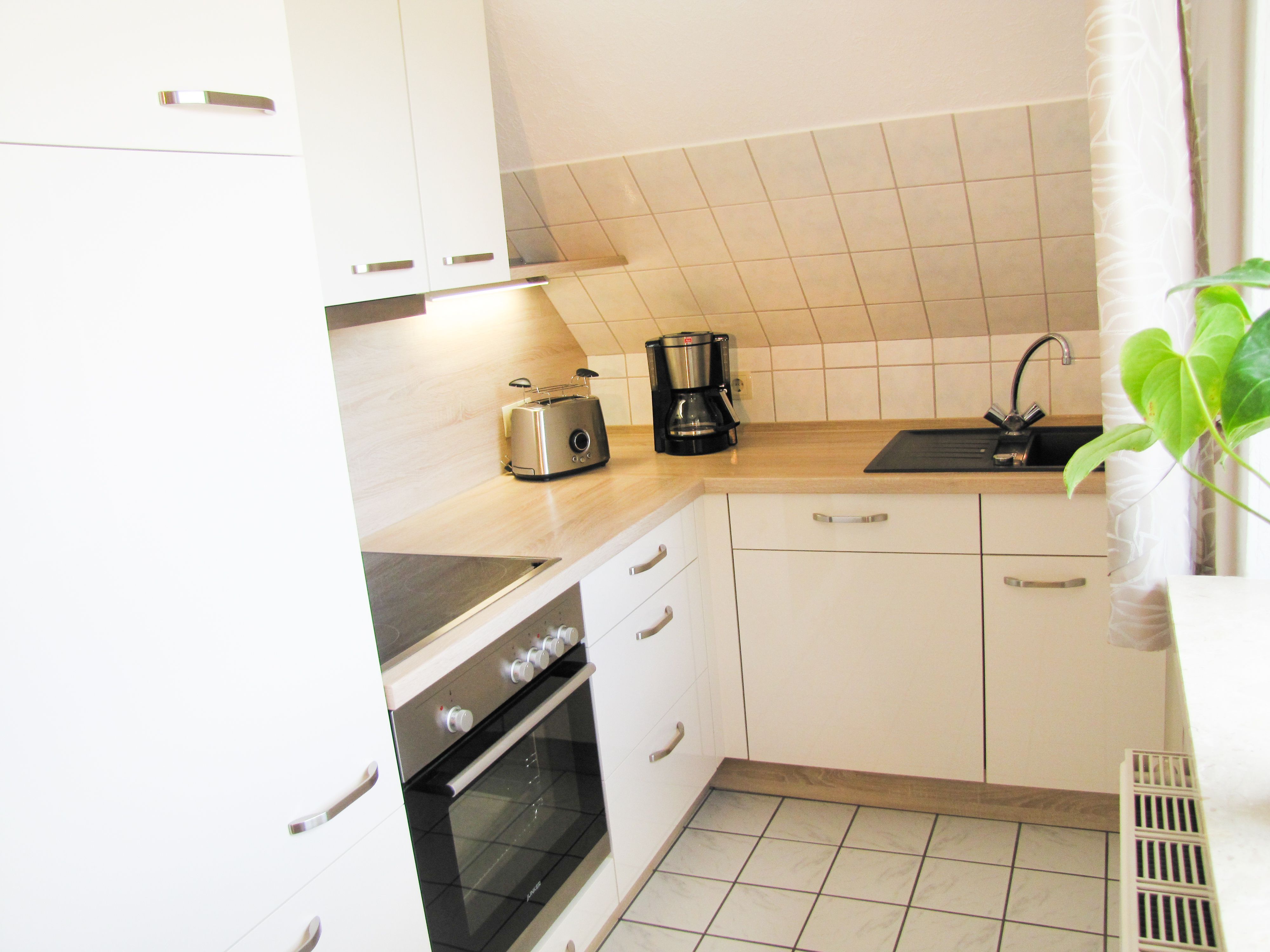 • Einbauküche mit Esstisch und Stühlen, Herd mit Ceranfeld (4 Kochstellen), Backofen, Geschirrspüler, Kühlschrank mit 3Sterne-Gefrierfach, Kaffeemaschine, Wasserkocher, Toaster. Geschirr und Hausrat für den täglichen Bedarf ist vorhanden.