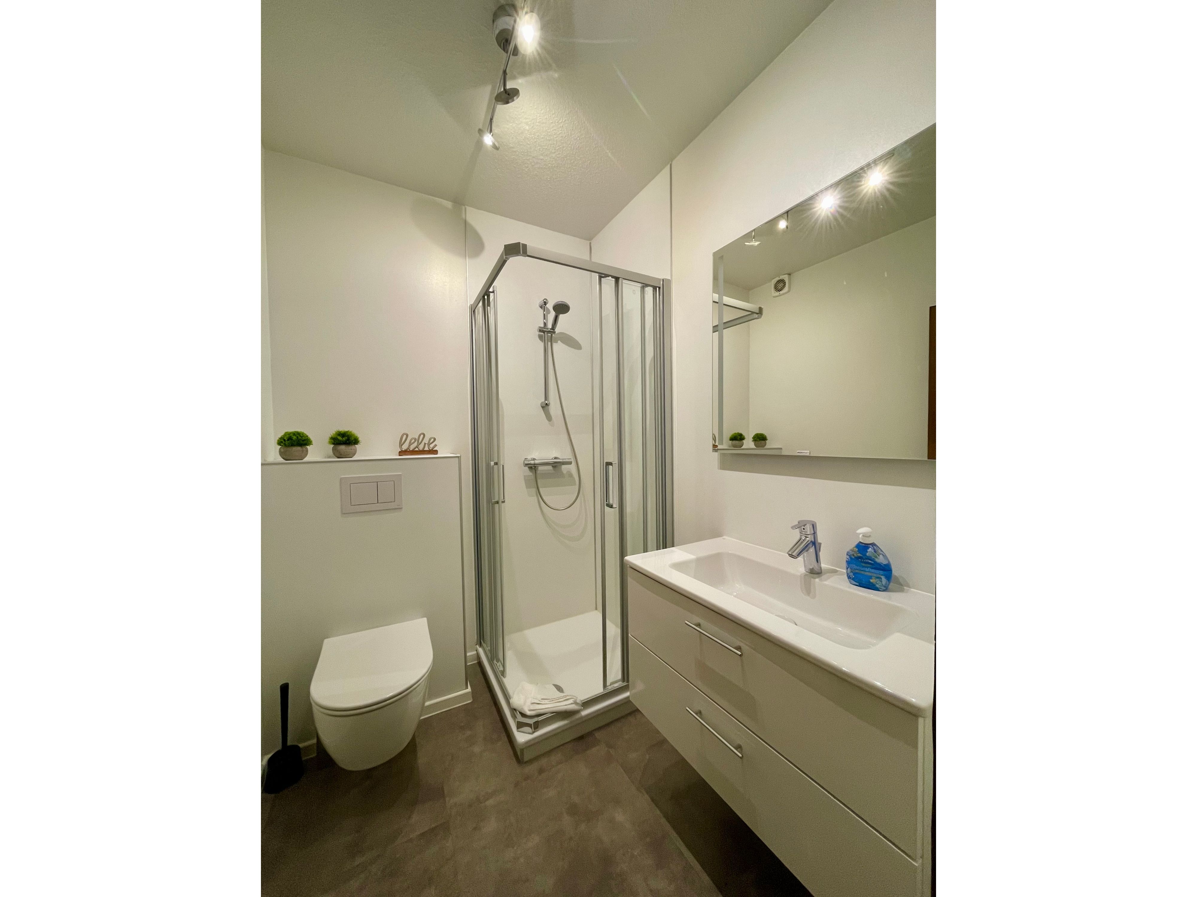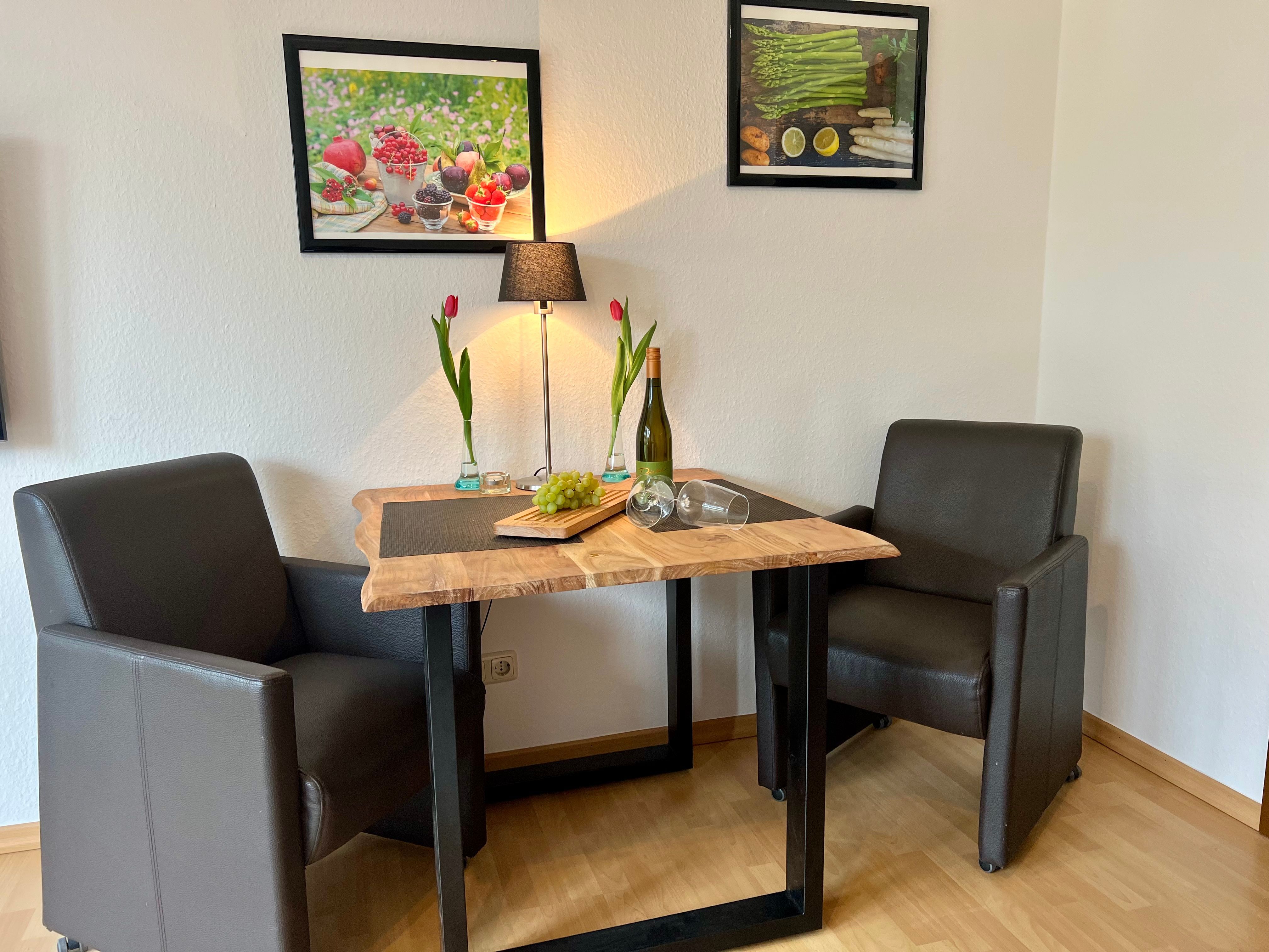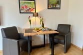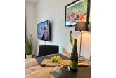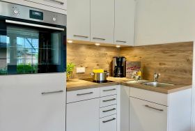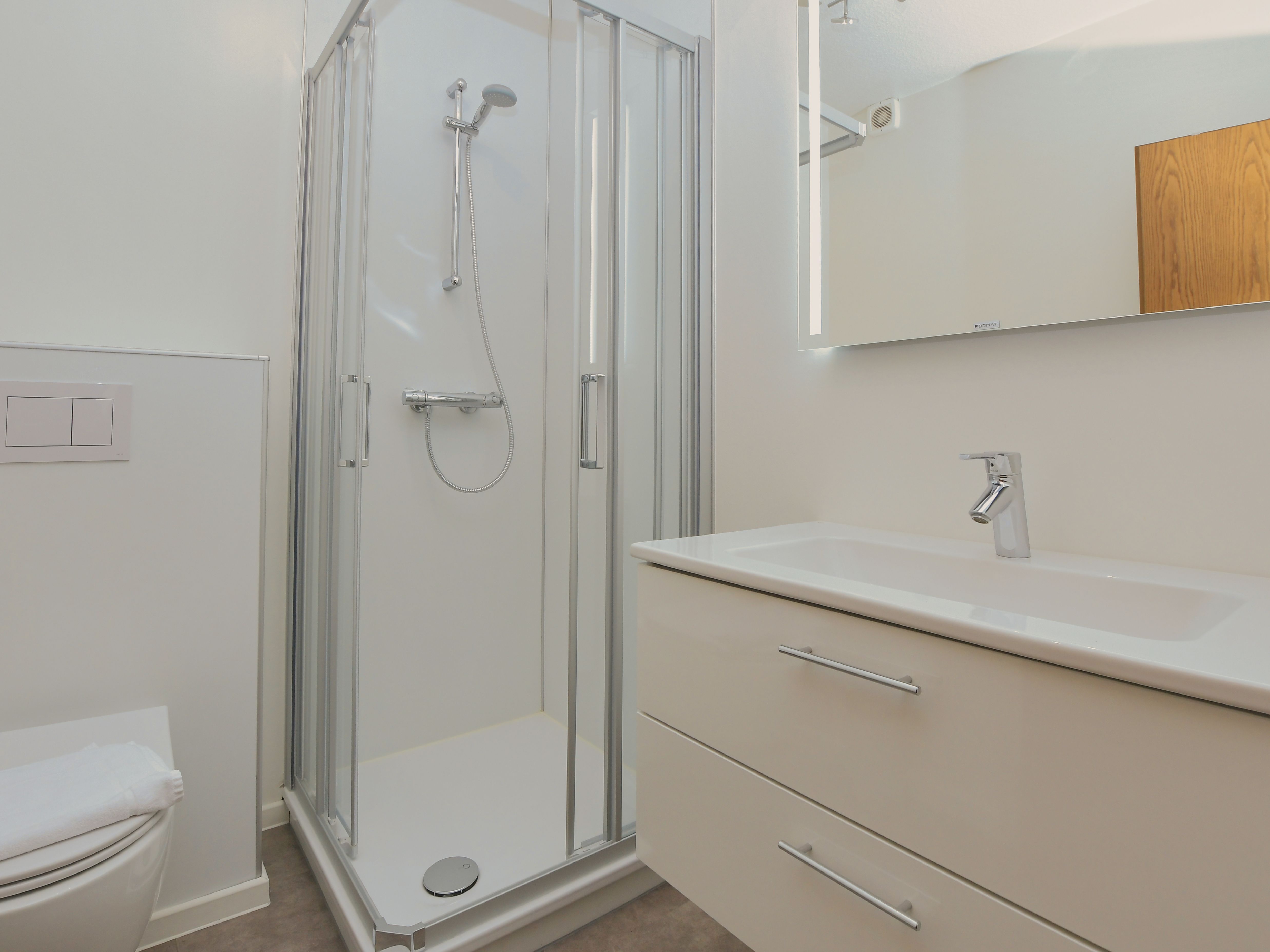 CA. 41 QM FÜR 2 PERSONEN + 1 KIND, MIT TERRASSE Wohnraum mit Schlafcouch, 1 Sessel, Essbereich mit Stühlen, SAT-TV, Laminatböden. Terrasse mit Strandkorb und Gartenmöbel Schlafraum mit 2 Einzelbetten, 2 Nachttischen, großem Kleiderschrank, Wertfach Küchenzeile mit 2 Platteninduktionsherd, Geschirrspüler, Spüle, Kühlschrank, Geschirr und Hausrat, Kaffeemaschine, Wasserkocher und Toaster Dusche/WC, Waschbecken, Spiegelschrank, Föhn. Fahrräder können in eine Garage gestellt werden.