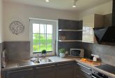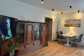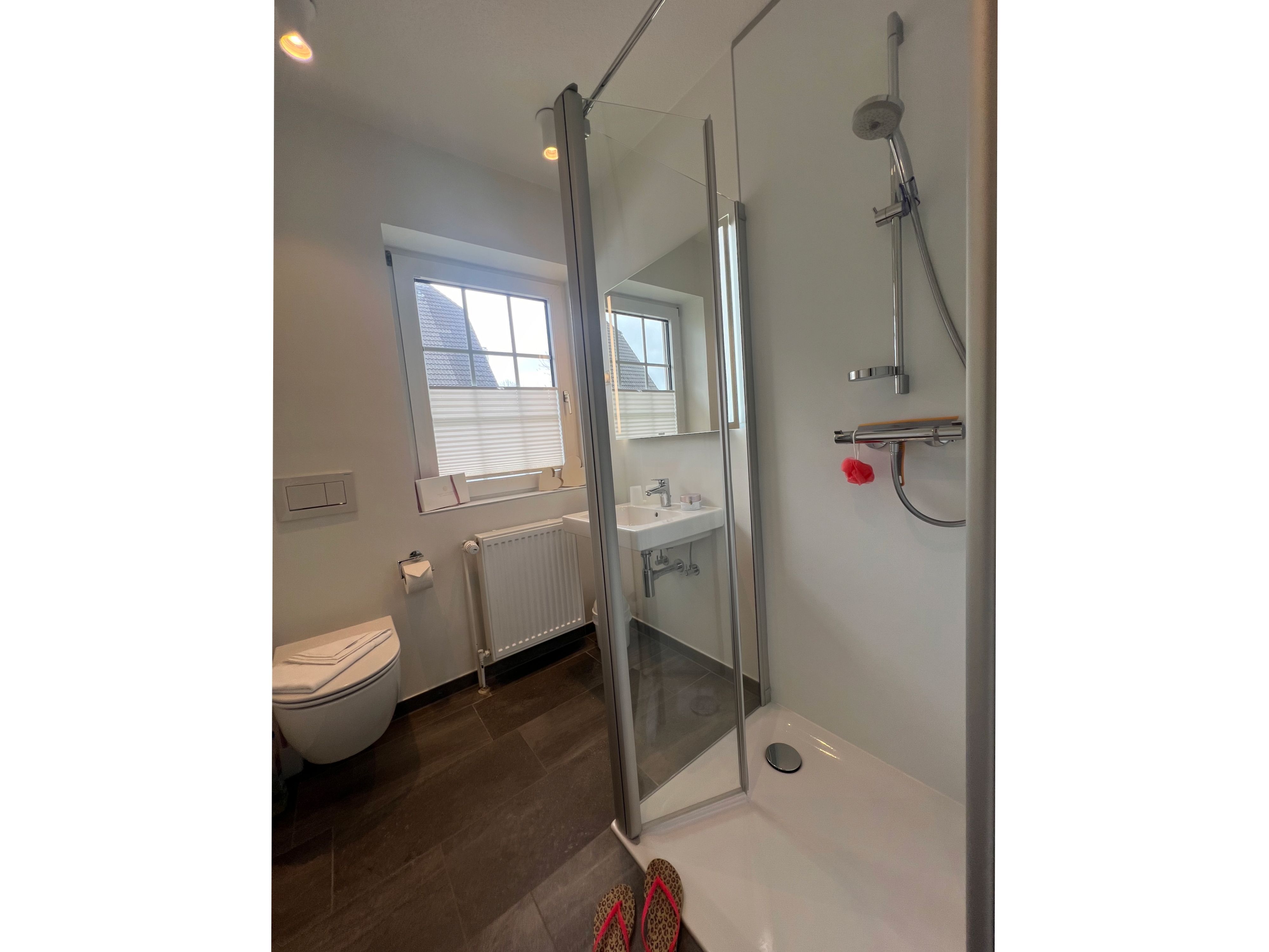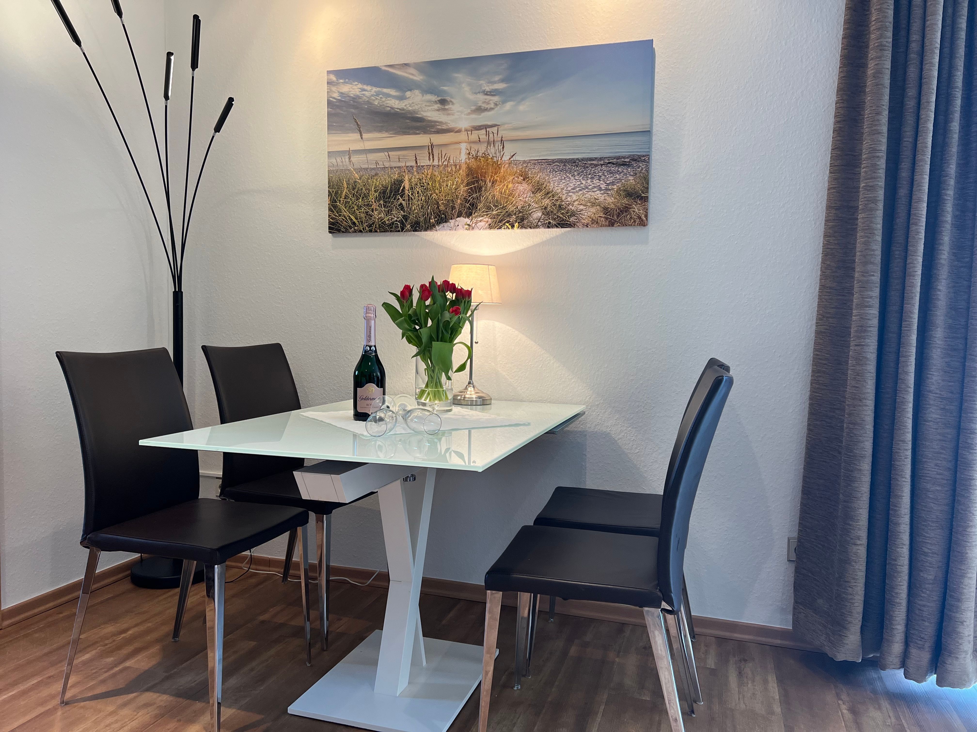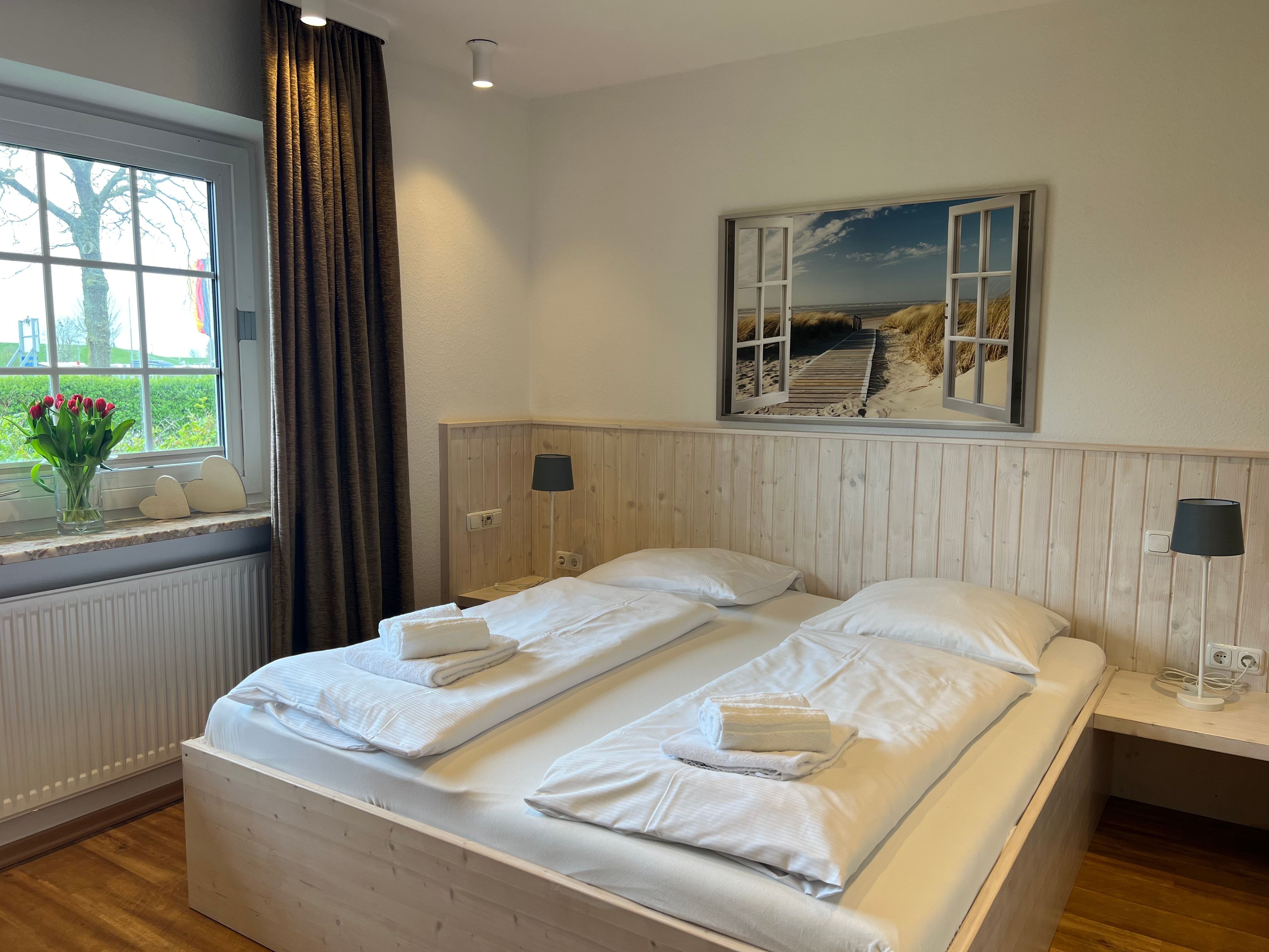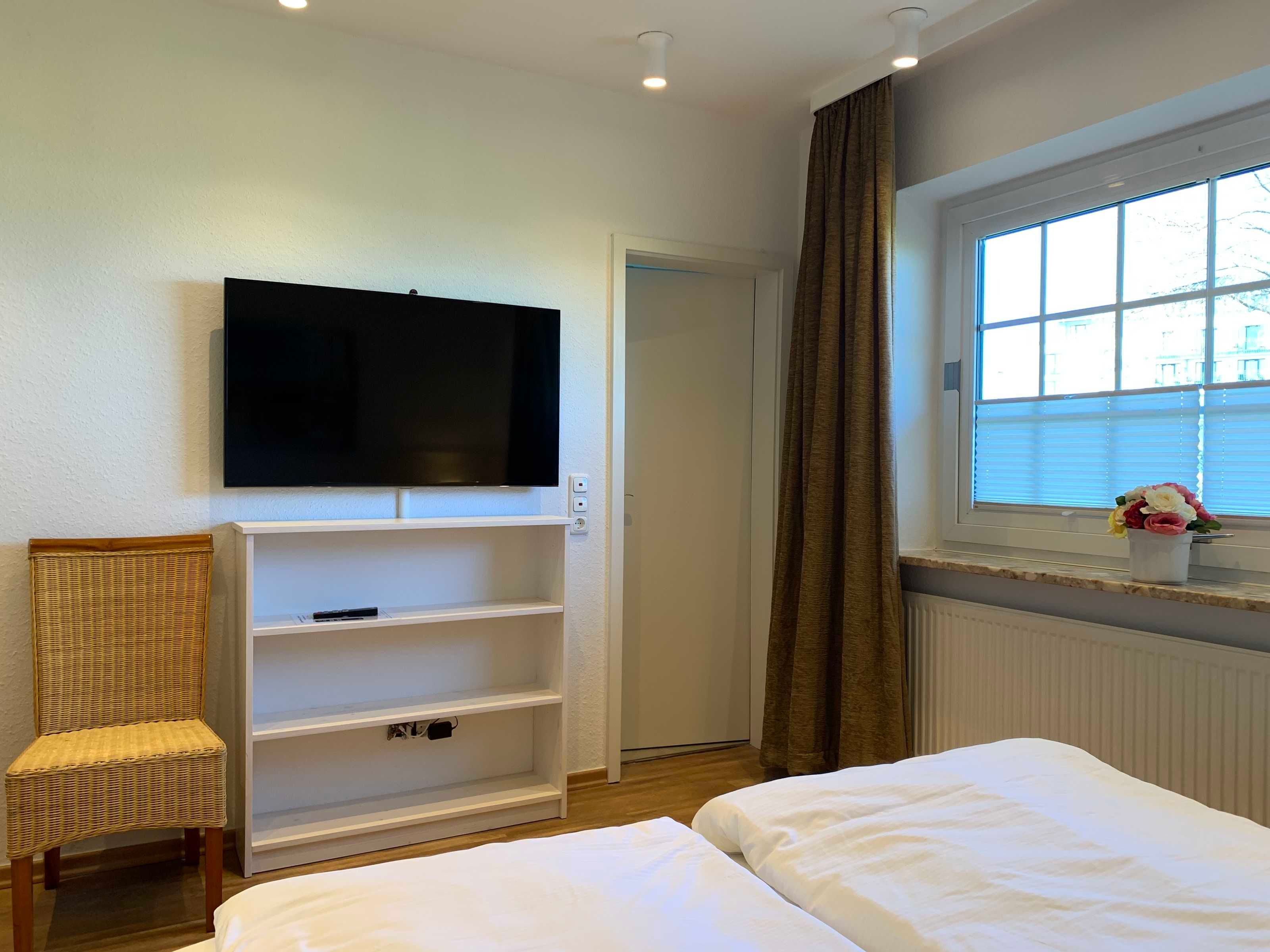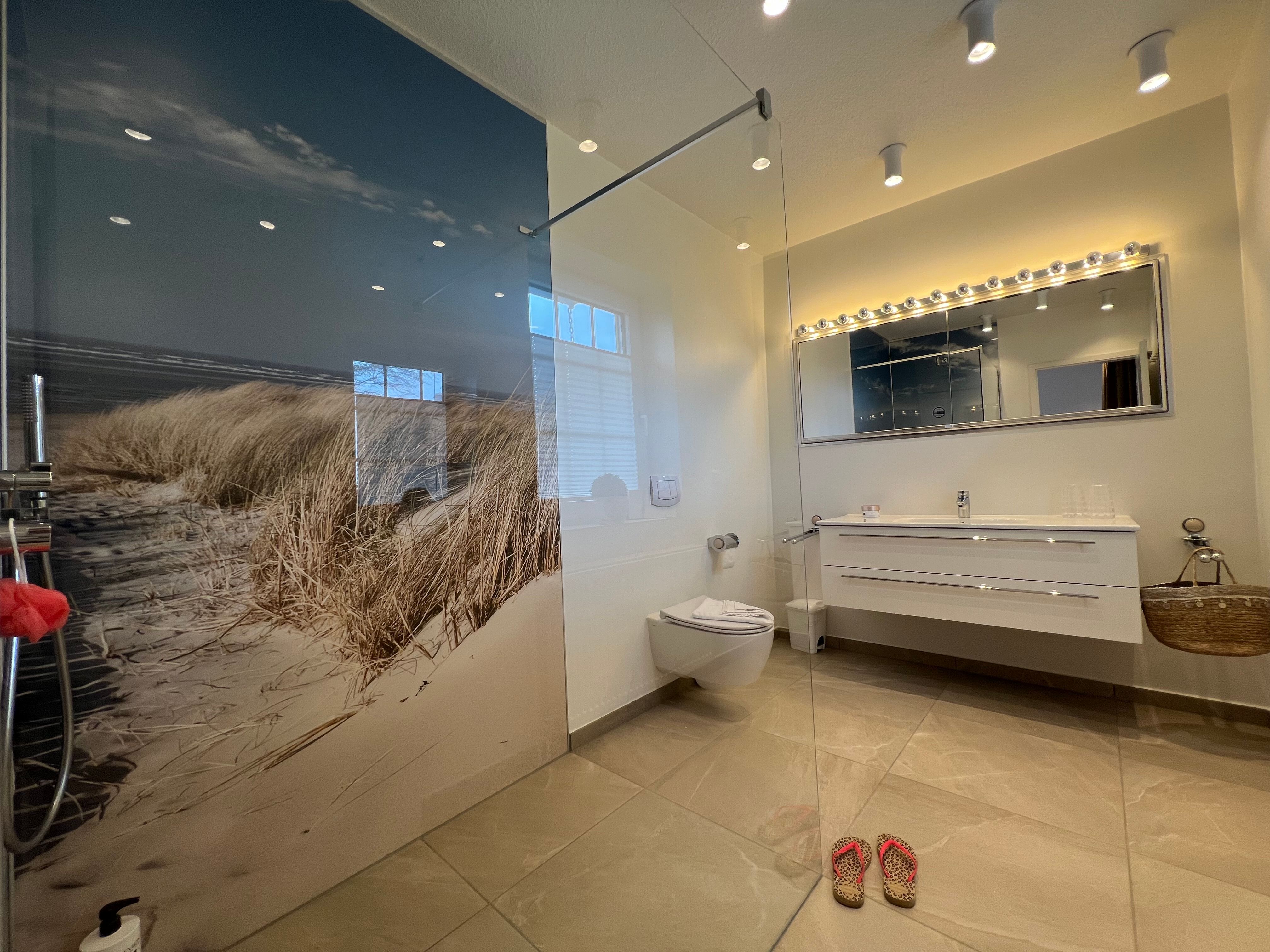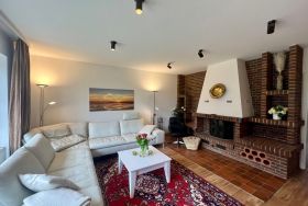 3-RAUM LUXUS-FERIENWOHNUNG, CA. 90 QM FÜR 2-4 PERSONEN Wohnraum mit Wohnzimmerschrank, Couchgarnitur, 1 Sessel, SAT-Smart-TV, Stereoanlage, Deckenstrahler, Laminatböden, hochwertige Teppiche, große Kaminwand, Terrasse mit Strandkorb und Gartenmöbel 1 Schlafraum mit Doppelbett, 2 Nachttischen, SAT-Smart-TV, großem Kleiderschrank, Wertfach 1 Schlafraum mit 2 Einzelbetten, großem Nachttisch, Kleiderschrank Separate Küche mit Essecke: Küchenzeile mit 4 Platteninduktionsherd inkl. Backofen, Spüle, Kühlschrank, Abzugshaube und Geschirrspülmaschine, Geschirr und Hausrat, Kaffeemaschine, Mikrowelle, Wasserkocher und Toaster 1 großes Bad mit Erlebnisdusche, WC, Waschbecken, Spiegelschrank, Föhn 1 Bad mit Dusche, WC, Waschbecken und Spiegelschrank
