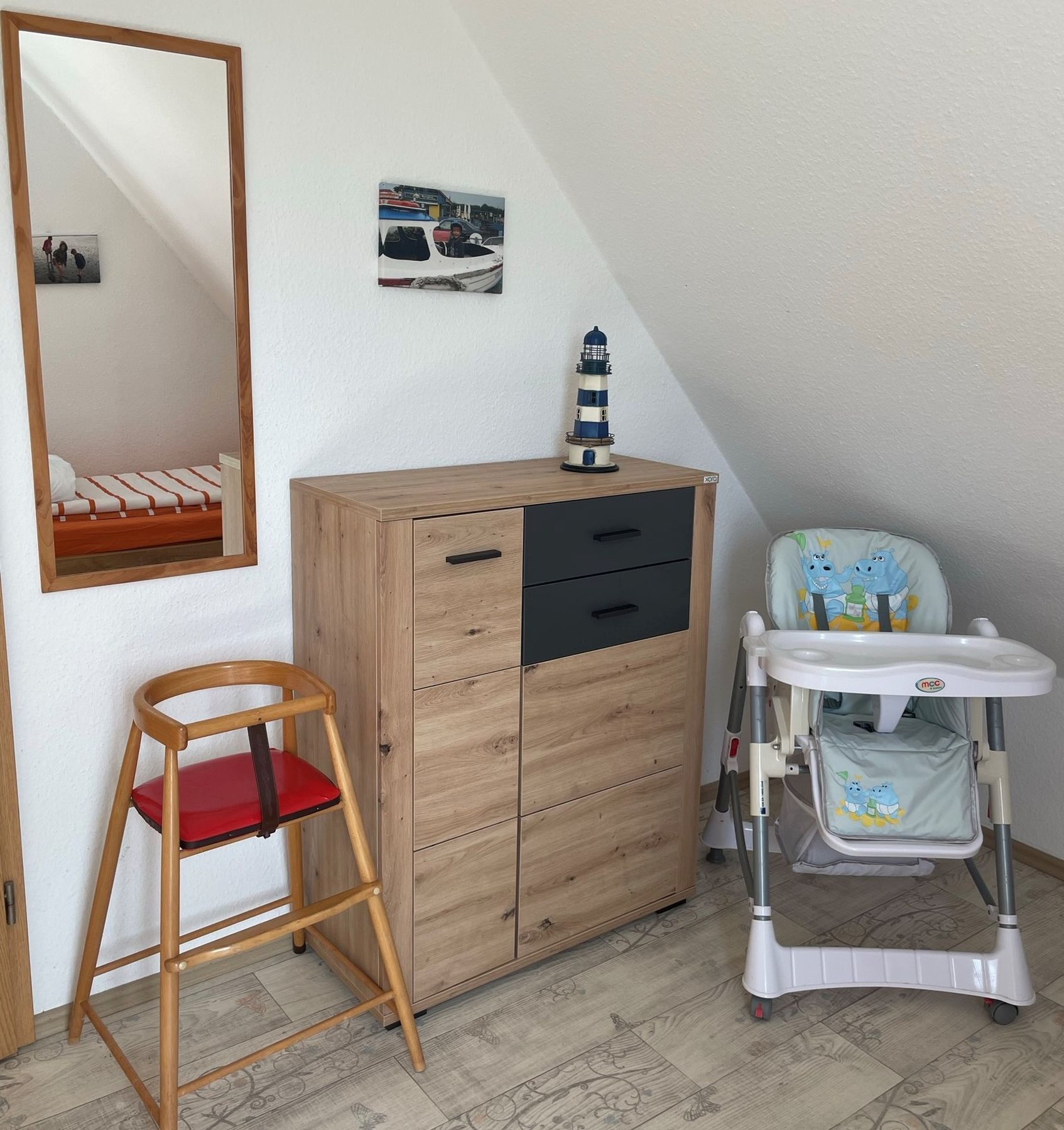 • 1 Schlafraum mit 1 Bett und Kinderbett und Wickelkommode (1. Stock)