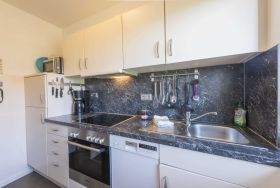 • kleine Küche (ohne Tür zum Flur) mit Mikrowelle, E-Herd (4 Platten), Backofen und Geschirrspülmaschine