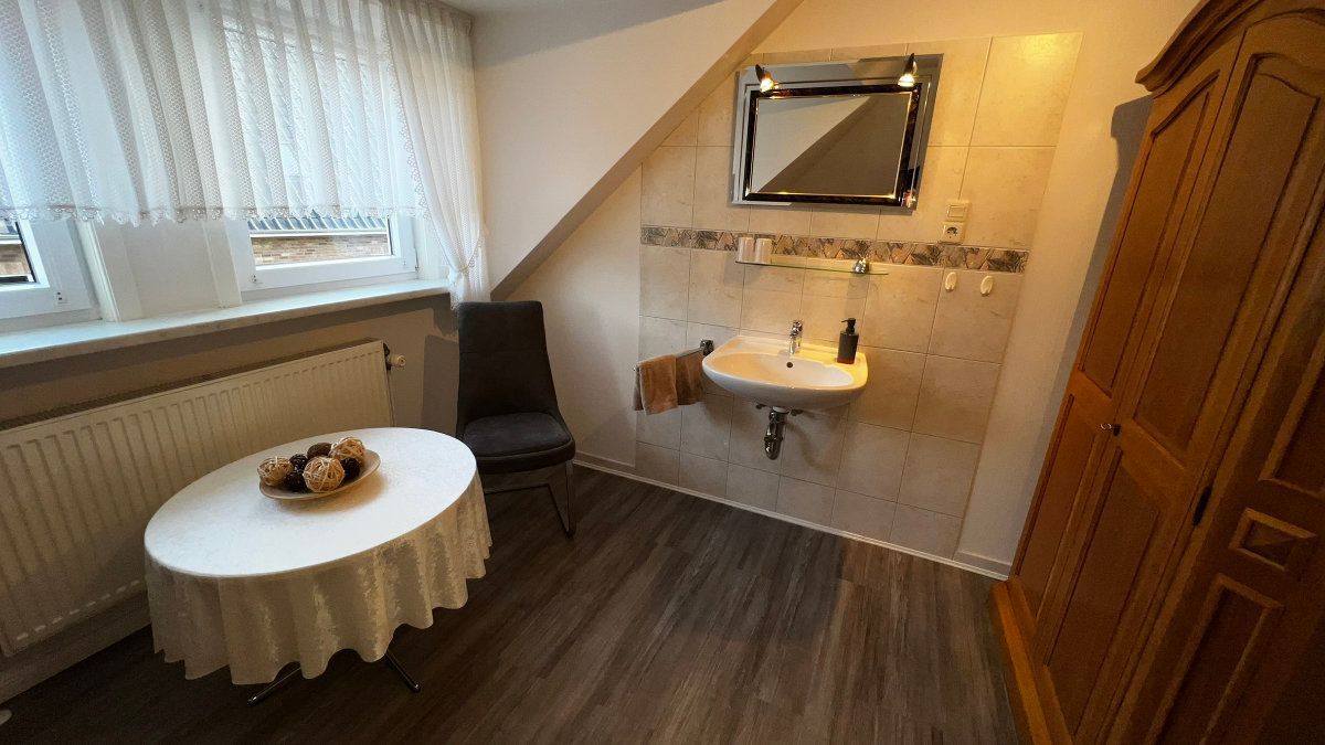 Unser Einzelzimmer ist ebenerdig und mit einer Waschgelegenheit und einem Fernseher ausgestattet.