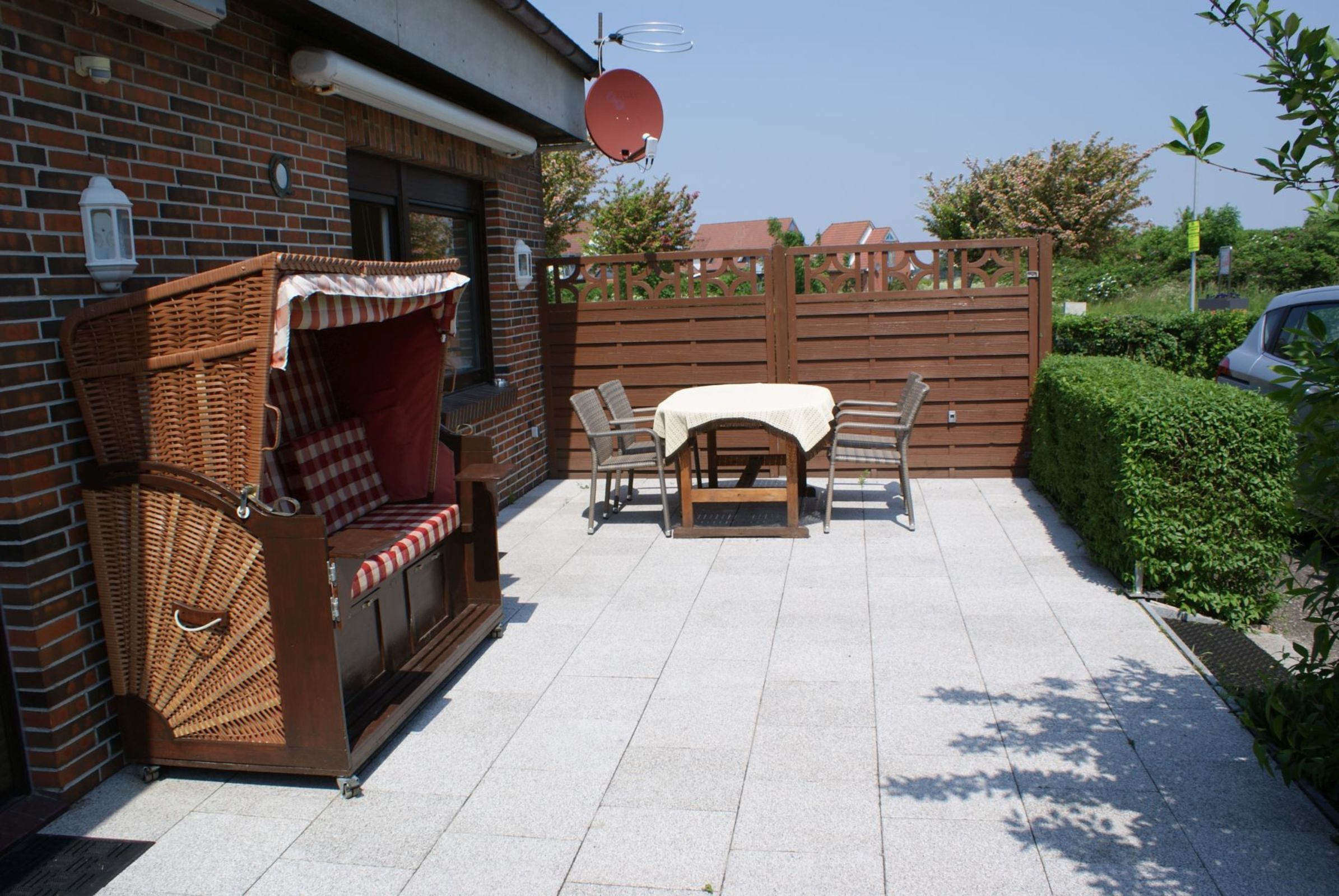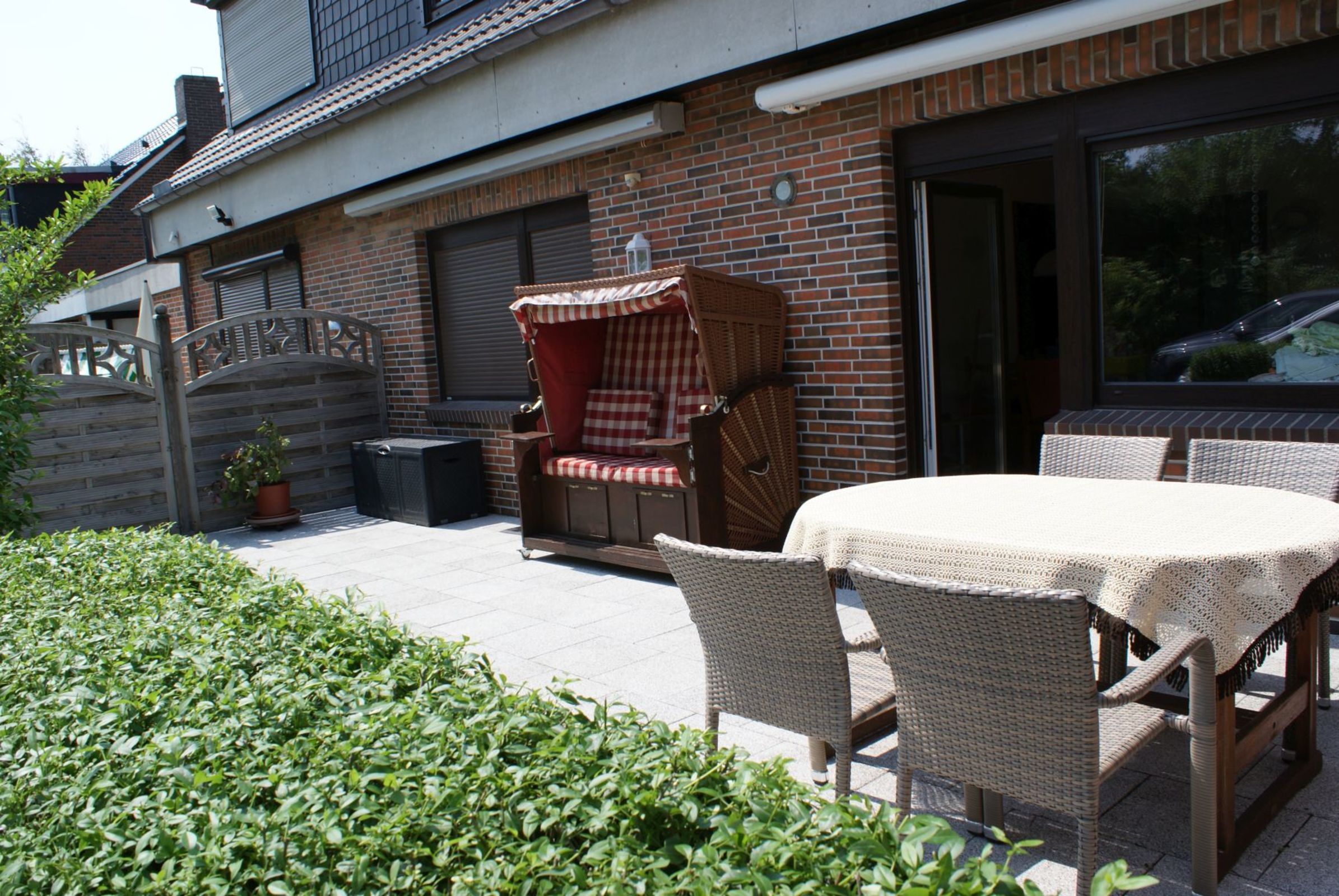• 29 qm große Terrasse mit Strandkorb, Gartenmöbel und Markise