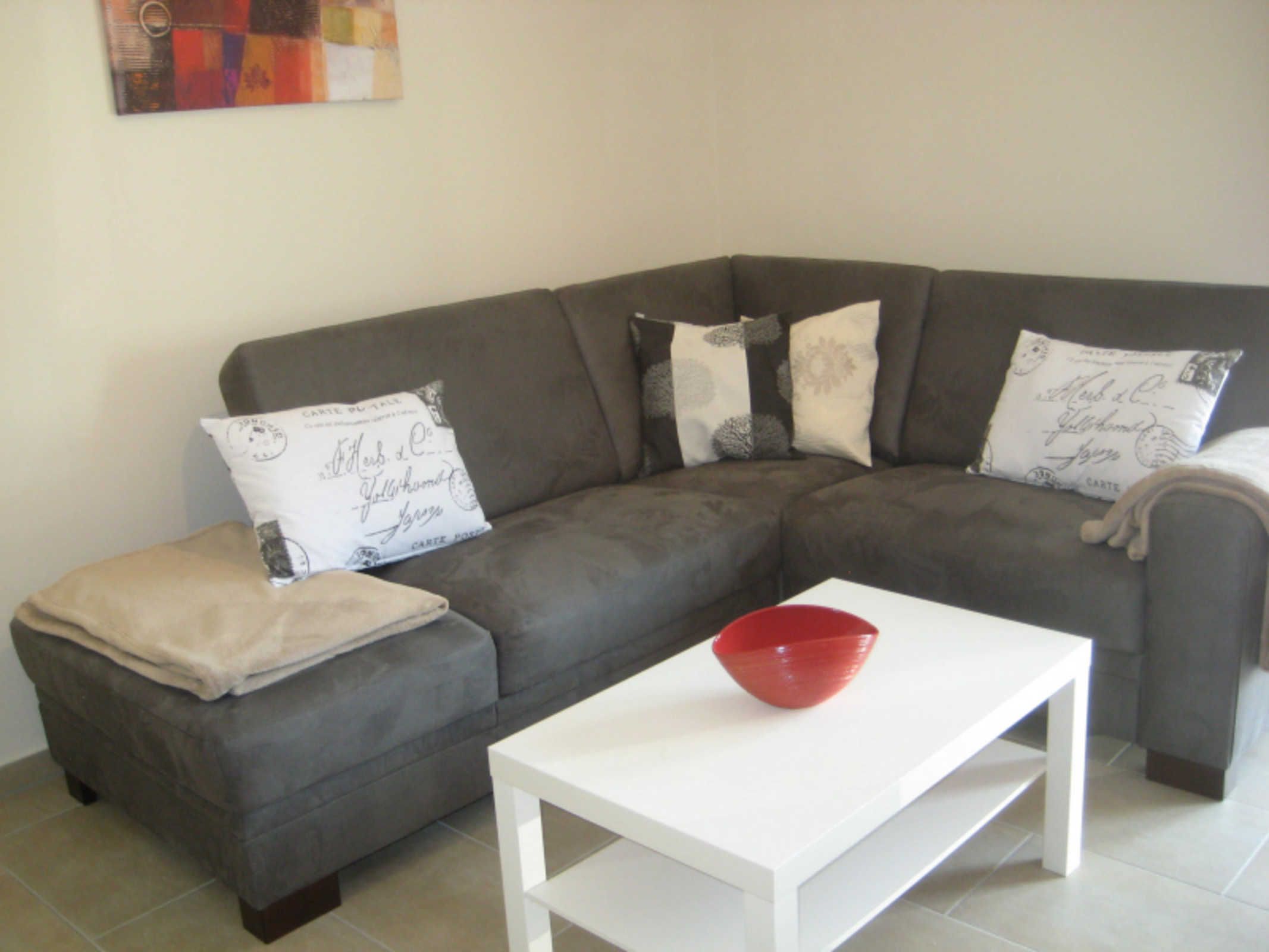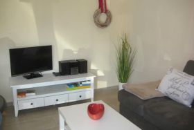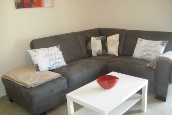 • Das Wohnzimmer besticht durch seine großen bodentiefen Fenster mit Zugang zur Terrasse ohne Bodenschwelle. Ein Flachbildschirm-TV mit SAT-Empfang sowie eine HiFi-Stereoanlage stehen zur Verfügung.