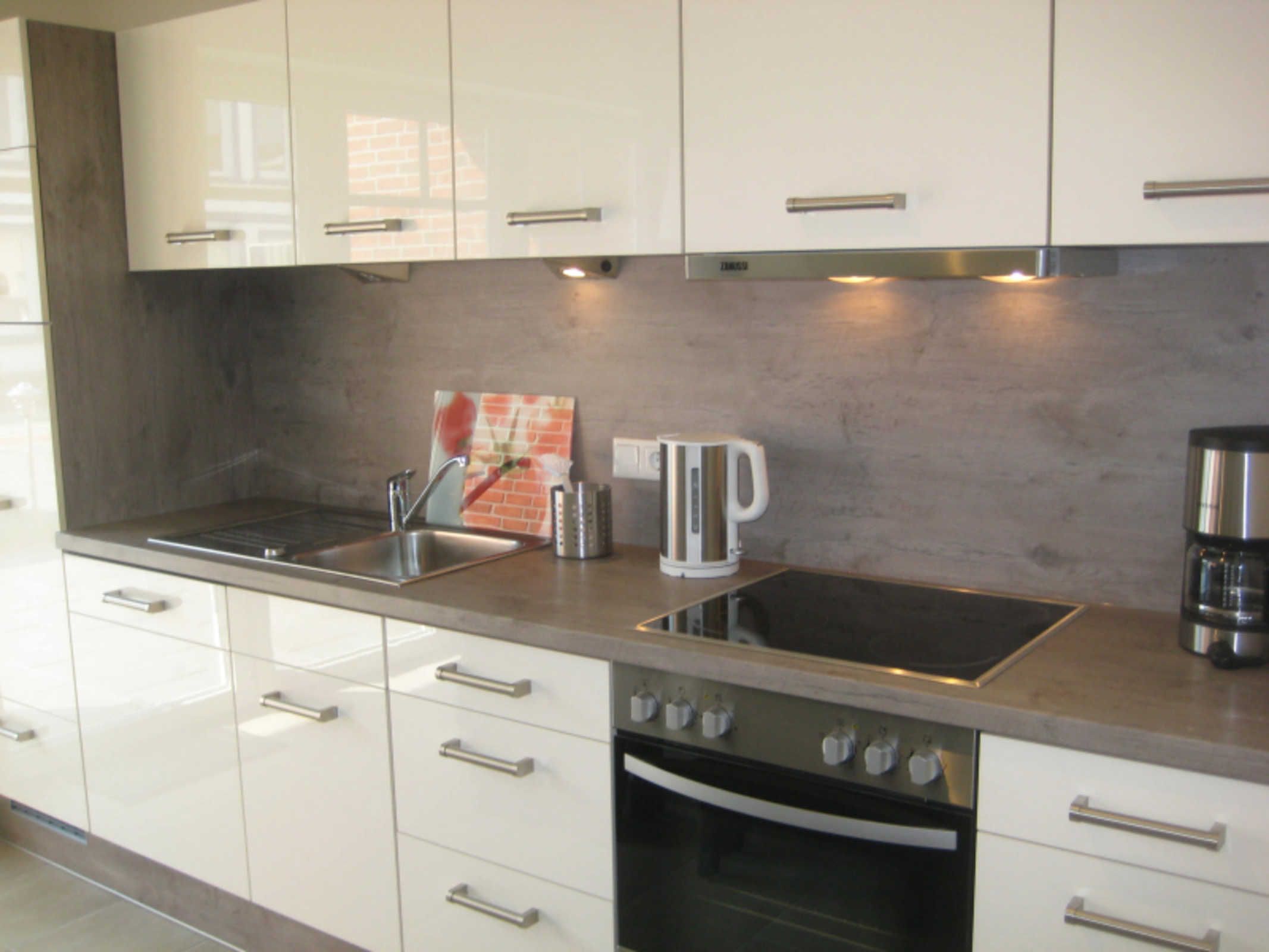 • Im Wohnzimmer integriert ist eine vollständig ausgestattete Küchenzeile. Sie verfügt über ein Cerankochfeld mit Backofen, Geschirrspülmaschine, Kühlschrank mit Tiefkühlfach, sowie Kaffeemaschine, Wasserkocher und Toaster. Geschirr und Hausrat sind selbstverständlich ausreichend vorhanden.