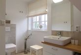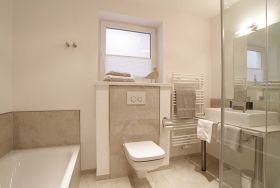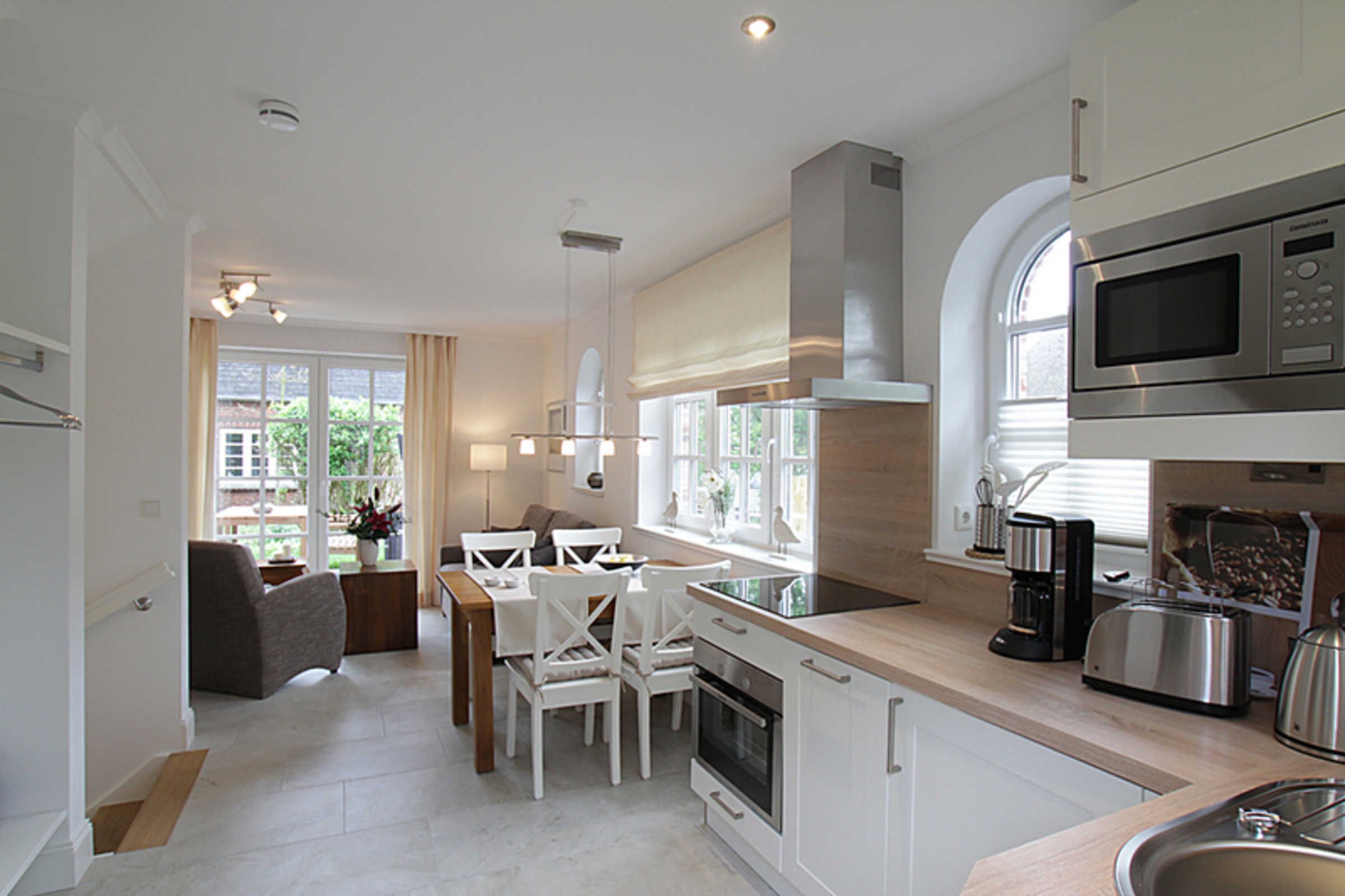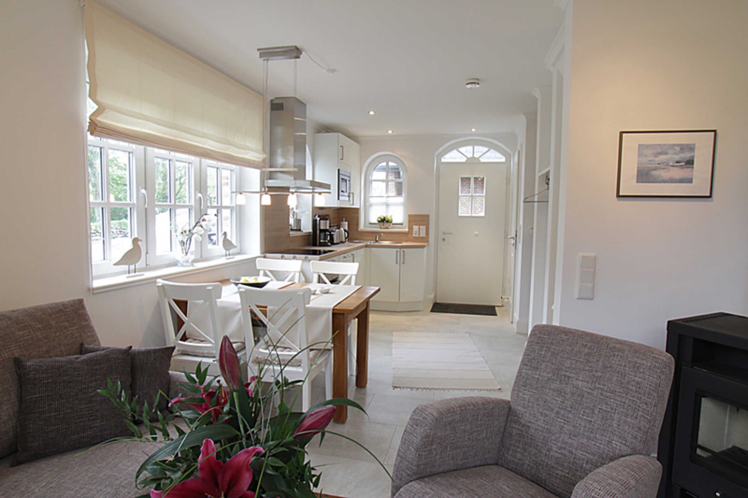 RUHIG, ZENTRAL GELEGEN und CHIC! Reihenendhaus mit möblierter TERRASSE nach Westen, KAMINOFEN und schöner Ausstattung. Bis 4 Personen. Mit elegantem und gemütlichem Wohnbereich mit Einbauküche und Eßplatz, 2 modernen Bädern (eins mit Wanne und Dusche, eins mit Dusche) und zusätzlichem Gäste-WC. Der Kaminofen sorgt in der Herbst- und Winterzeit für heimeliges Ambiente (für Brennholz muß - wenn Kaminofennutzung gewünscht ist - selbst gesorgt werden). Das Haus hat einen separaten Eingang und verfügt über einen Parkplatz vor dem Haus. Vom Haus aus können Sie das Ortszentrum (Friedrichstrasse) in ca. 10 Minuten und den Strand in ca. 15 Minuten zu Fuß erreichen (zum Strand sind es ca. 1,2 km). 56 qm Wohnfläche.