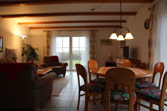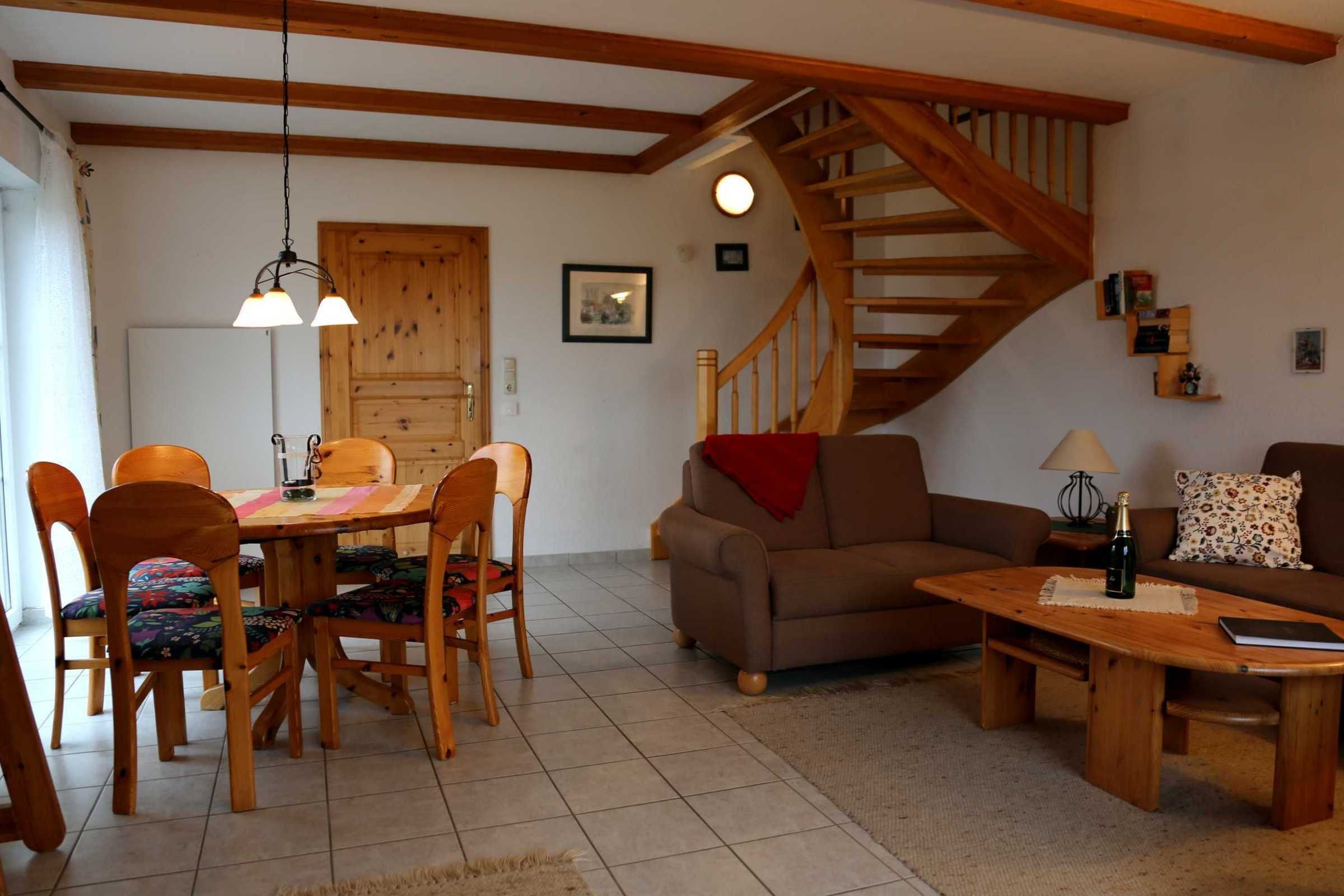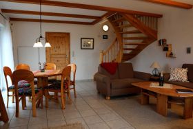 Erdgeschoß: Großer Wohnraum mit Sitzgruppe und Eßtisch, LCD-TV, Radio.