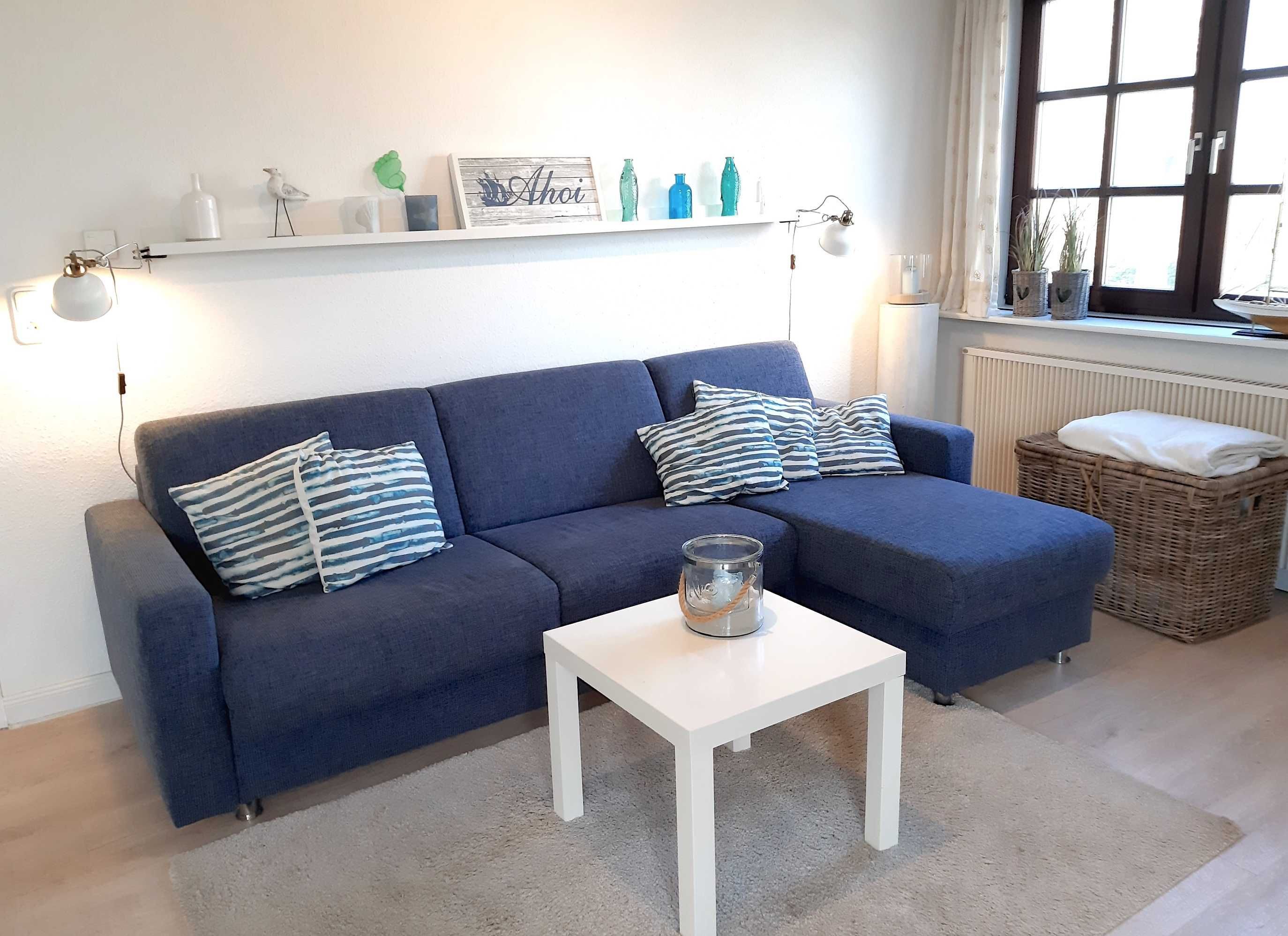 Die ganze Wohnung ist mit nordisch rustikal anmutendem Fußboden ausgelegt und nordseemäßig unaufdringlich mit maritimen Elementen dekoriert.