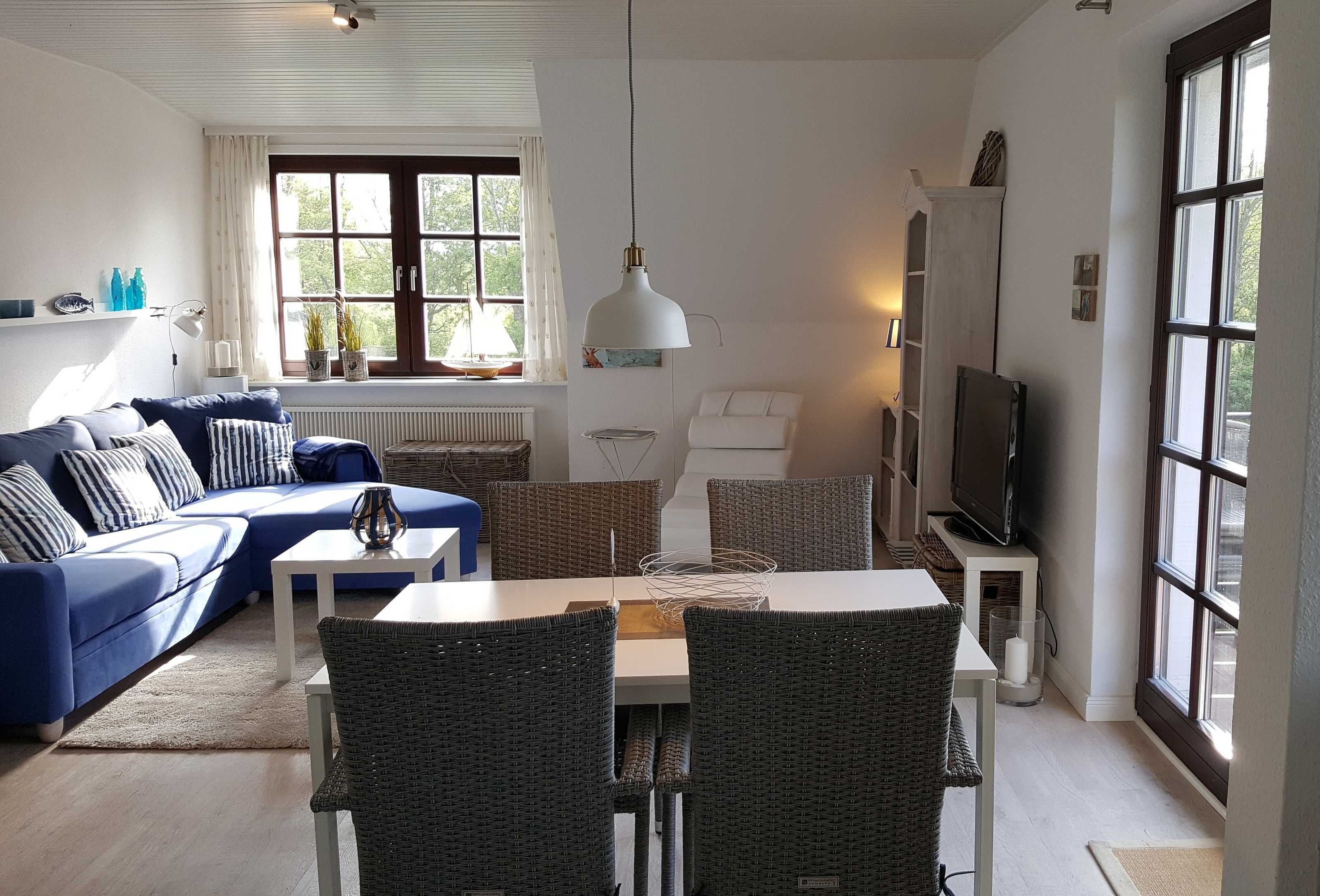 SEEWOLKE N° 2 besteht aus einem Wohn-/Esszimmer mit neuem, ganz modernem Schlafsofa (1,40 x 2,00 m), einem Schlafzimmer mit Swiss-Flex Doppelbett, einer voll ausgestatteten offenen Küche mit Fenster mit 4 Platten Ceranfeld-Herd, Backofen, Geschirrspüler, Kühlschrank mit Gefrierfach und Mikrowelle sowie ausreichend hochwertigem Geschirr und Gläsern (8-fach) , Töpfen etc., einem Flur, einem komplett modernisierten Duschbad und einem praktischen Abstellraum mit Waschmaschine. Gegen störende Mücken in der Nacht befinden sich an vielen Fenstern Insektenschutzrahmen.