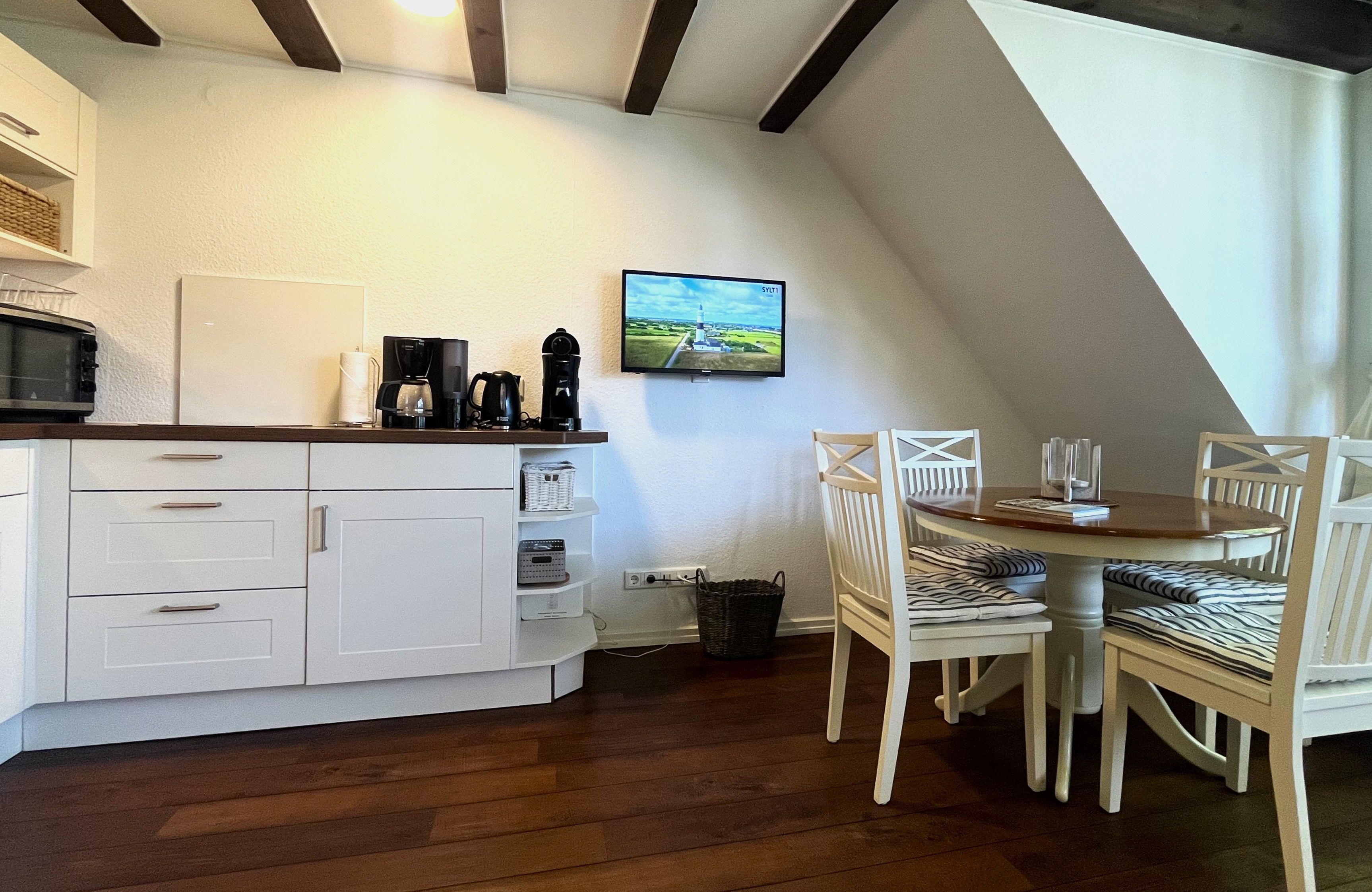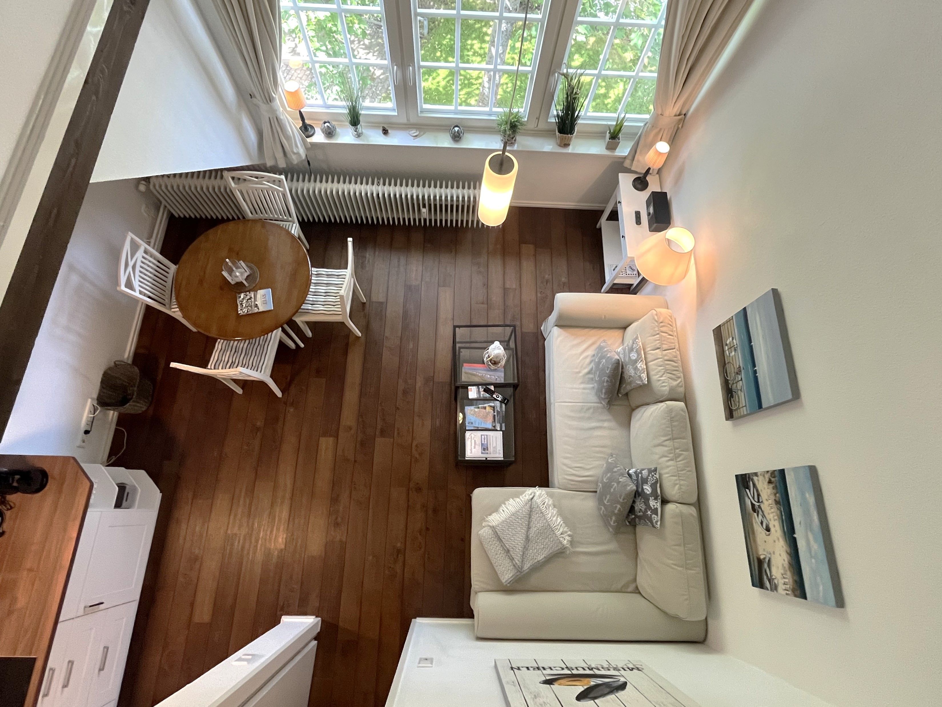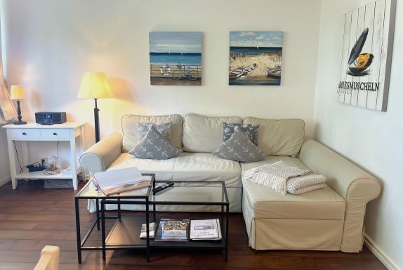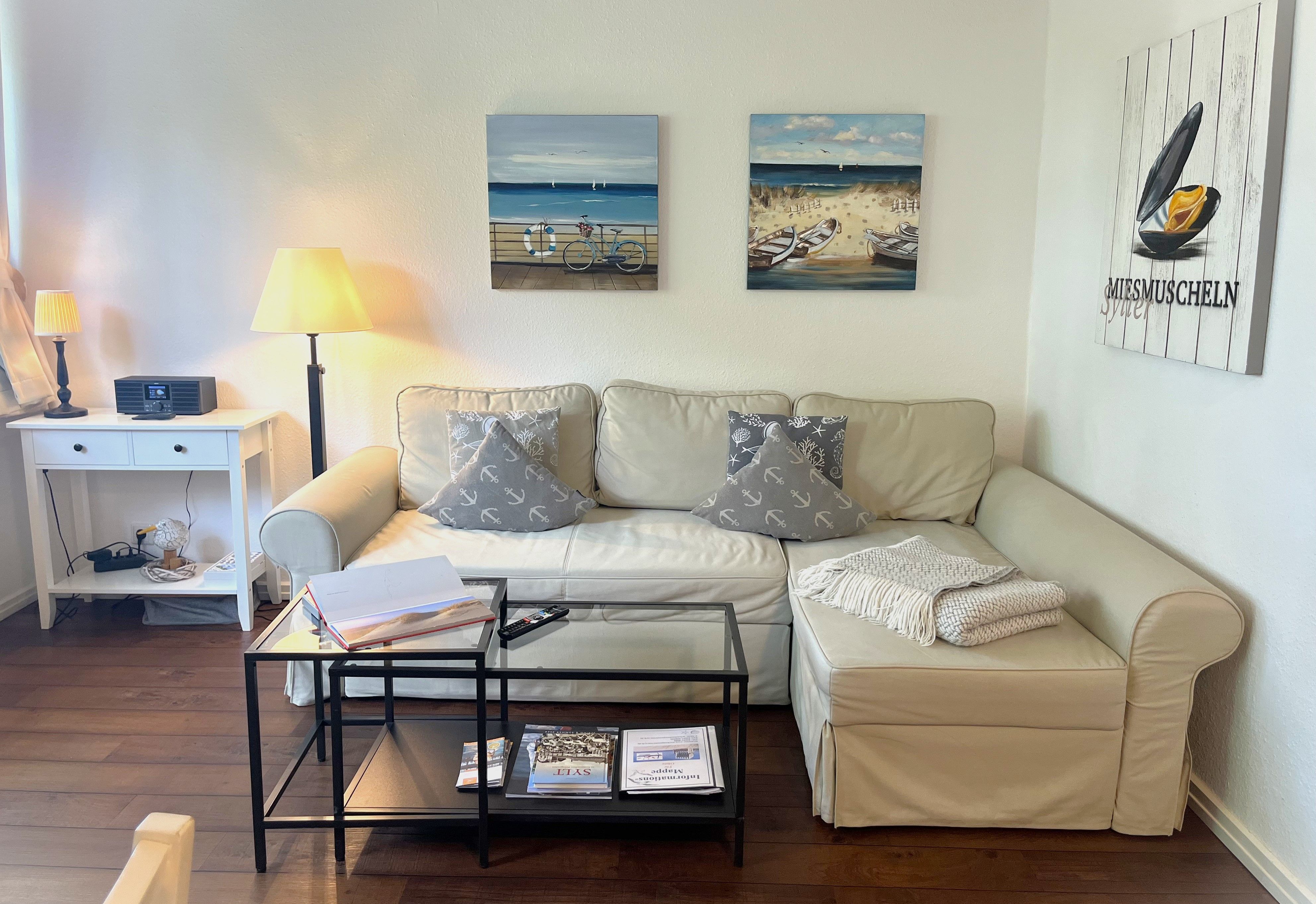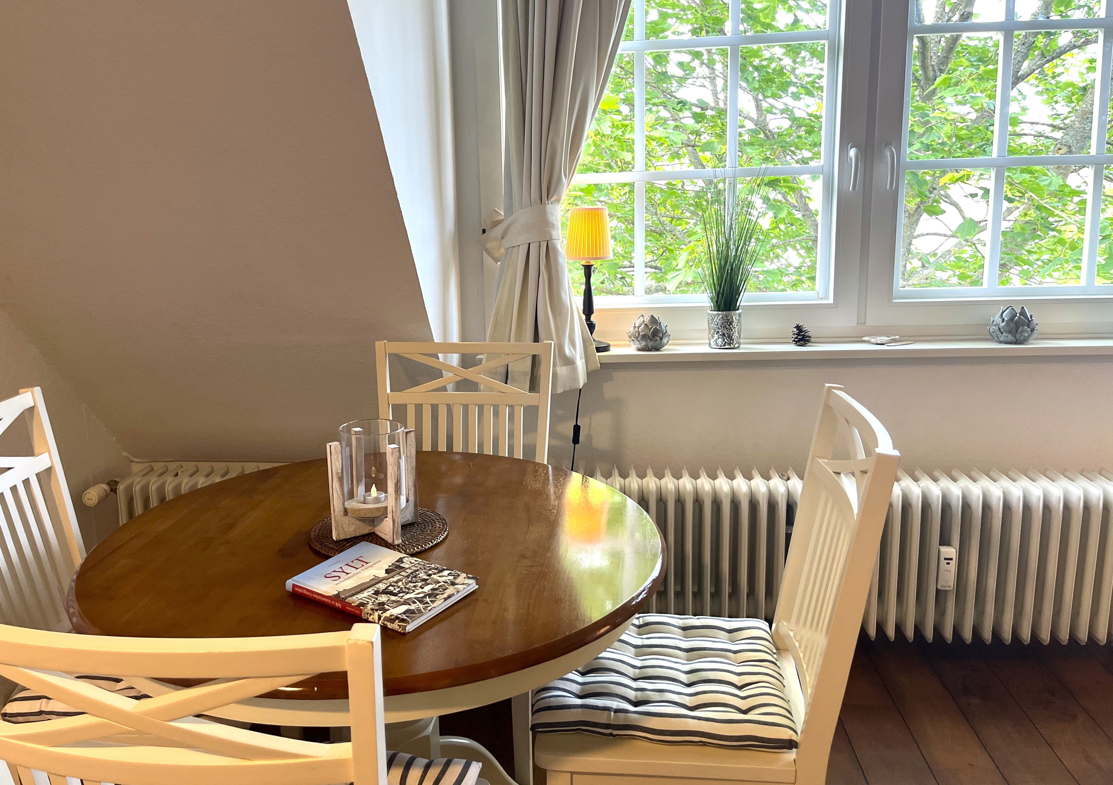 Ein gemütliches Wohnzimmer mit Blick durch große Sprossenfenster hinaus auf Bäume und reetgedeckte Häuser ist der Mittelpunkt der Wohnung - eingerichtet mit Essecke, Couchgarnitur, Flachbild-TV sowie einer Mini-Stereoanlage mit Internetradio und Bluetooth. Kostenloser Zugang ins Internet durch W-Lan ist gegeben.