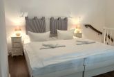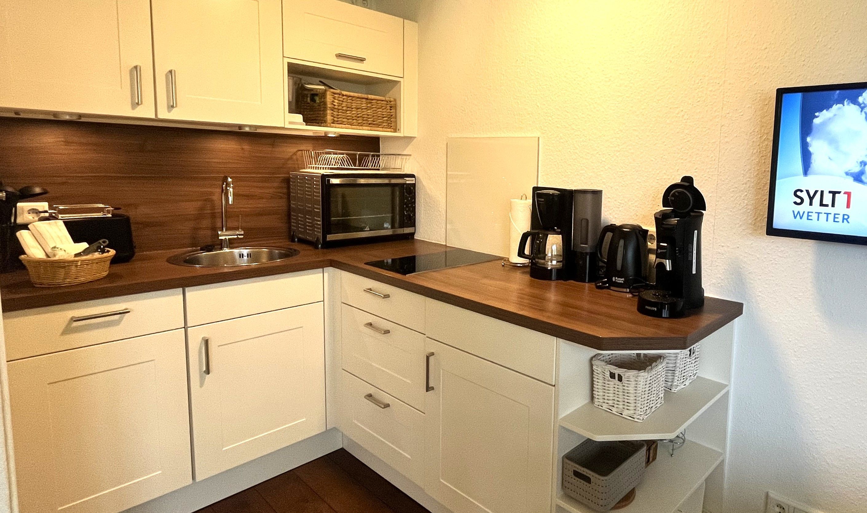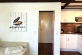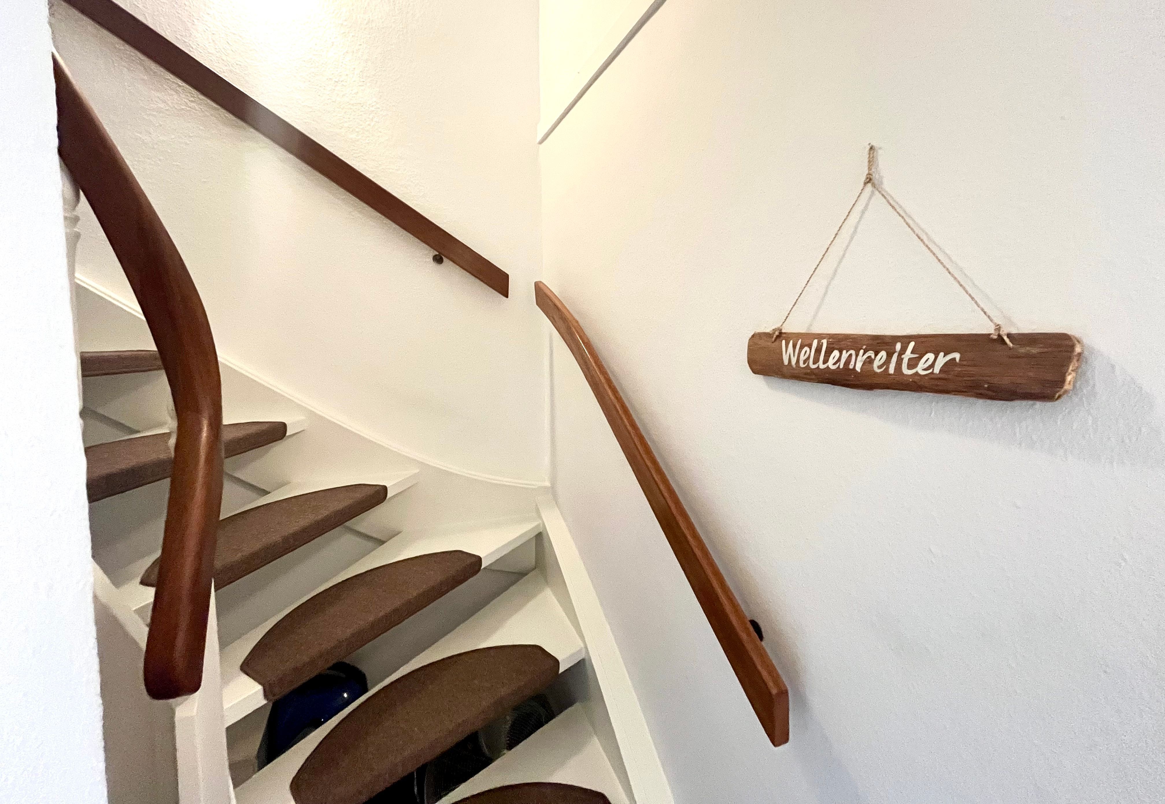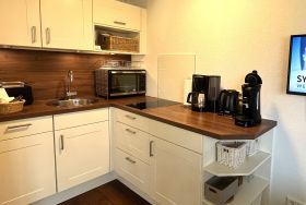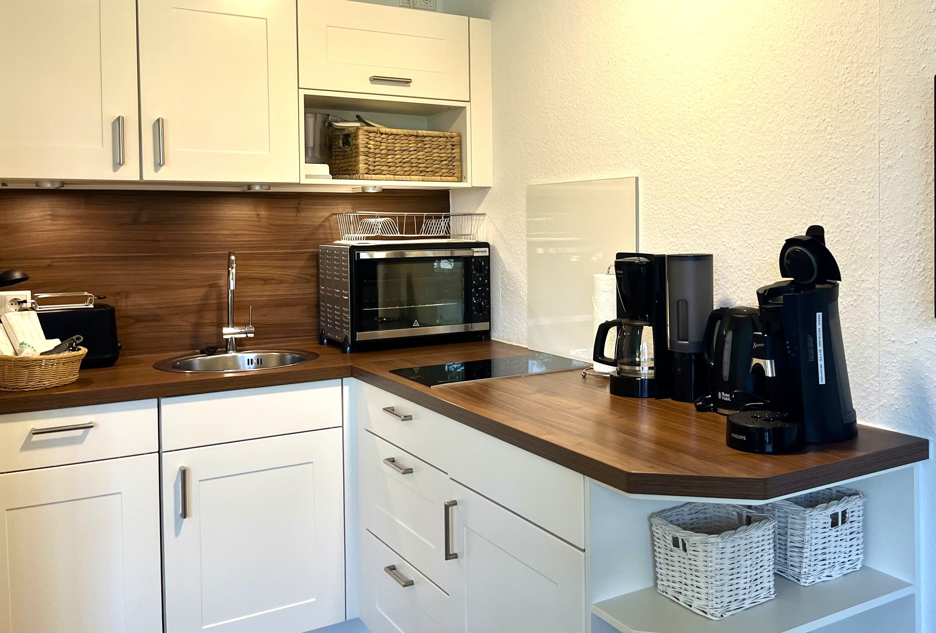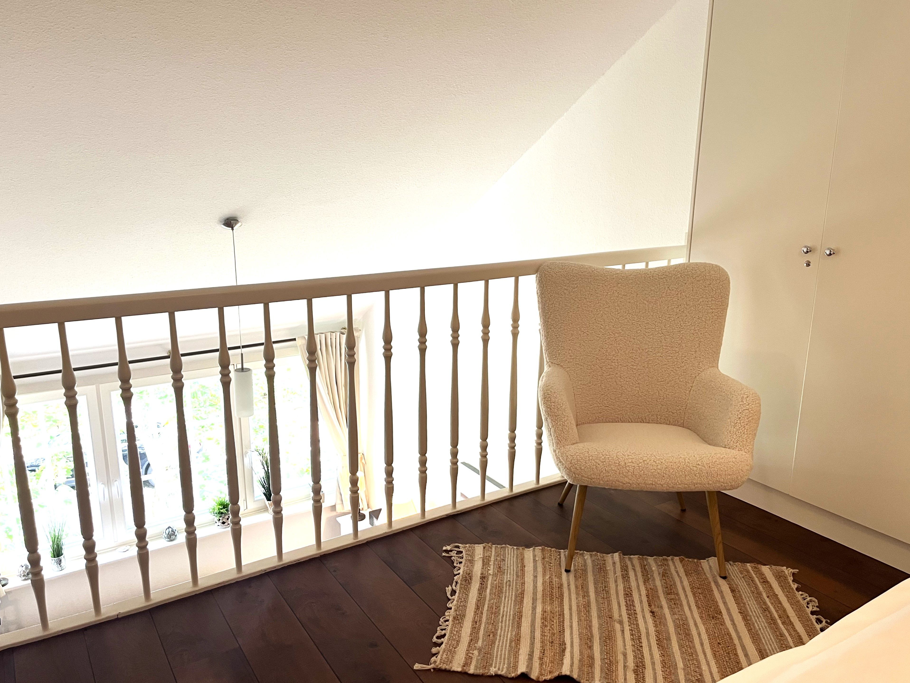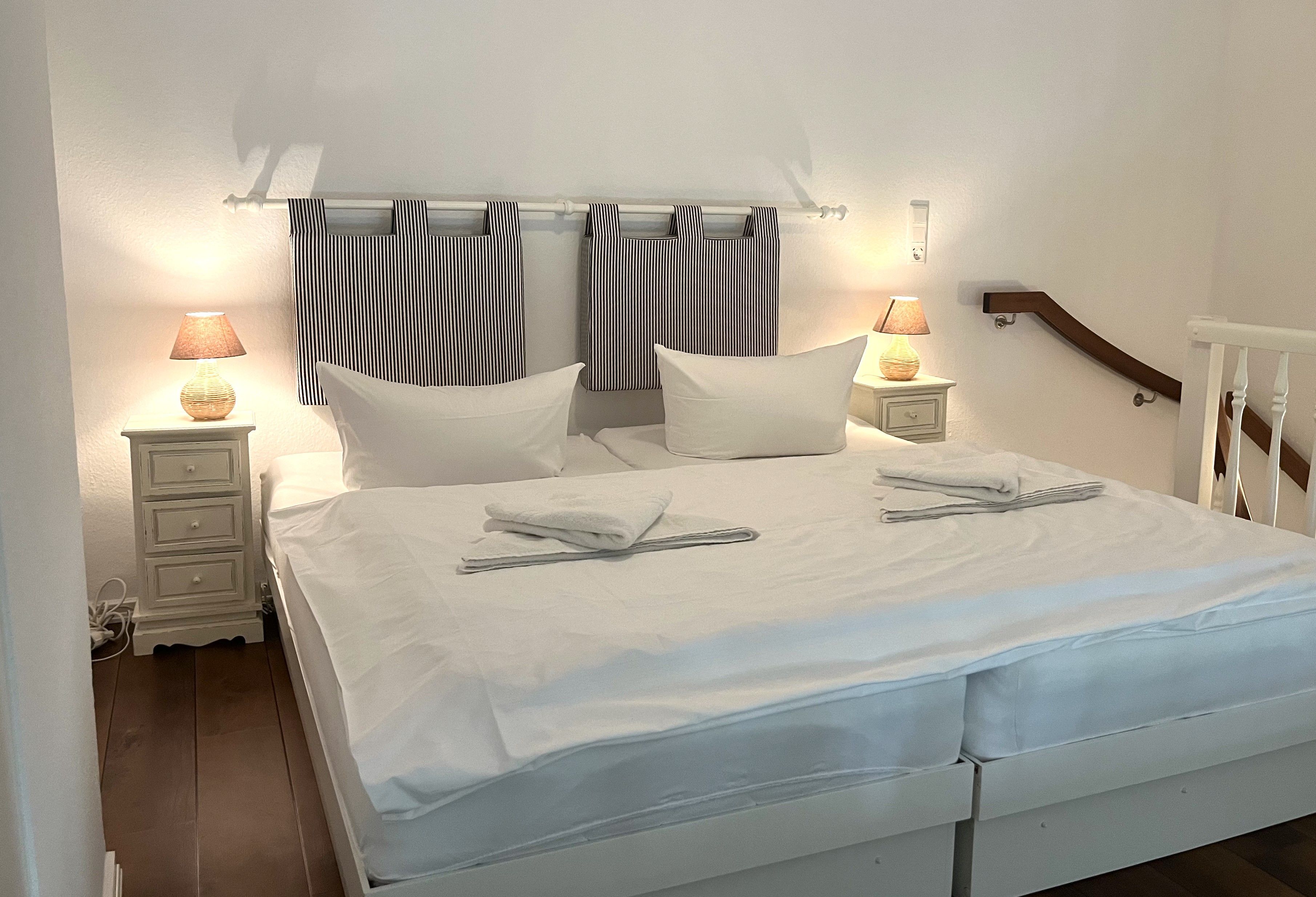 Die Küchenzeile ist ausgestattet mit 2-Platten-Cerankochfeld, Backofen, Geschirrspüler, Kühlschrank mit Gefriermöglichkeit, Kaffeemaschine (Filter+Senseo), Wasserkocher, Toaster, Pürier-/Rührstab, Eierkocher sowie Geschirr für den täglichen Bedarf. Über eine Holztreppe im Flur gelangt man bequem auf die offene Galerie (kein Spitzboden). Dort erwartet Sie ein behagliches Doppelbett (180x200) mit offenem Fußende, Nachttisch, Leselampen und ein begehbarer Kleiderschrank sorgt für reichlich Stauraum.