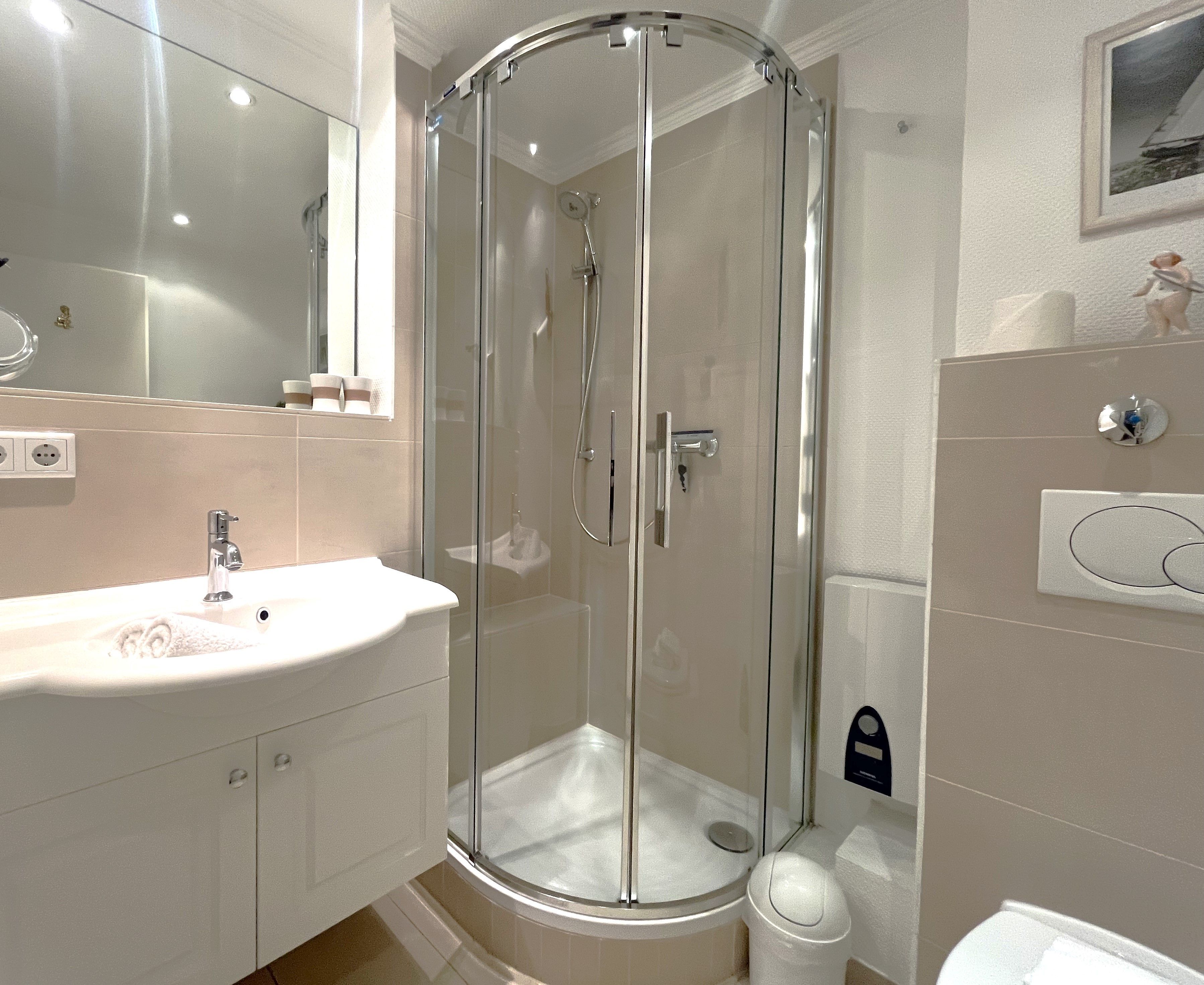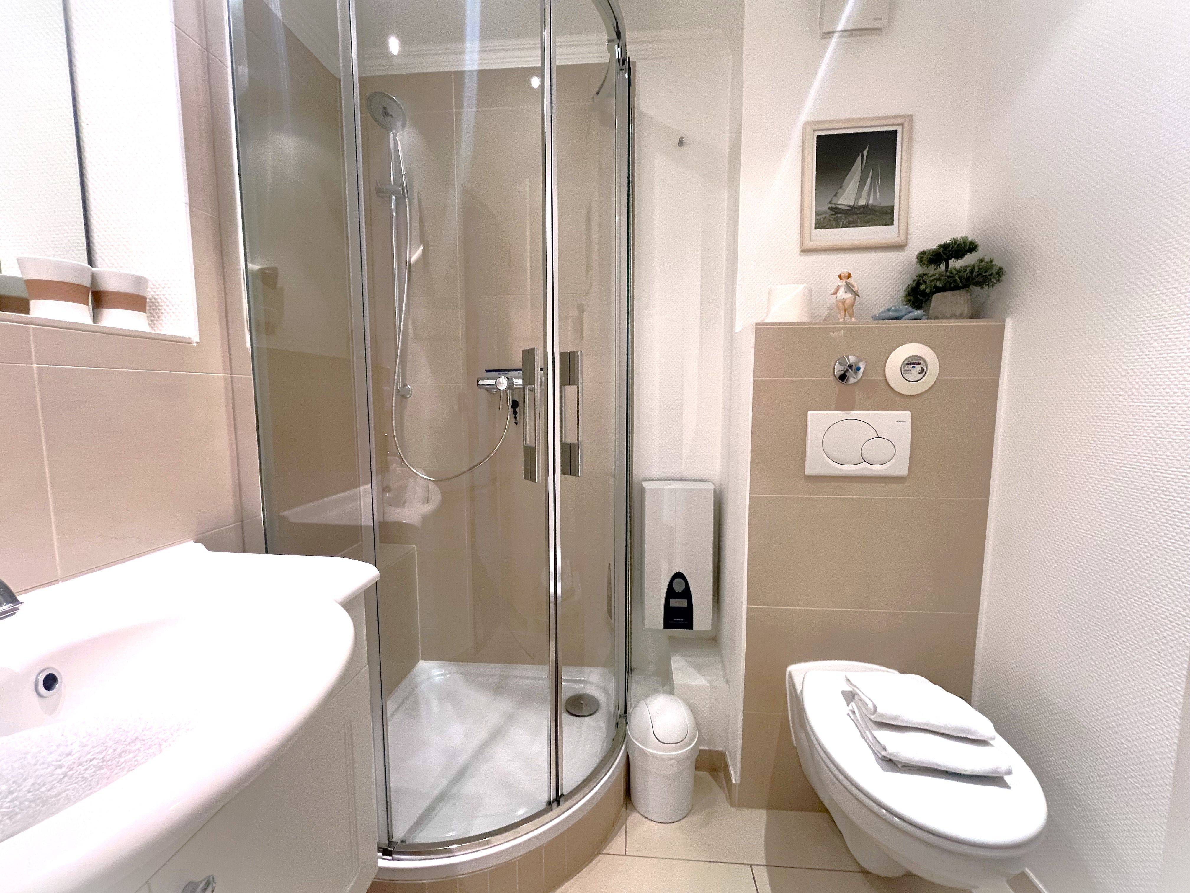 Ein helles, modernes Bad ist mit Waschtisch, Eckdusche, WC, Handtuchwärmer und Haartrockner ausgestattet.