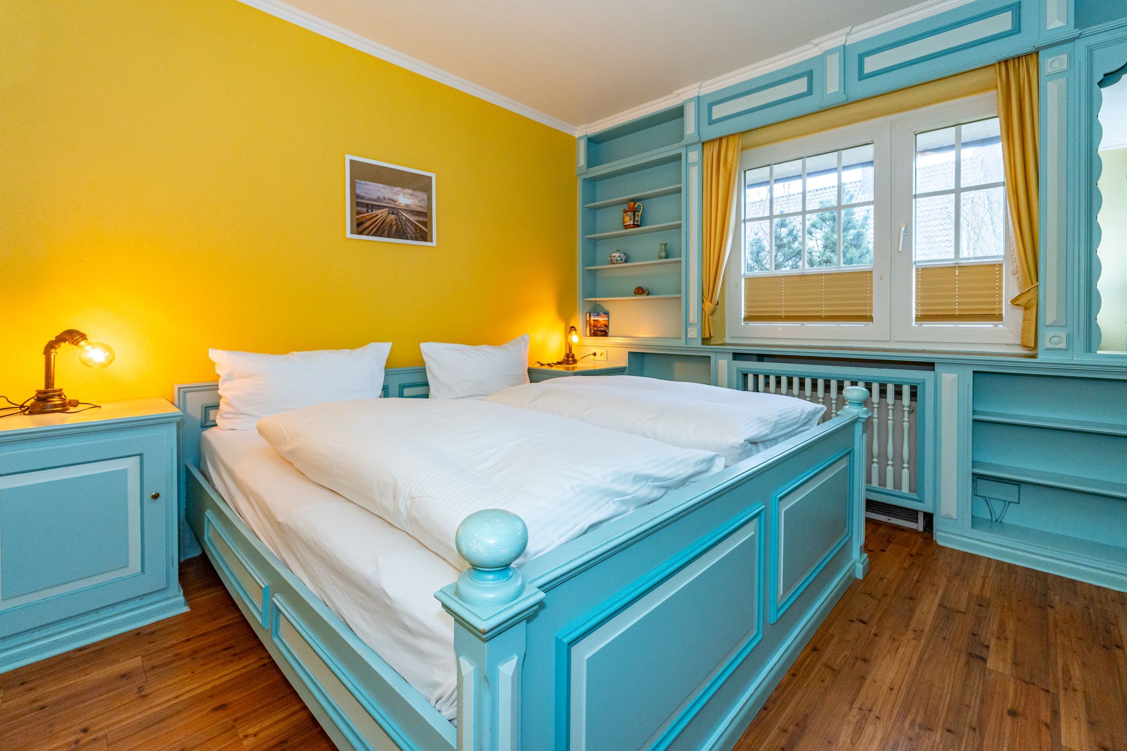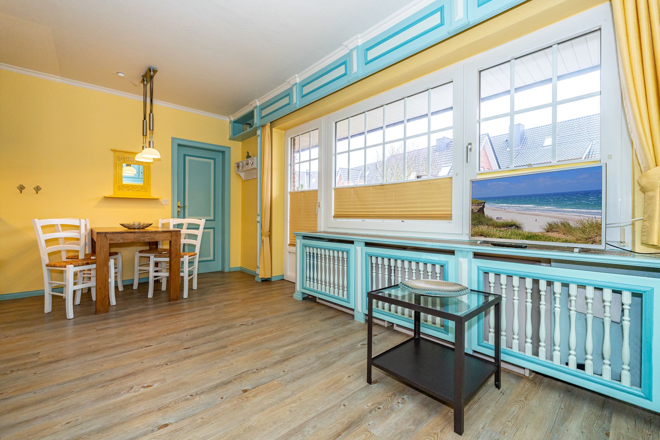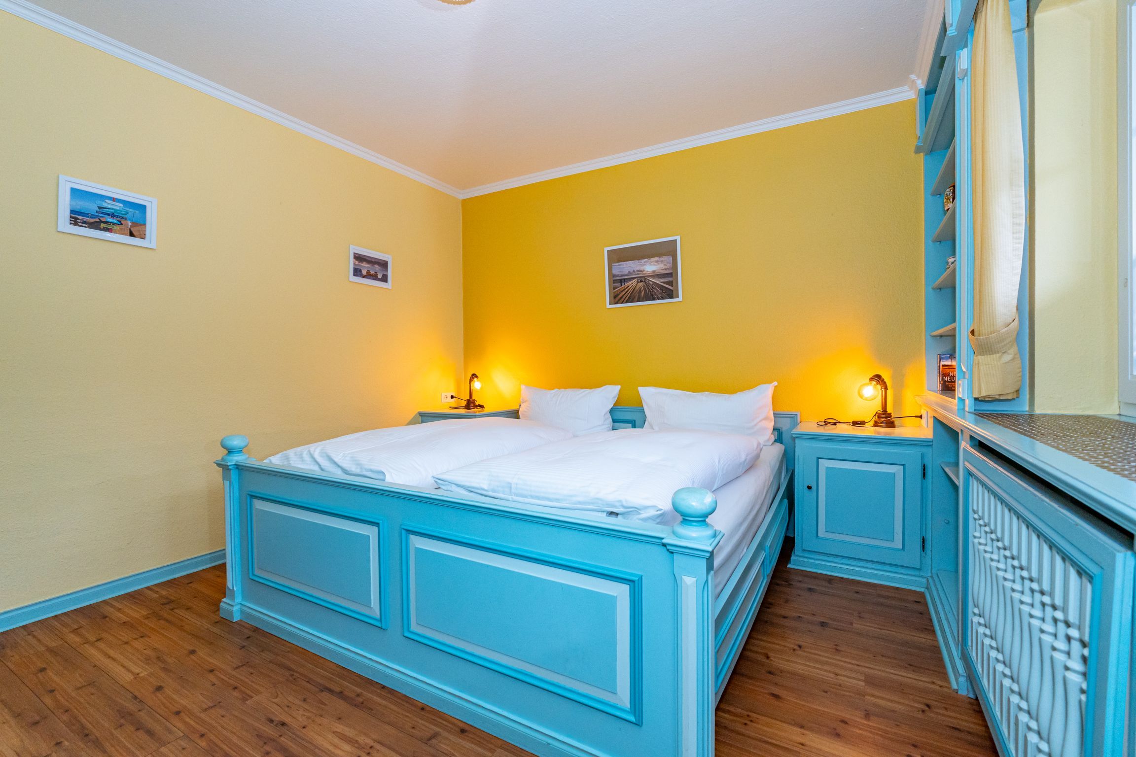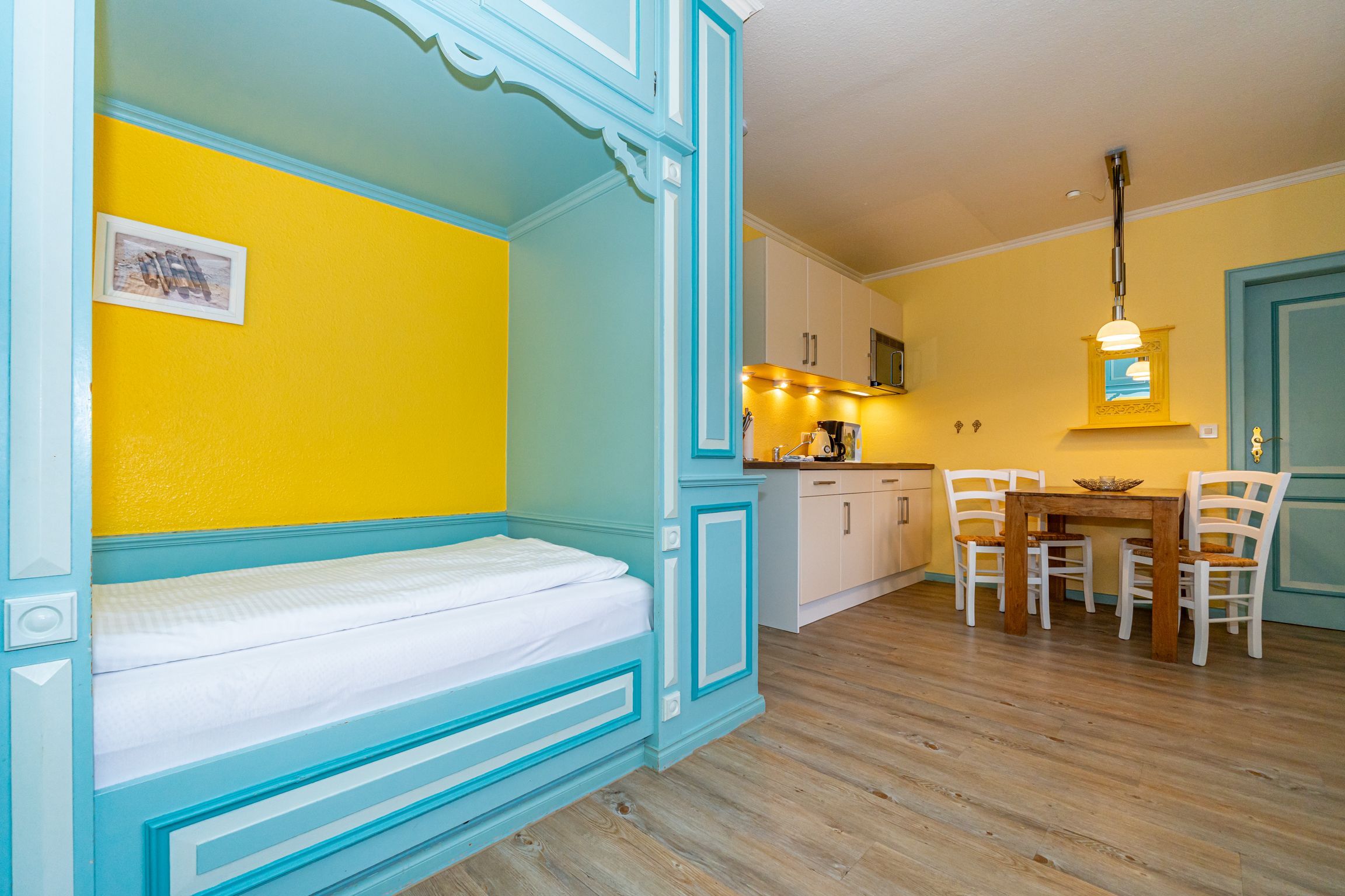 Das zweite Apartment im Erdgeschoss bietet auf 50 Quadratmeter Platz für 4 Personen und verfügt über eine eigene Terrasse. Im offen gestalteten Wohn- und Essbereich befinden sich zwei gemütliche Alkovenbetten. Das abgetrennte Schlafzimmer verfügt über ein Doppelbett. Bequeme Sitzmöglichkeiten sowohl im Innen- als auch im Außenbereich runden das gemütliche Ambiente ab. Das Badezimmer ist ausgestattet mit Dusche, WC und Waschbecken.