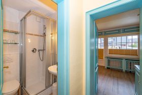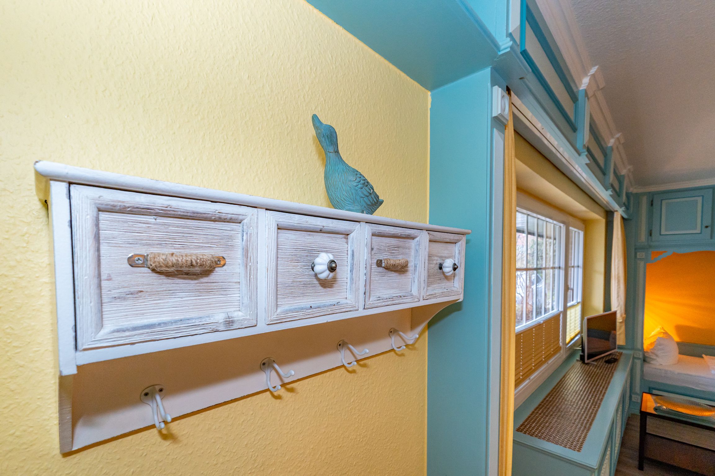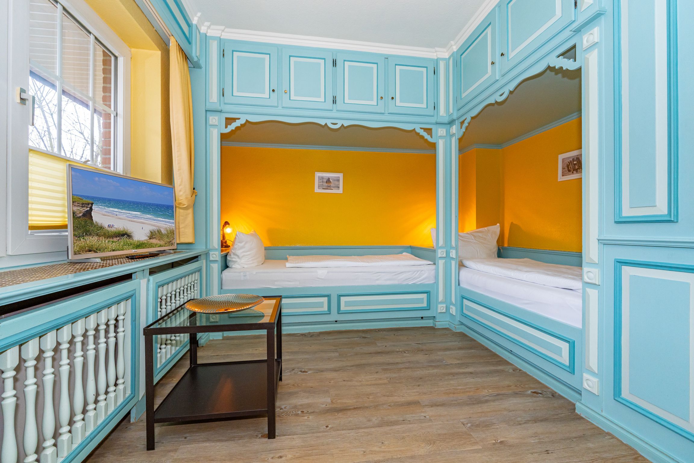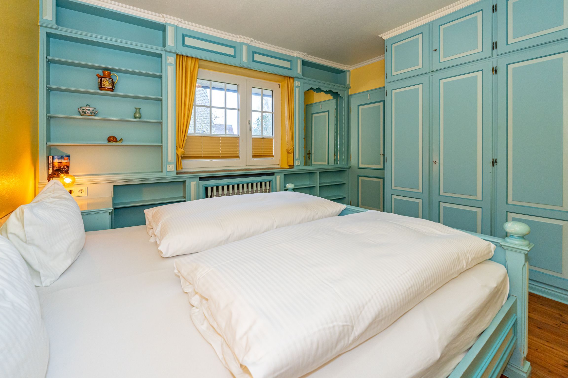 Das zweite Apartment im Erdgeschoss bietet auf 50 Quadratmeter Platz für 4 Personen und verfügt über eine eigene Terrasse. Im offen gestalteten Wohn- und Essbereich befinden sich zwei gemütliche Alkovenbetten. Das abgetrennte Schlafzimmer verfügt über ein Doppelbett. Bequeme Sitzmöglichkeiten sowohl im Innen- als auch im Außenbereich runden das gemütliche Ambiente ab. Das Badezimmer ist ausgestattet mit Dusche, WC und Waschbecken.