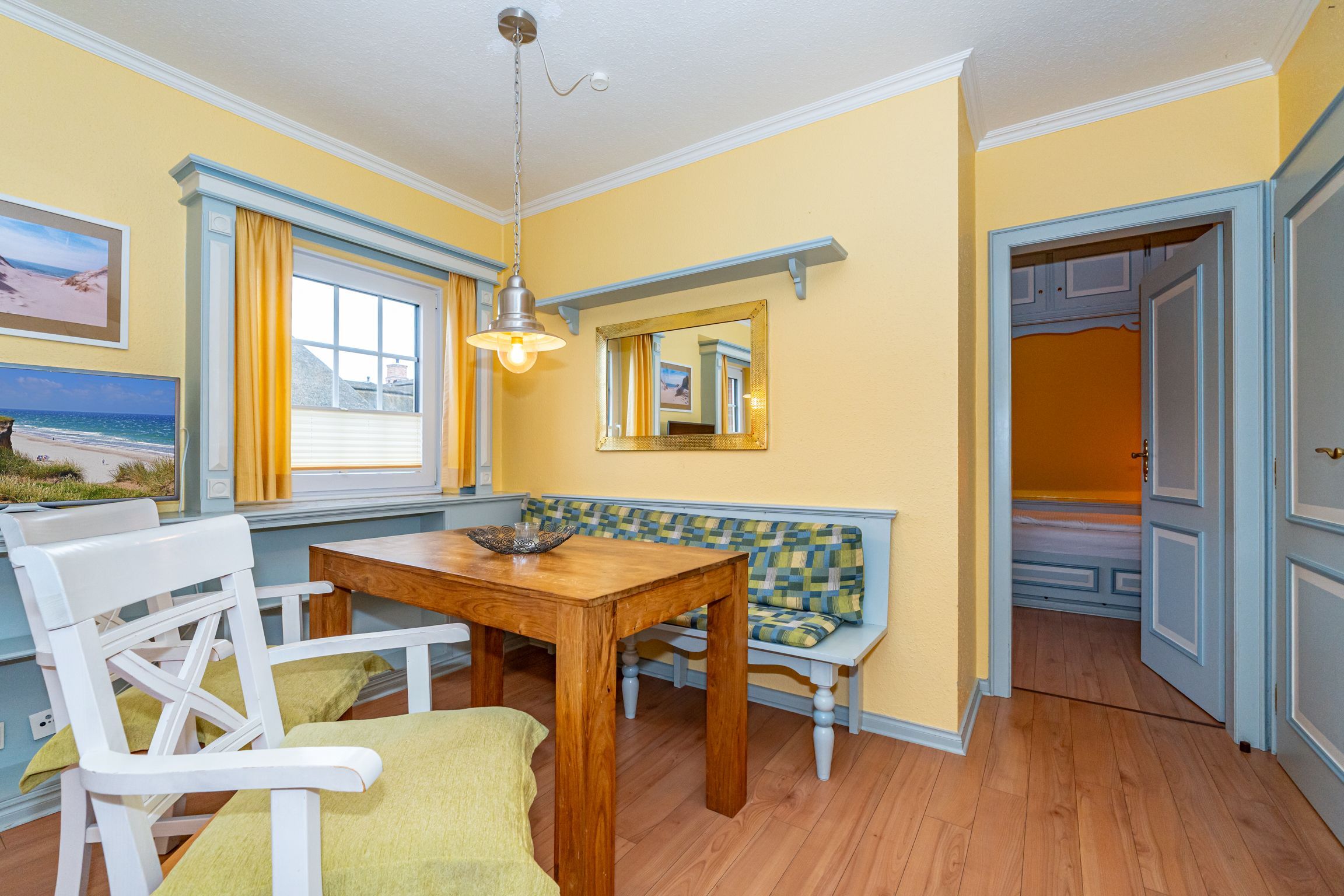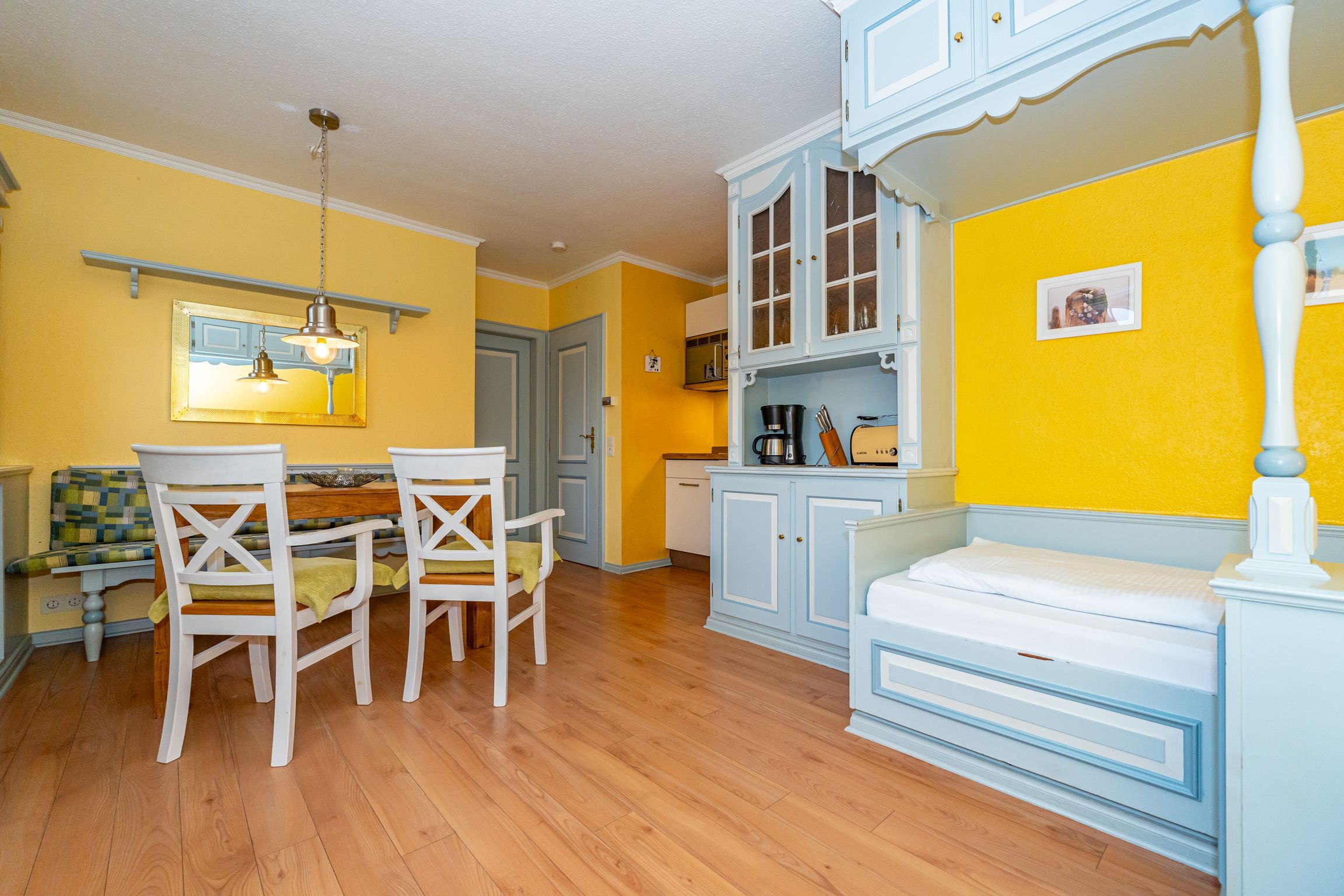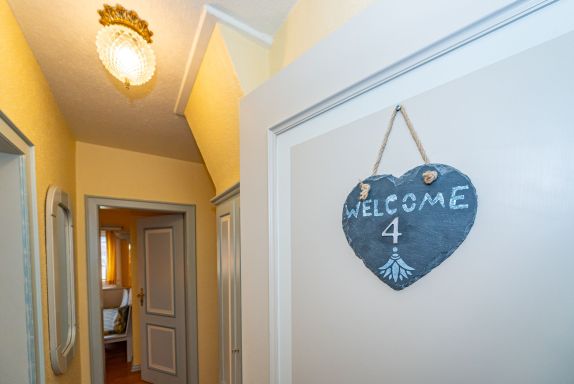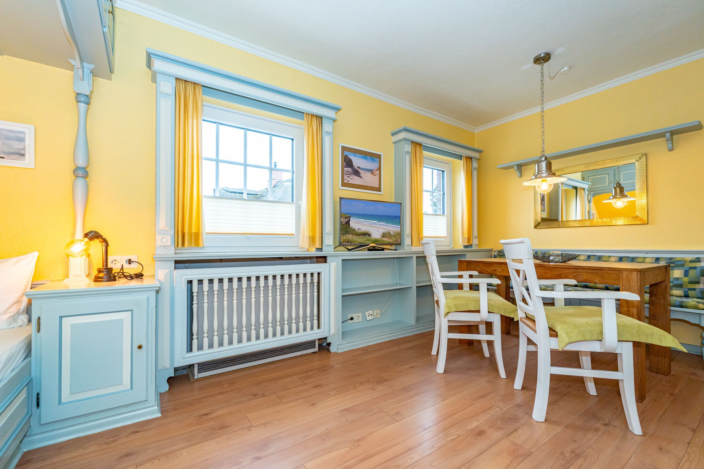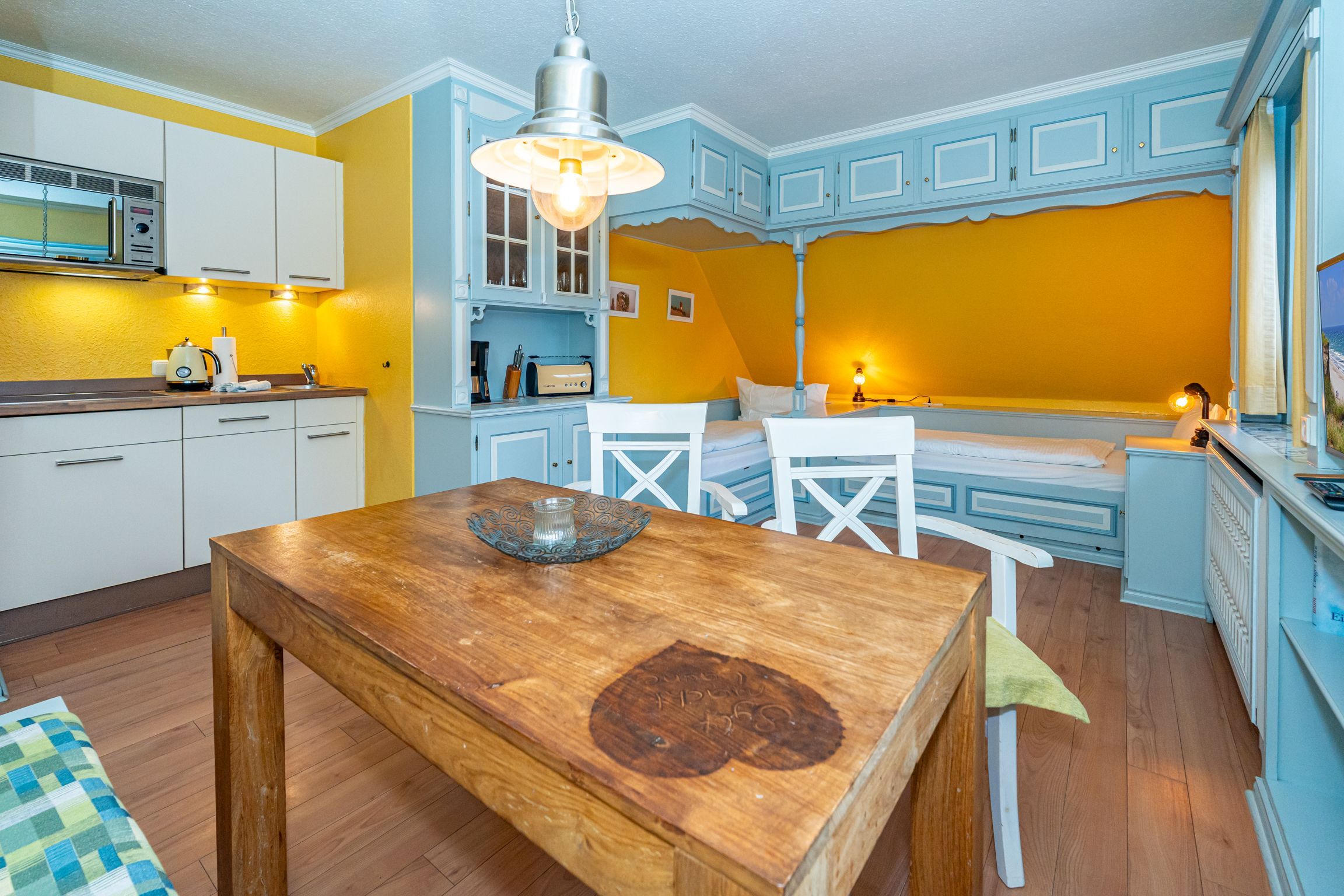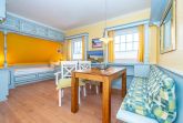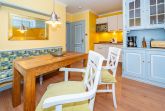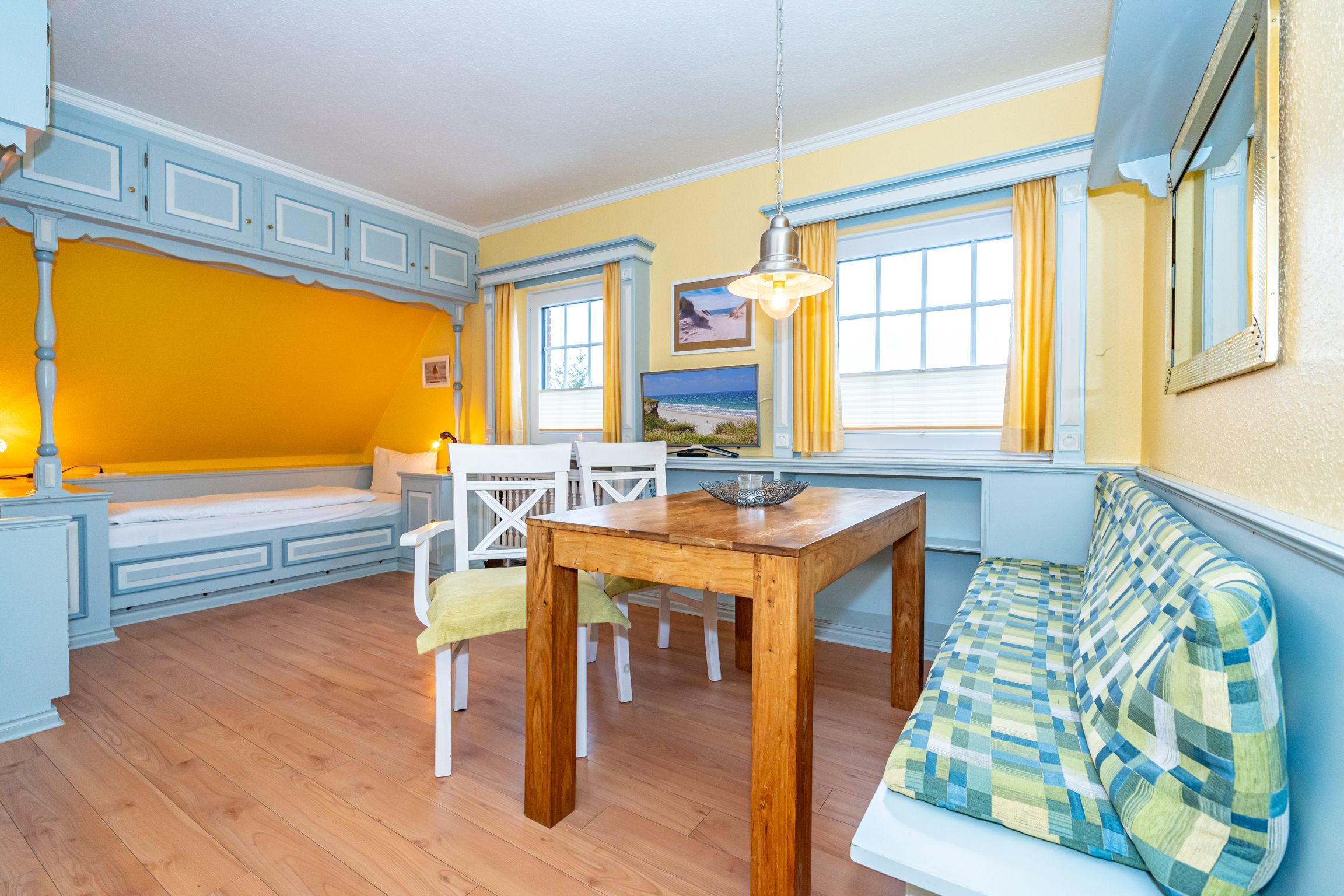 Im 1. Obergeschoss befindet sich das vierte Apartment. Der Wohn- und Essbereich mit 2 Schlafkojen sowie das separate Schlafzimmer mit 2 Schlafkojen bieten auf insgesamt 50 Quadratmeter Platz für 4 Personen. Das Badezimmer ist ausgestattet mit Dusche, WC und Waschbecken.