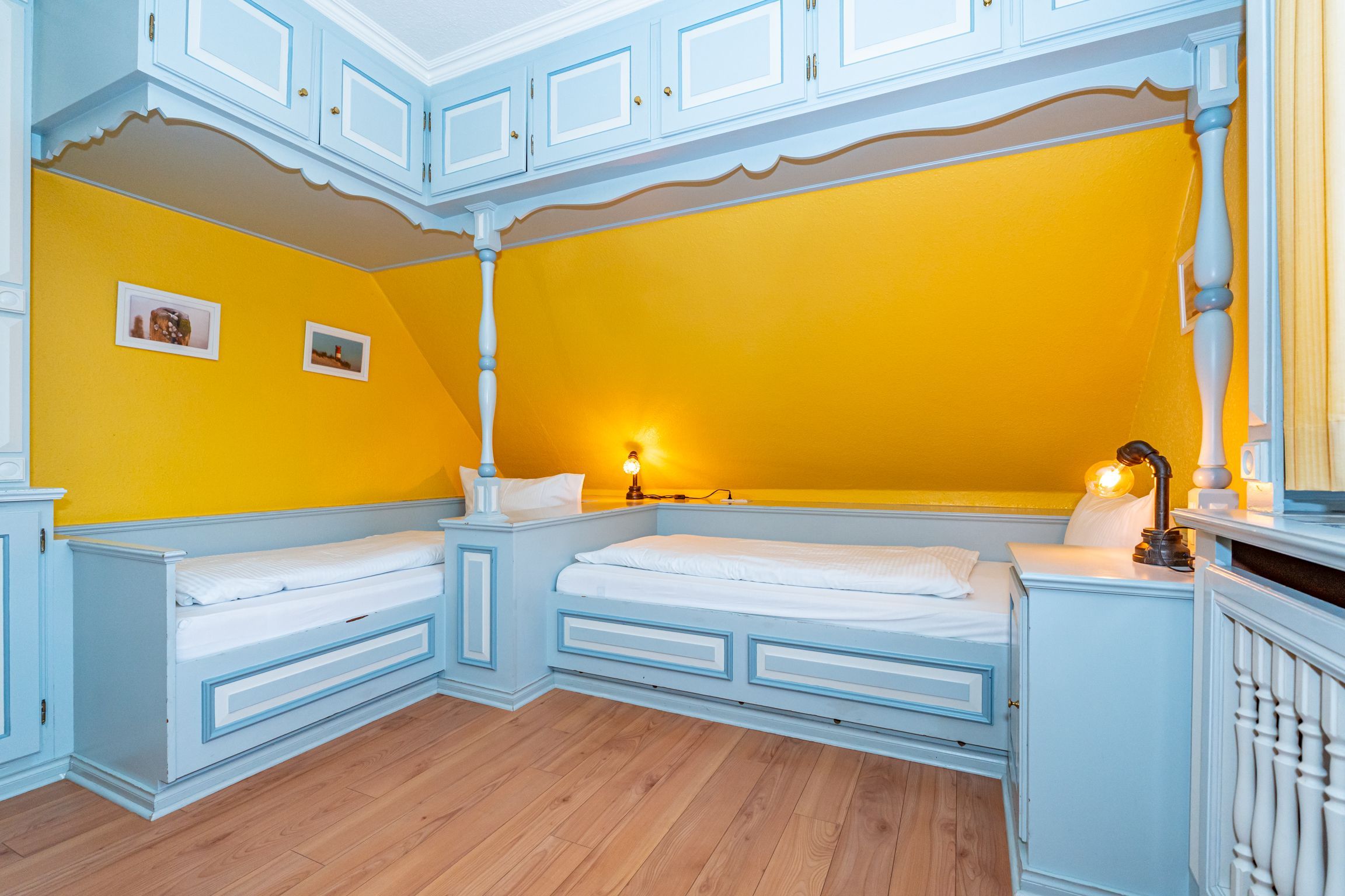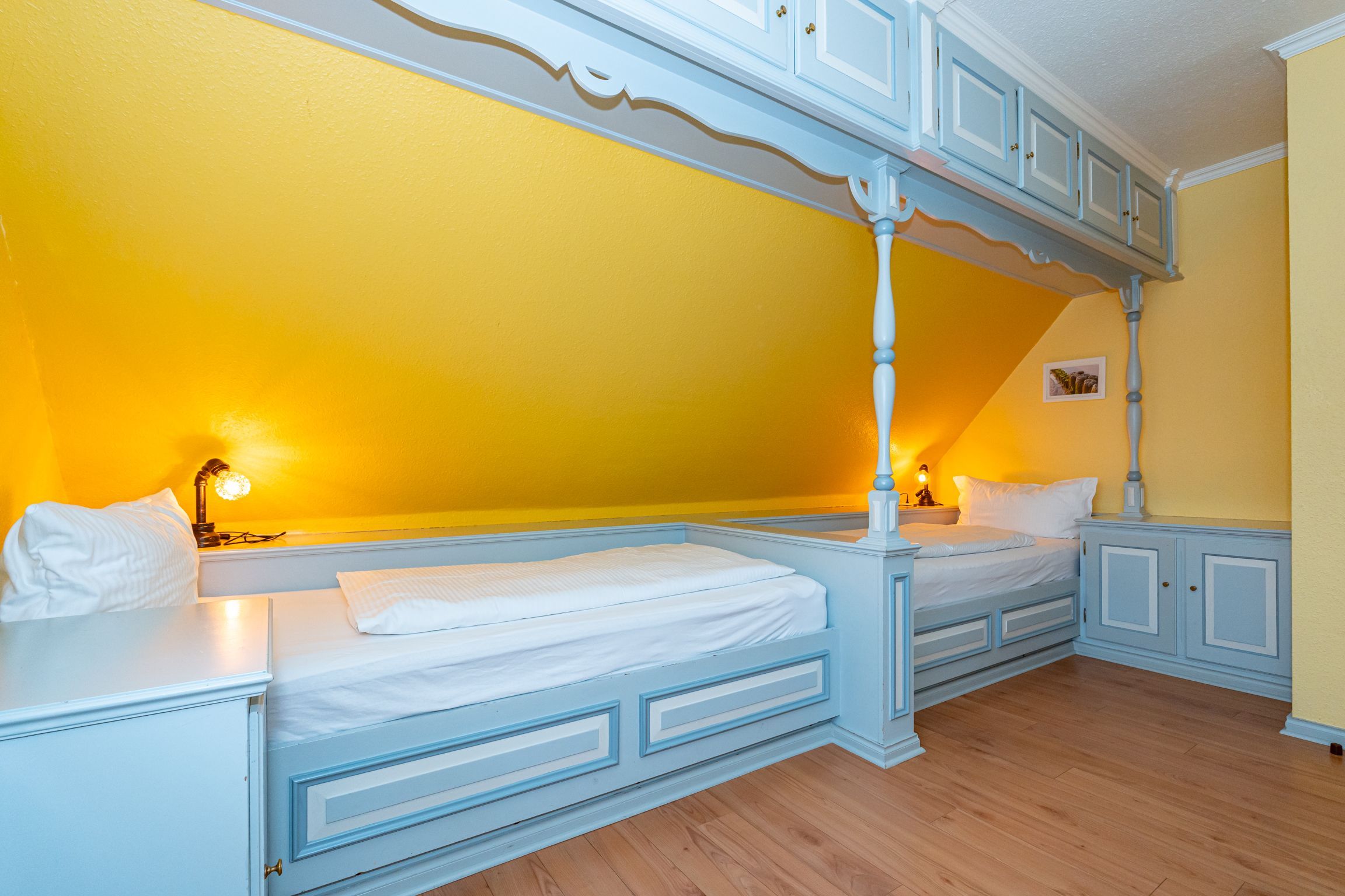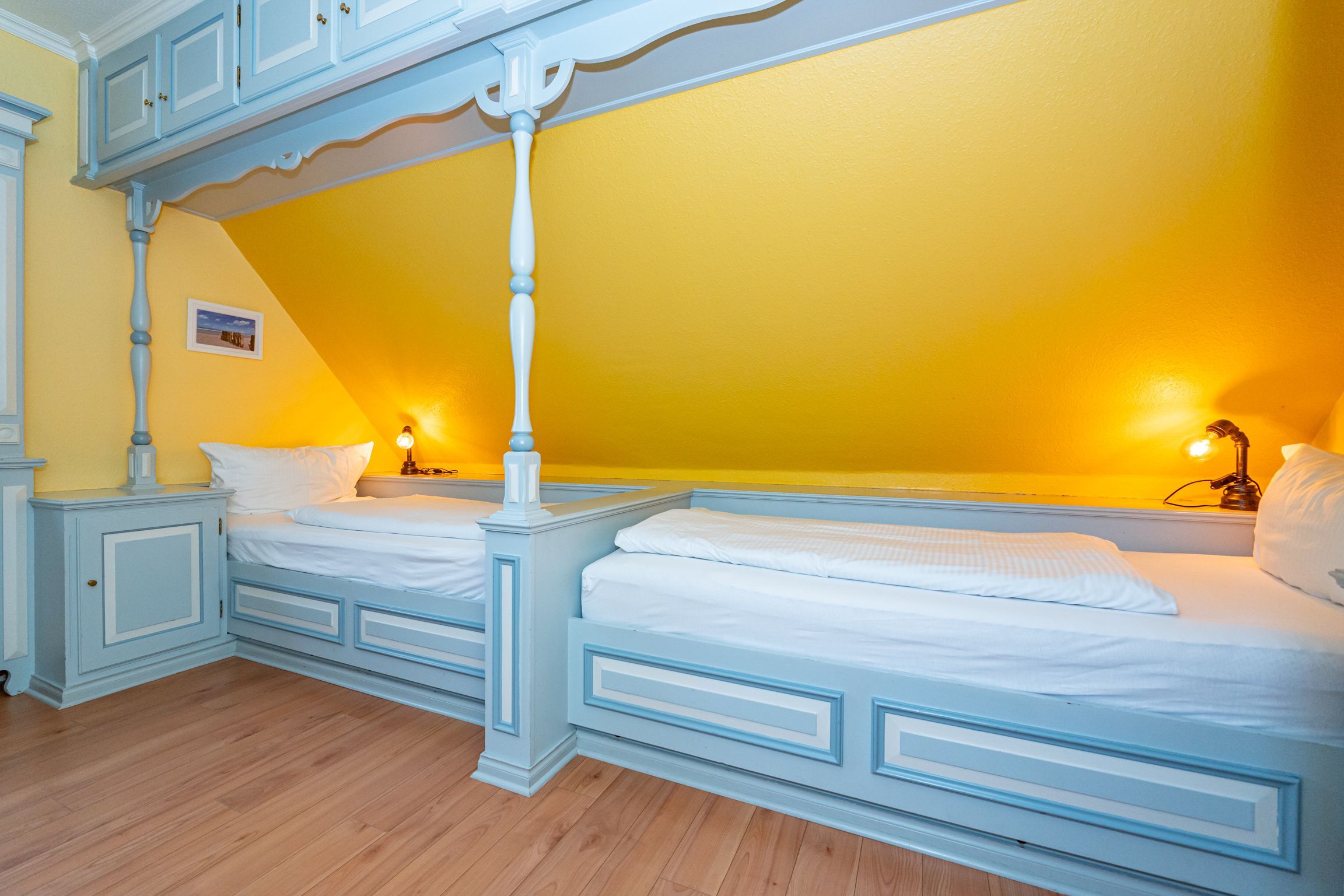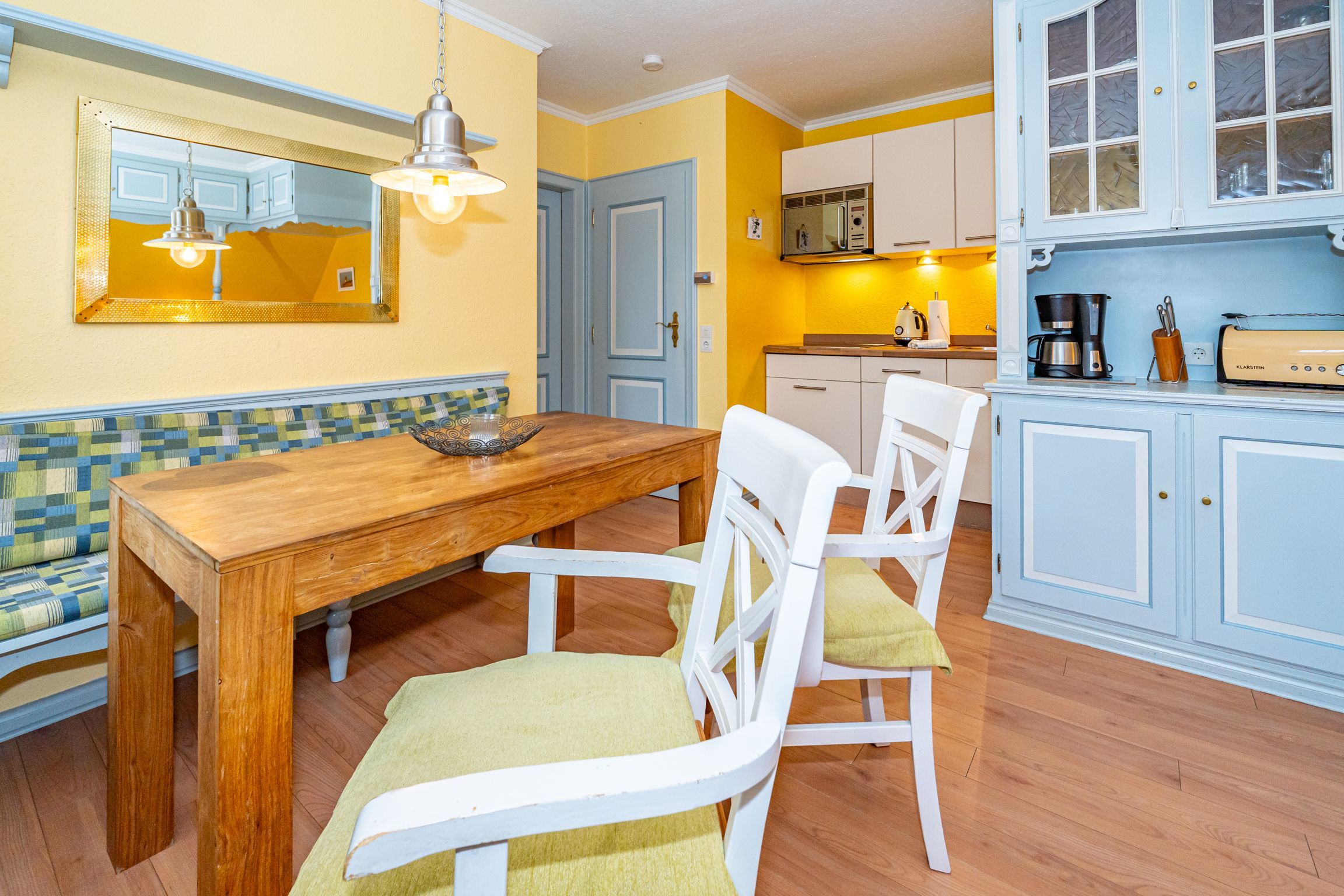 Im 1. Obergeschoss befindet sich das vierte Apartment. Der Wohn- und Essbereich mit 2 Schlafkojen sowie das separate Schlafzimmer mit 2 Schlafkojen bieten auf insgesamt 50 Quadratmeter Platz für 4 Personen. Das Badezimmer ist ausgestattet mit Dusche, WC und Waschbecken.