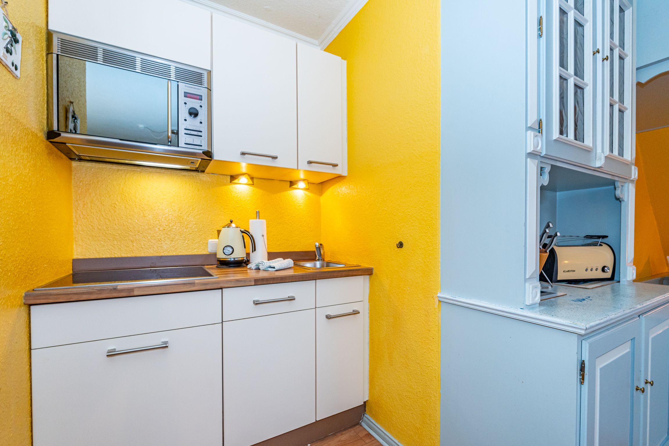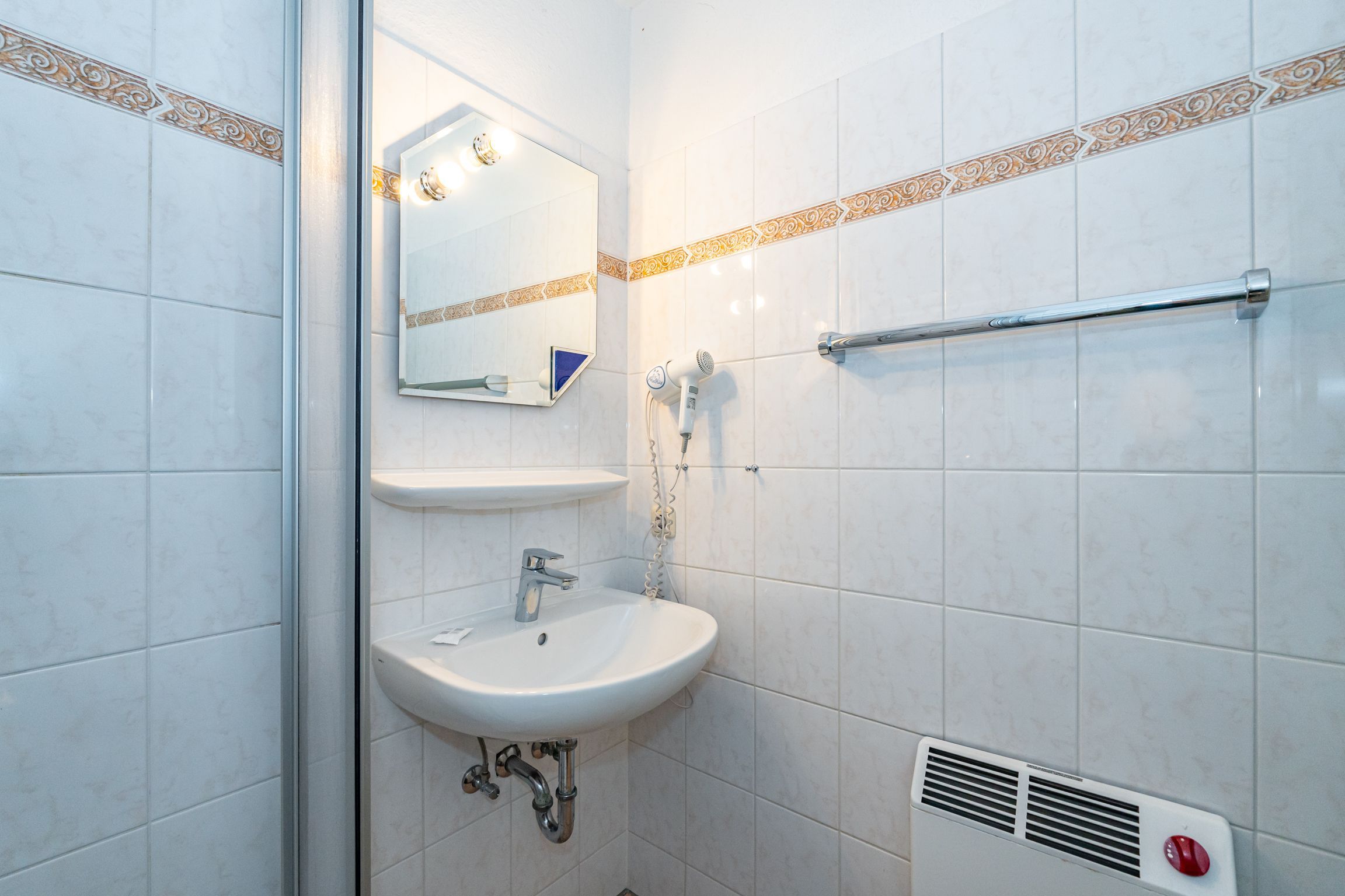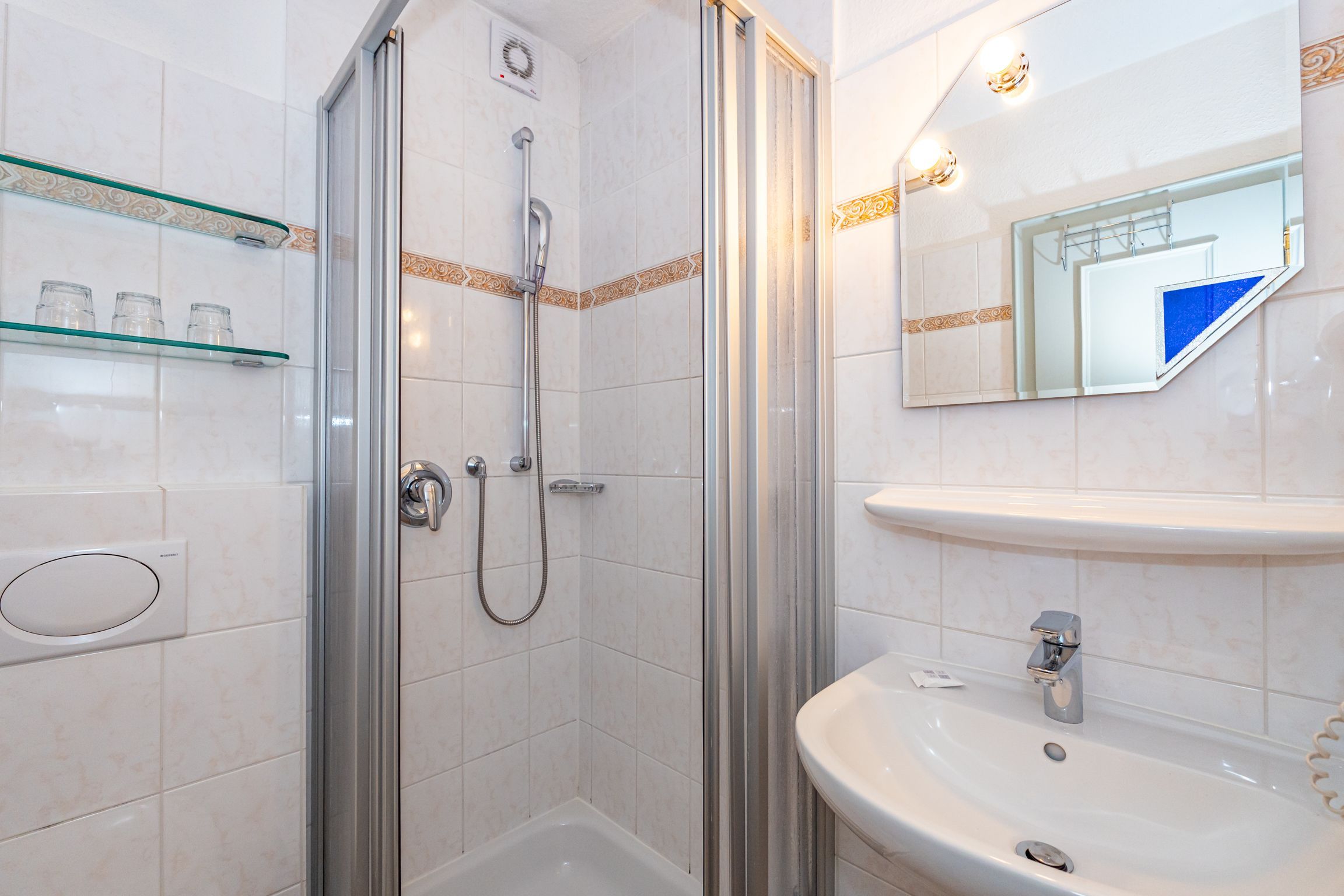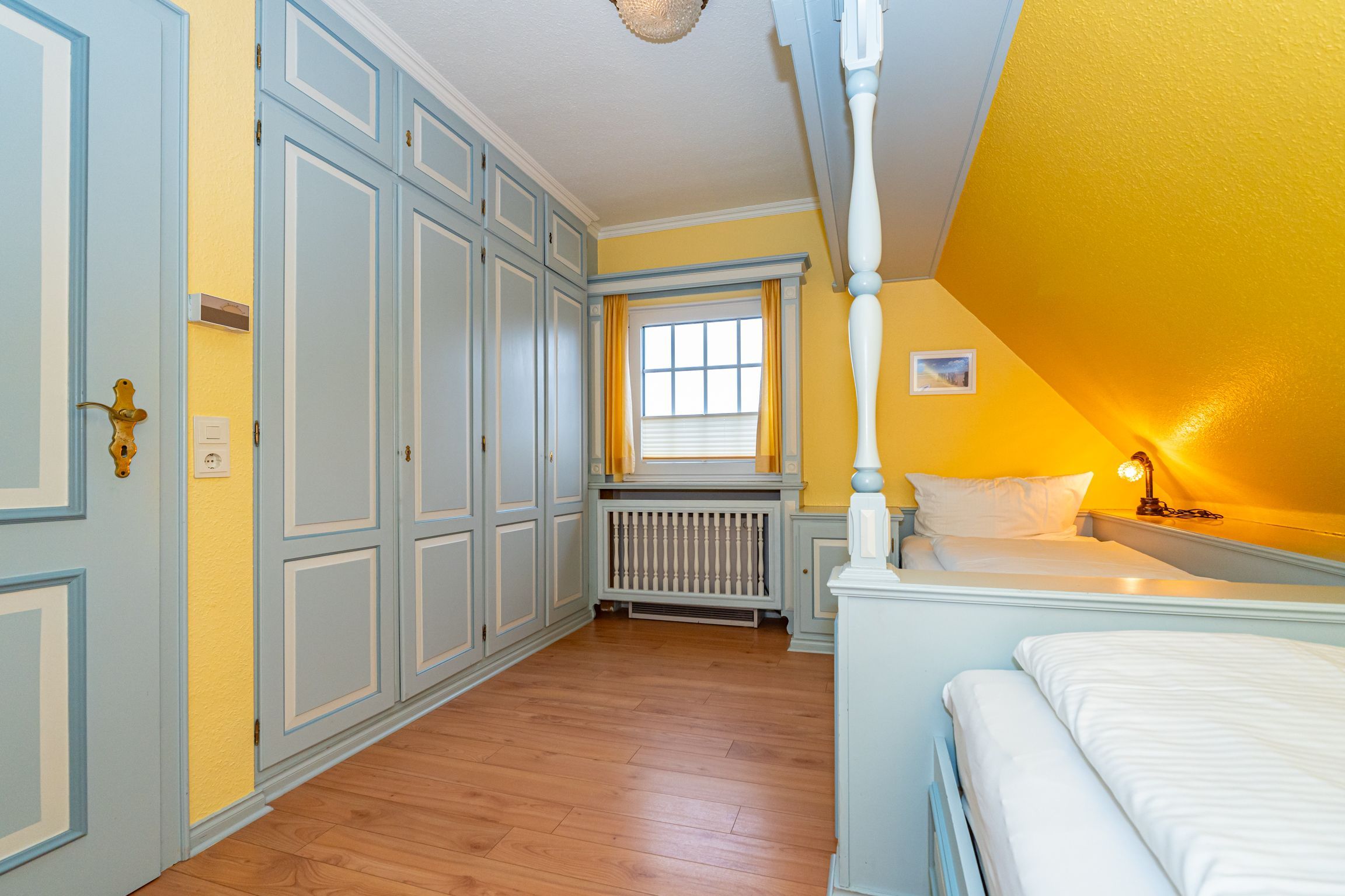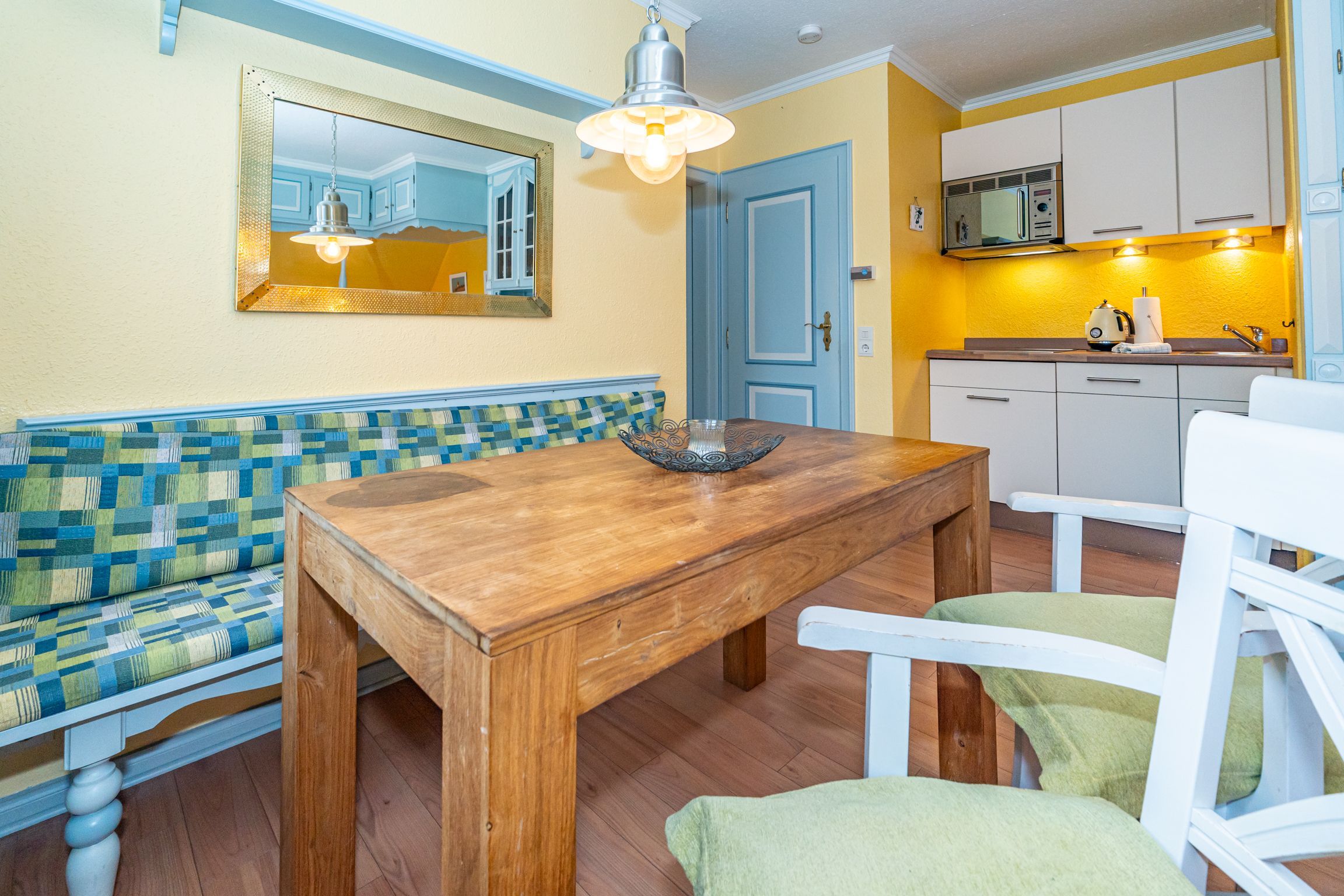 Im 1. Obergeschoss befindet sich das vierte Apartment. Der Wohn- und Essbereich mit 2 Schlafkojen sowie das separate Schlafzimmer mit 2 Schlafkojen bieten auf insgesamt 50 Quadratmeter Platz für 4 Personen. Das Badezimmer ist ausgestattet mit Dusche, WC und Waschbecken.
