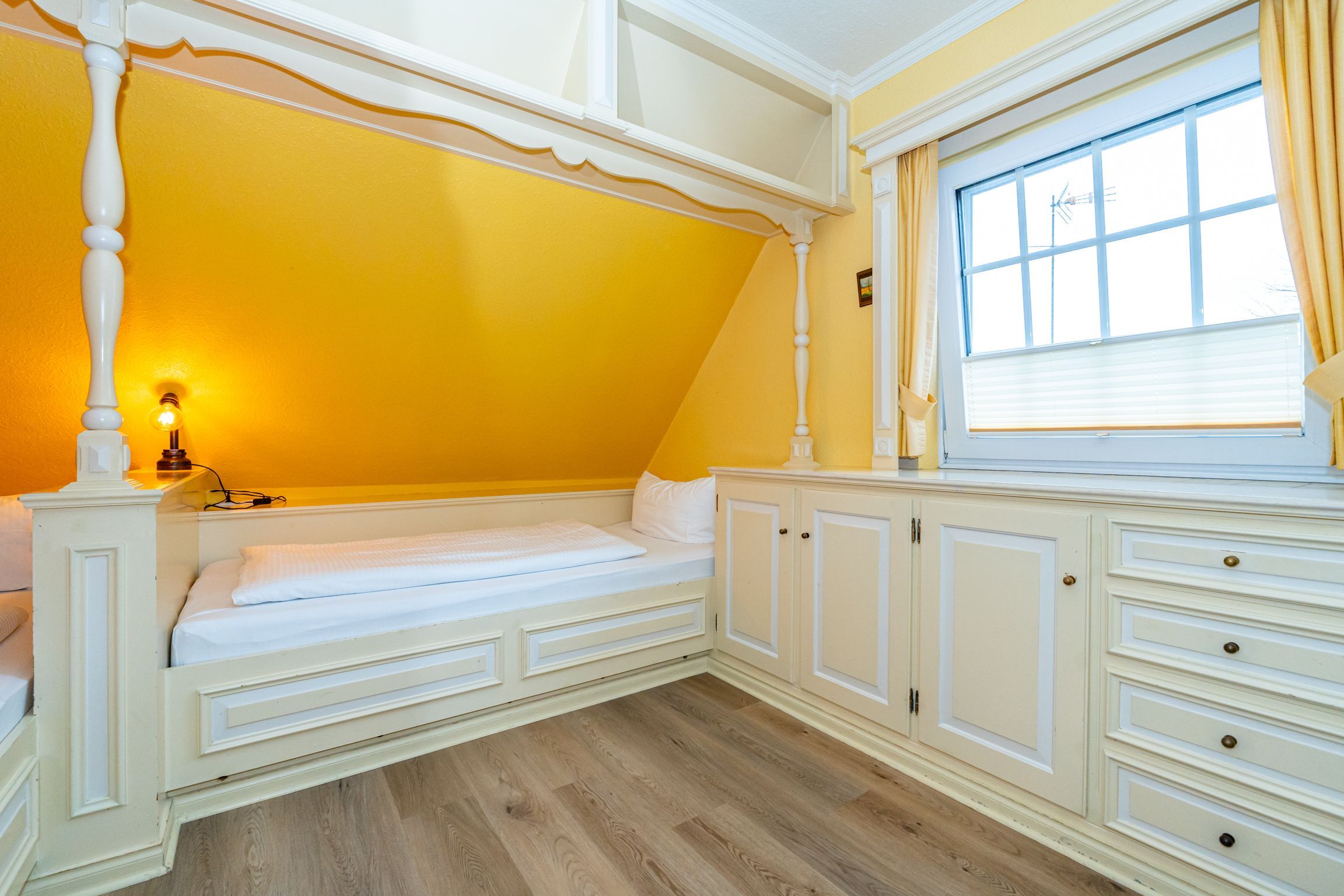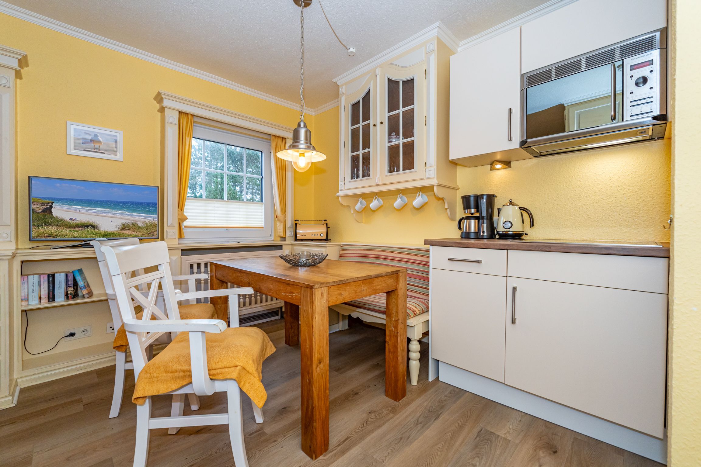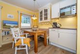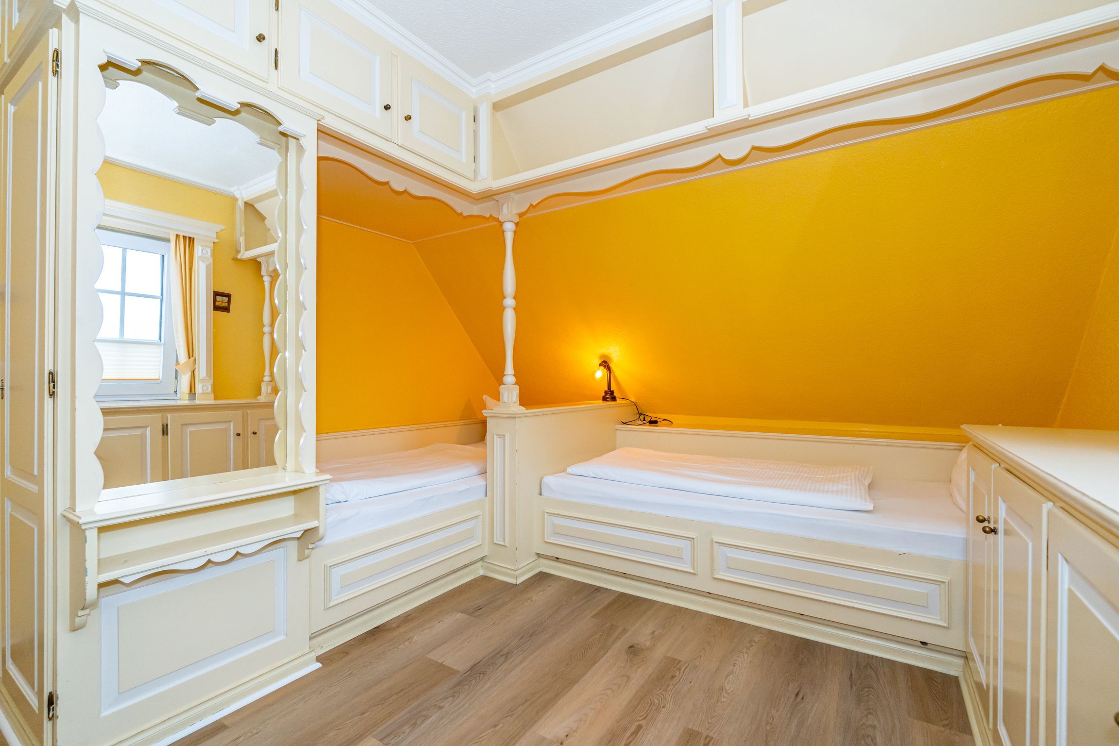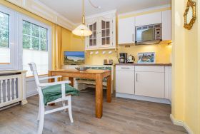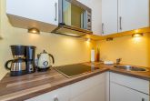 Das Apartment mit der Nummer sechs ist im 1. Obergeschoss zu finden und bietet auf 30 Quadratmeter Platz für 2 Personen. Im offen gestalteten Wohn- und Essbereich stehen 2 gemütliche Alkovenbetten. Das Bad ist ausgestattet mit Dusche, WC und Waschbecken.