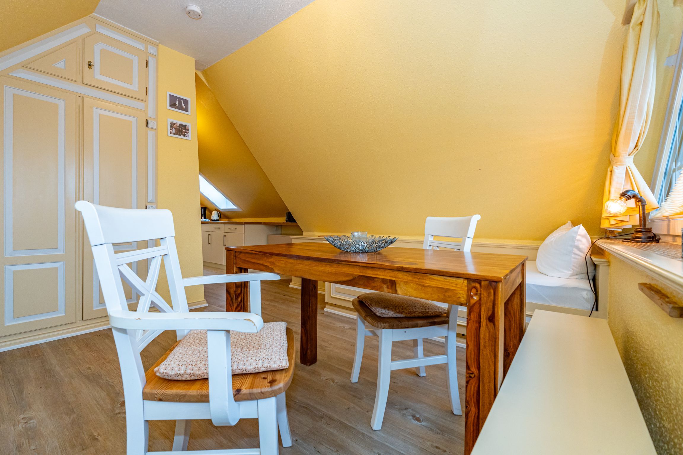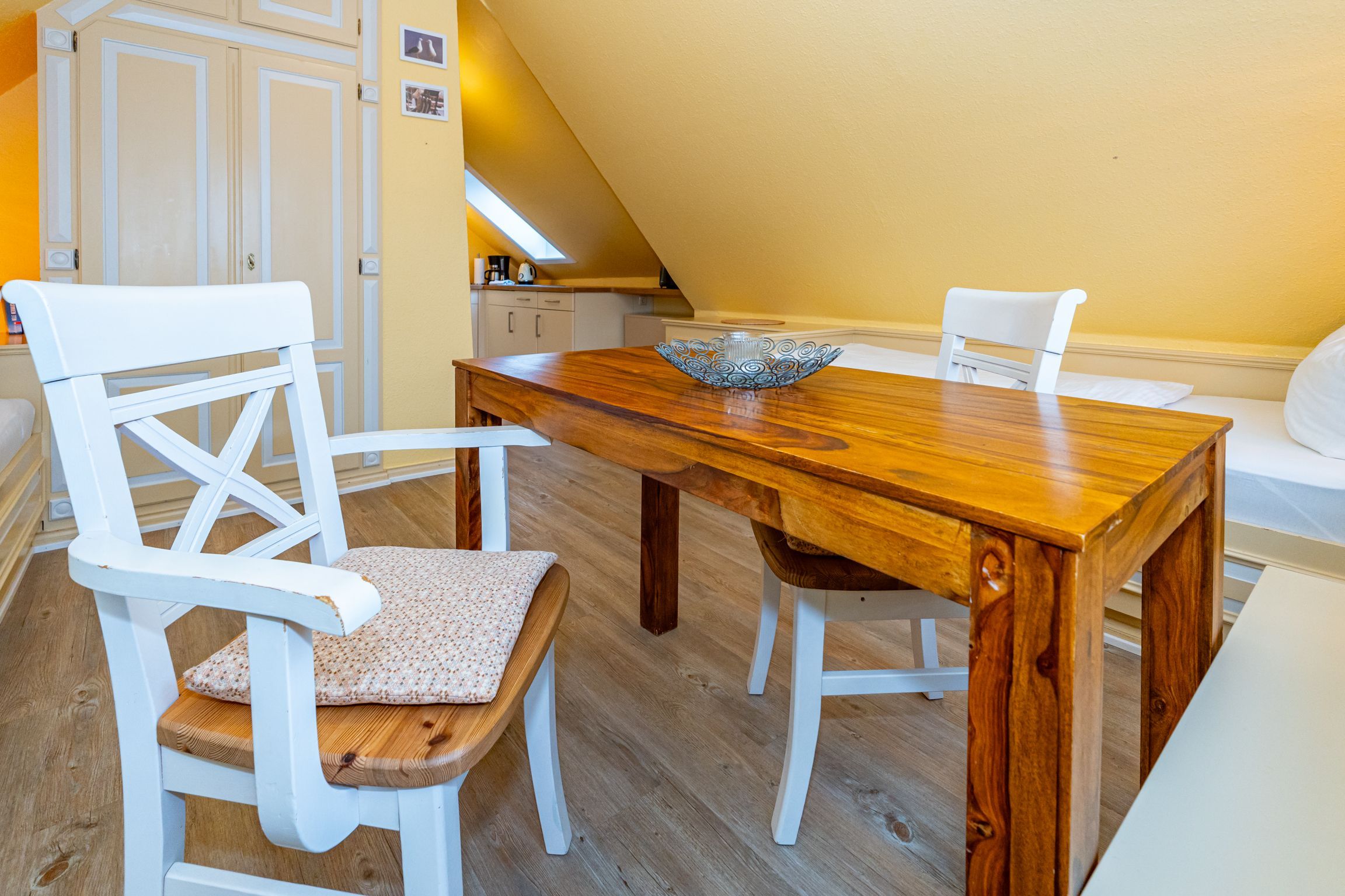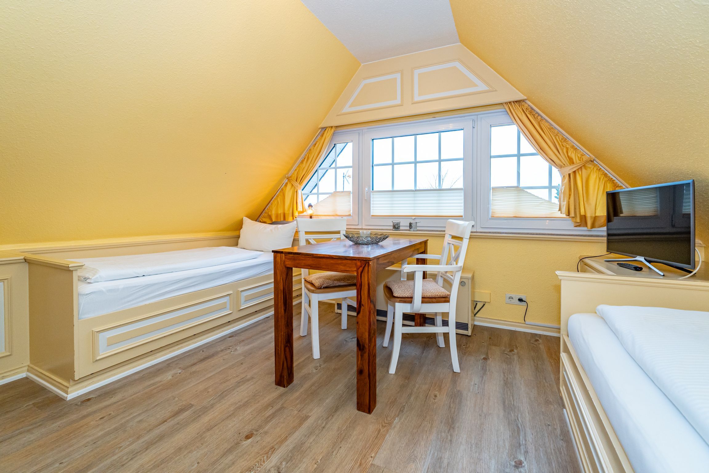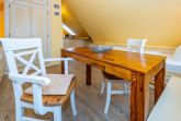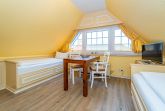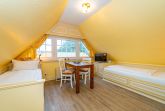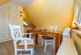 Im Giebel des 2. Obergeschosses liegt das achte Apartment. Die in edlen Cremetönen eingerichteten 30 Quadratmeter bieten Platz für 2 Personen. Der offen gestaltete Wohn- und Essbereich verfügt über 2 Einzelbetten und Sitzmöglichkeiten. Das Bad ist ausgestattet mit Dusche, WC und Waschbecken.
