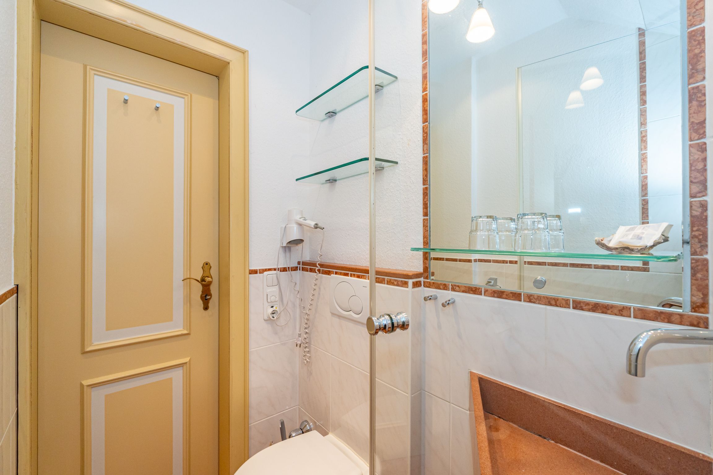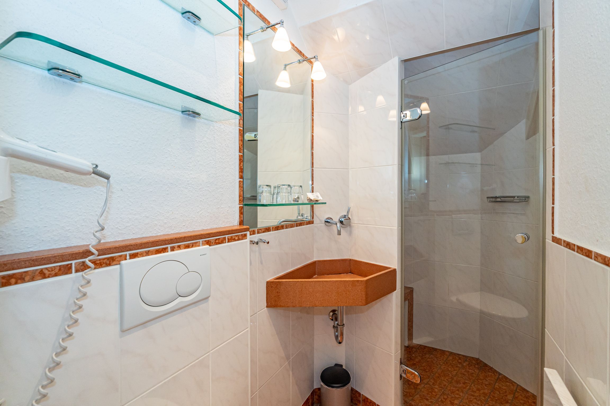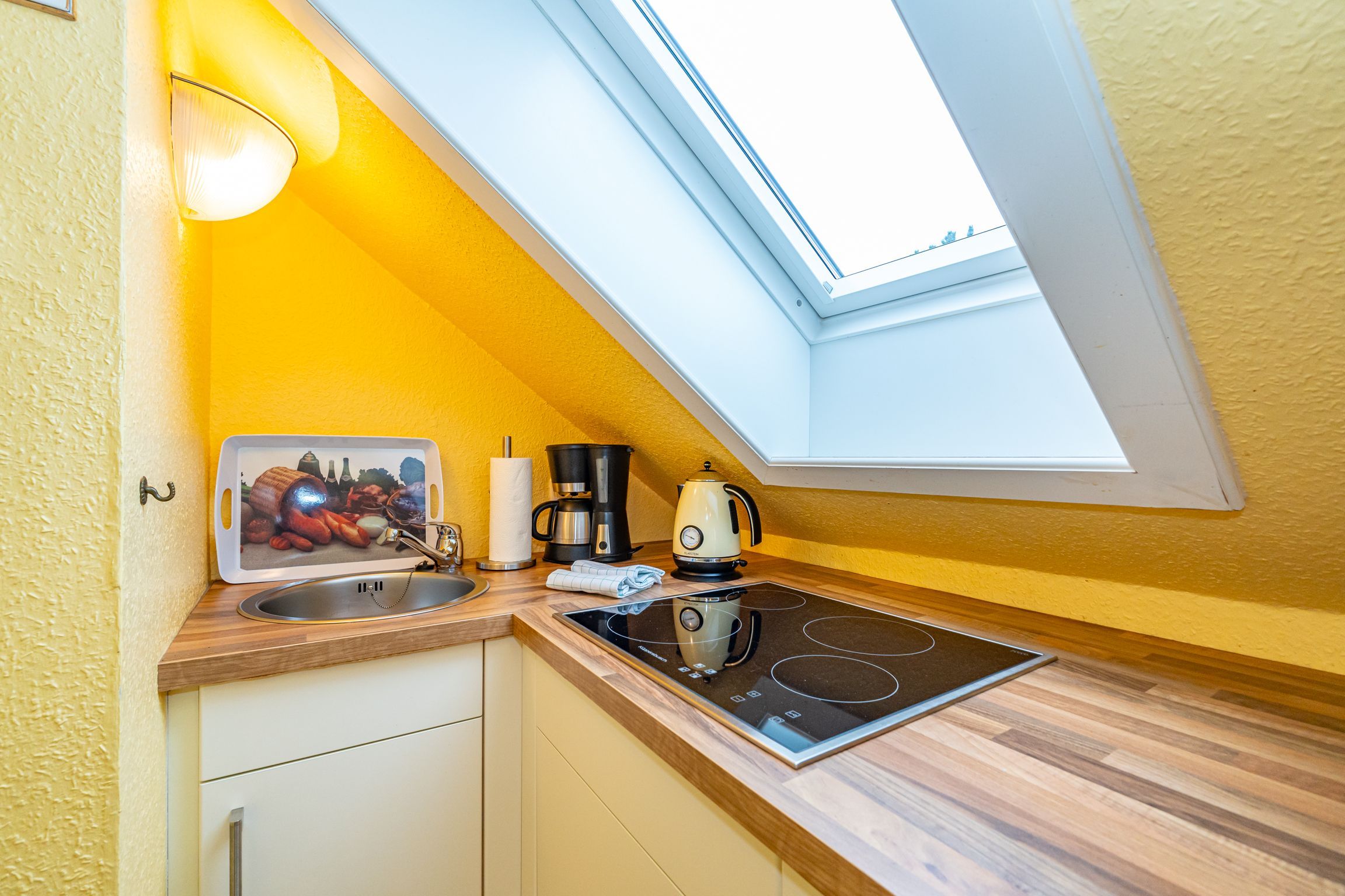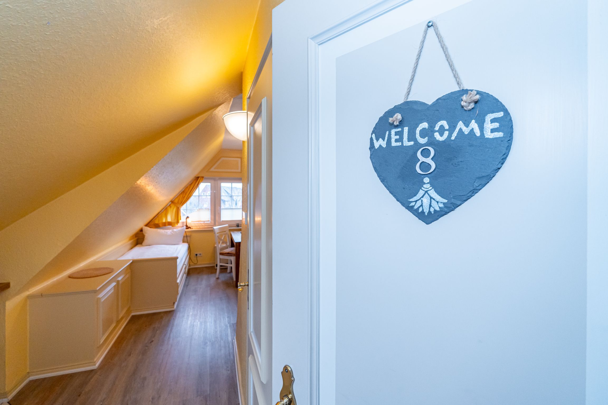 Im Giebel des 2. Obergeschosses liegt das achte Apartment. Die in edlen Cremetönen eingerichteten 30 Quadratmeter bieten Platz für 2 Personen. Der offen gestaltete Wohn- und Essbereich verfügt über 2 Einzelbetten und Sitzmöglichkeiten. Das Bad ist ausgestattet mit Dusche, WC und Waschbecken.